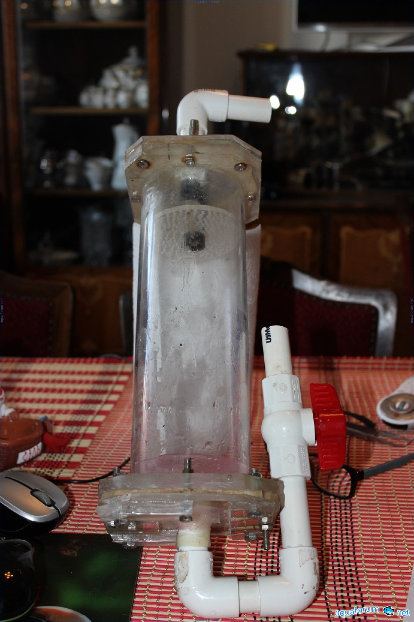 Das Aquarium und der Sumpf auf einer Ebene. Der Algenfilter war von der Vorderseite geplant. Der Anblick des grünen Drahts wurde langweilig, und es wurde beschlossen, den Algenfilter als kleines Display zu gestalten. Ich habe schöne Meerespflanzen gekauft, vielleicht schaue ich noch nach etwas anderem. Um Phosphat und Nitrat zu entfernen, wurde beschlossen, einen Biopelletreaktor zu bauen. Ich habe bei den Werbefirmen 90 mm Rohrstücke gekauft, Flansche dafür hergestellt und sie eingeklebt. Dann habe ich zwei Deckel, einen oberen und einen unteren mit einem Kegel, hergestellt. Und das ist alles zusammengebaut.