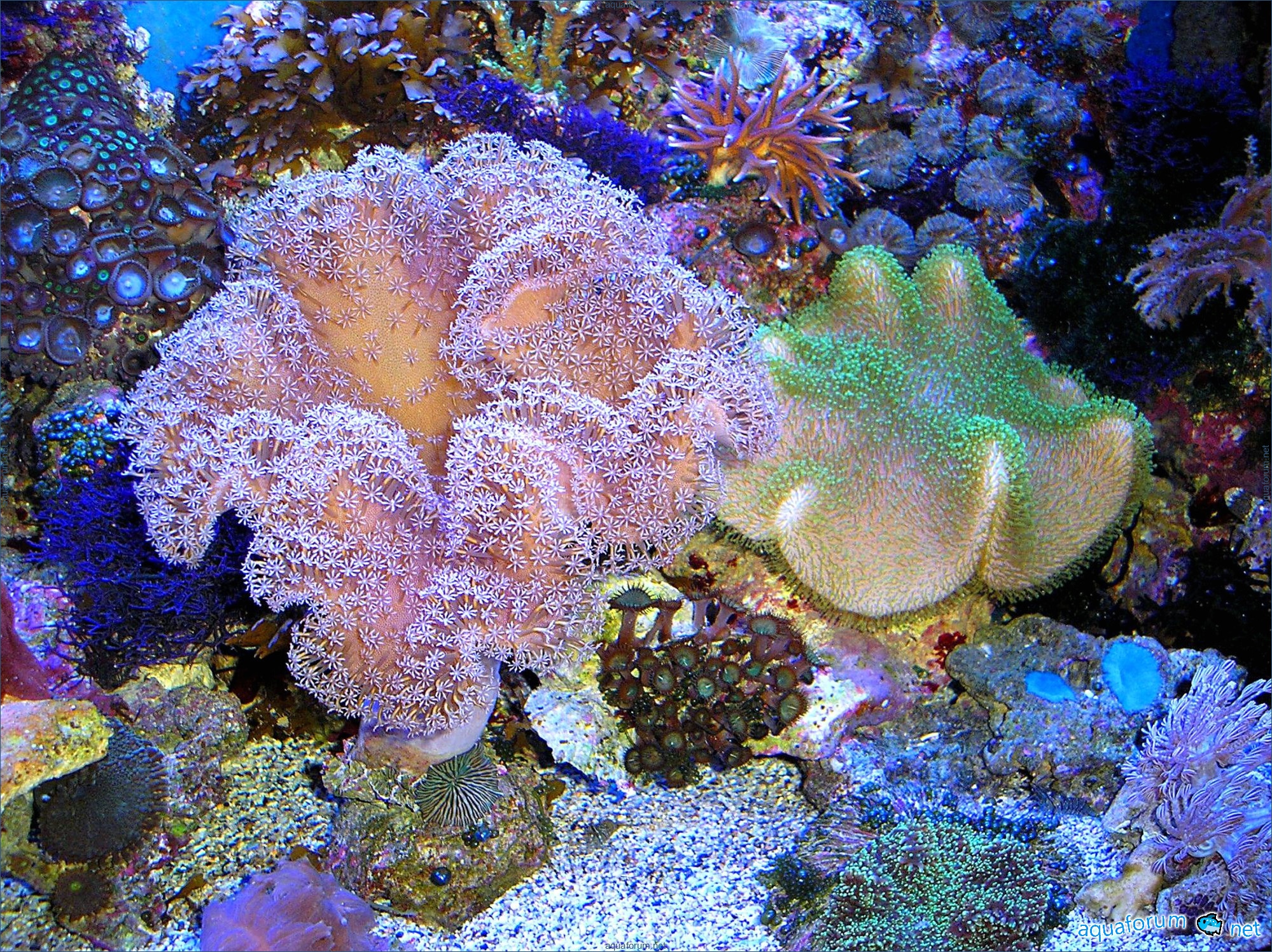 In deeper aquariums, where the depth exceeds 70 cm, "spot" lighting may be necessary for some soft corals. However, in my opinion, for our average dimensions of 170x60x60 cm, six 80W T-5 bulbs are quite sufficient, and if eight are needed, there is no need for "spot" lighting, as there can even be an excess, and it may be necessary to reduce the number of lamps from eight to six, since many soft corals, particularly sarcophytons and discoactinies, tend to retreat into the rocks. Here are a couple of photos showing sarcophytons under six T-5 lamps in a 60 cm deep aquarium (I believe their condition is excellent, so why do they need spot lighting?).