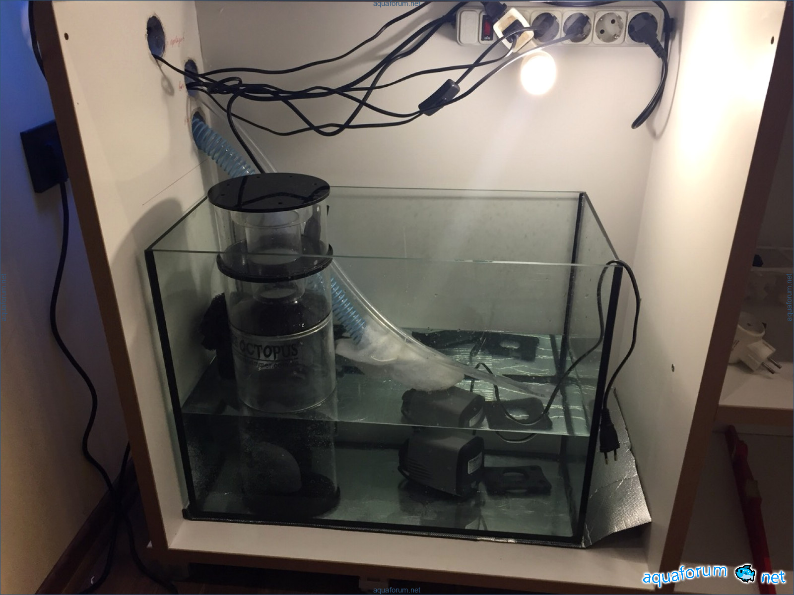 The total water volume in the aquarium is 37 liters, leaving 35 as a reserve - just as required. It's a pity that there's no reserve, but for now, I've assumed that the skimmer should be submerged 25-30 cm in water; as for the actual depth - who knows... there were no instructions for it.