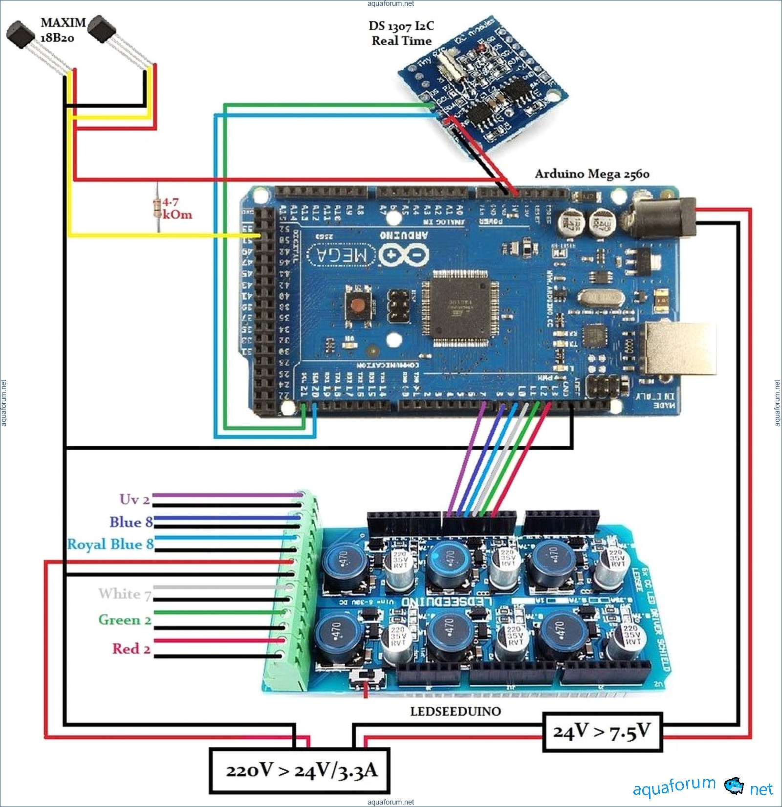 I want to make a 4-channel LED light based on Arduino. It should have dawn-dusk simulation, a temperature sensor, touch control, and 2 coolers that turn on/off with temperature changes. I assume I need: 1. Arduino R3 ($14) 2. Arduino TFT LCD Screen + Touch Screen ($8) 3. Arduino Real Time Clock Module ($2) 4. Temperature sensor ($2) 5. Bluetooth module (for control from Android, not sure if it's necessary) 6. 4-5 drivers (no idea which ones and their prices) maybe someone can suggest, preferably from AliExpress. 6. Power supply 12-24V 7. LEDs: - Cree Royal blue XT-E 5W 450-452nm 10 pcs ($18) - Cree Cold white XT-E 5W 6500-7000K 10 pcs ($15.3) - Cree Blue XP-E 3W 465-485nm 10 pcs ($12.49) - Cree MC-E RGBW 2 pcs ($13.5) - UV 2 pcs (will order later) 8. Heat sink (I will look for a wide and thin one up to 2cm to fit the cover) 9. Consumables That's all for now. I have only ordered the LEDs, I'm unsure about the rest. I need help from experts and pros in this field. Did I select the components correctly, is there anything missing, or something unnecessary? Which drivers should I use? Thank you all for your attention and help!