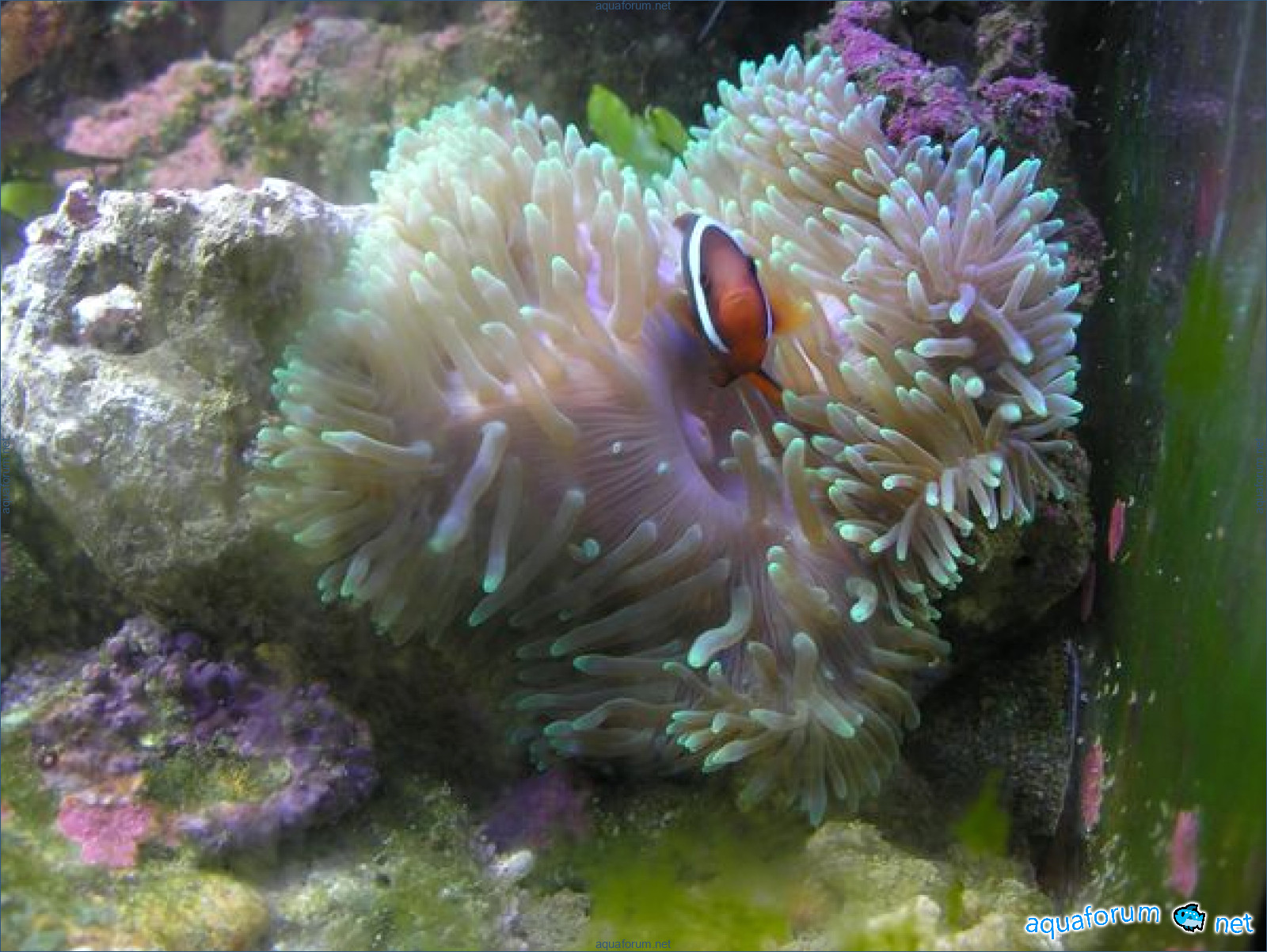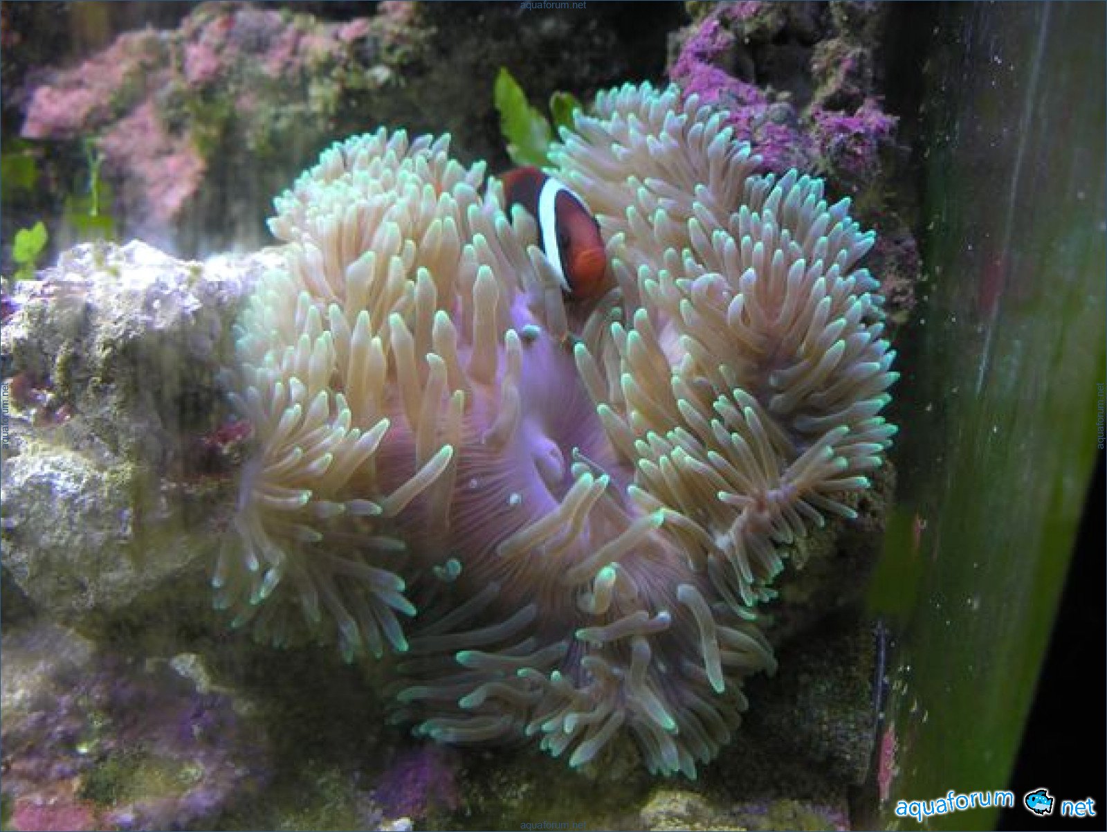Anemones are mysterious animals, described as very complex in care, but in my mini-nemo, they live without problems, and vice versa. I have one carpet anemone and another green Heteractis. They love light; my aquarium is small and located by the window, so there is enough light during the day. They feel better near the window than just under lamp lighting. Your anemone looks like some kind of Heteractis, but it's hard to see.