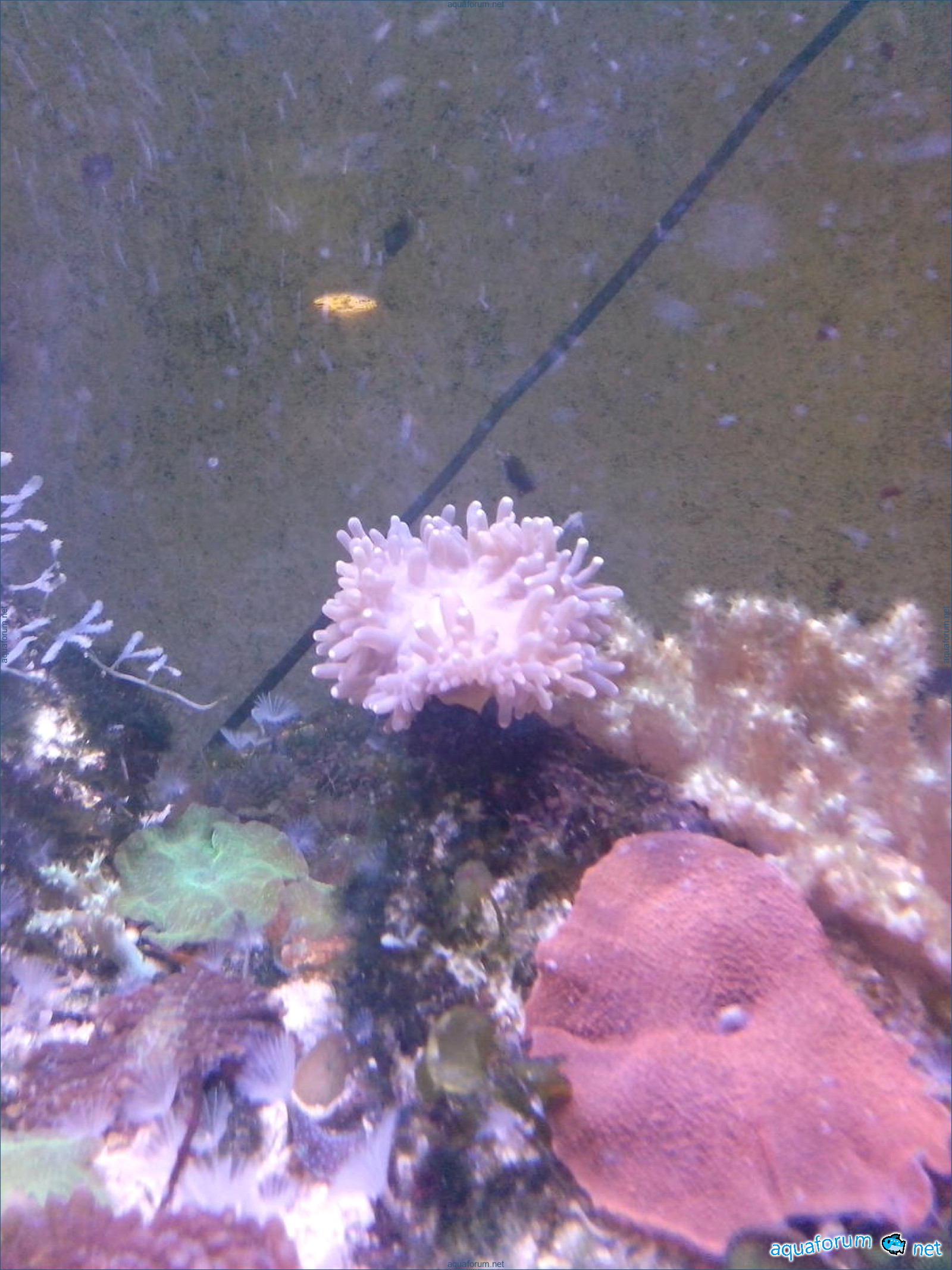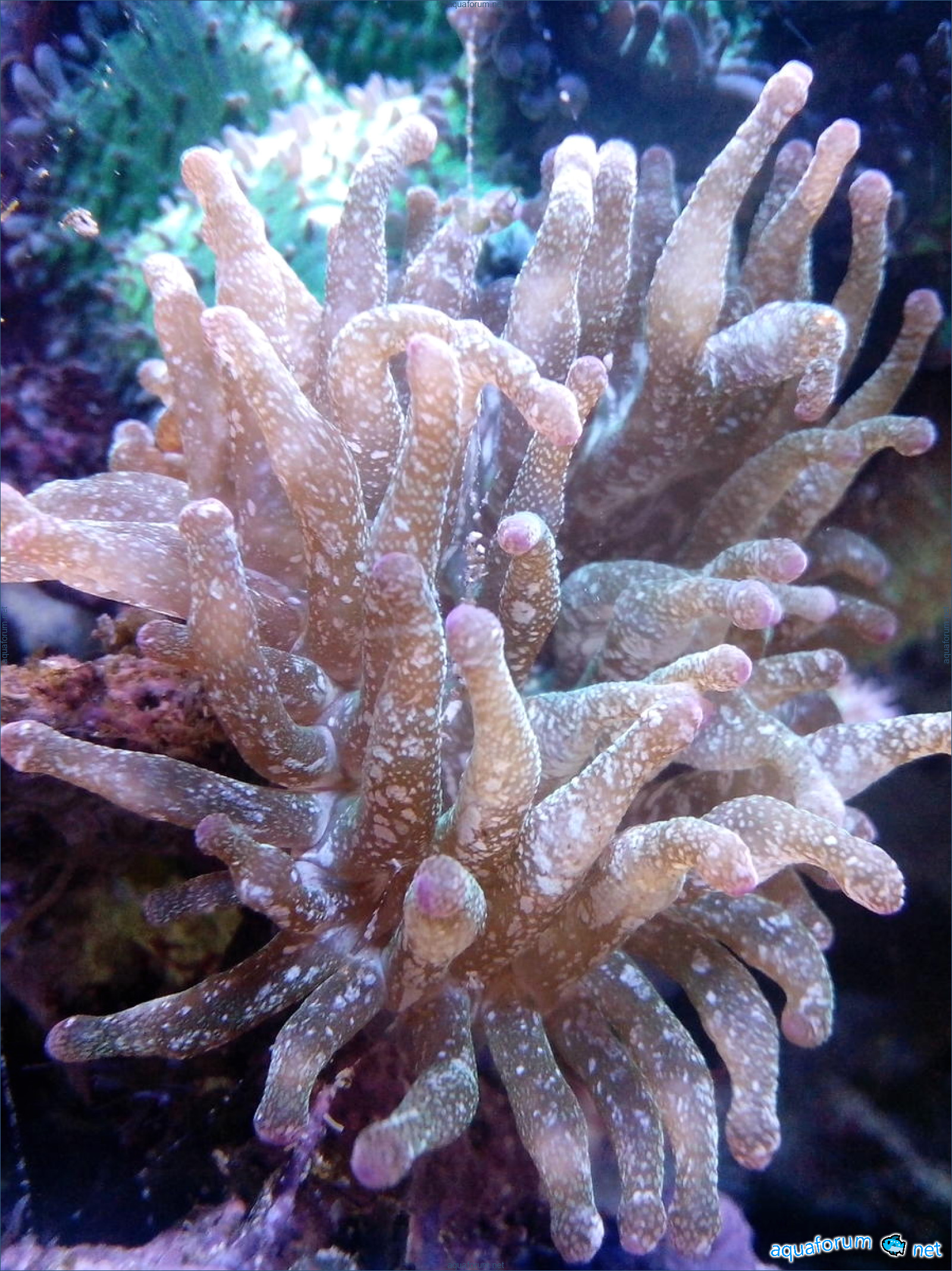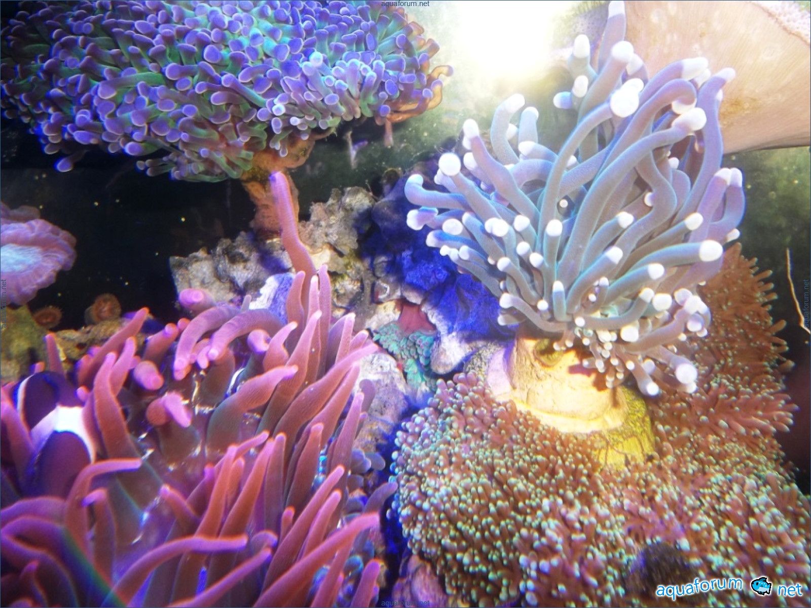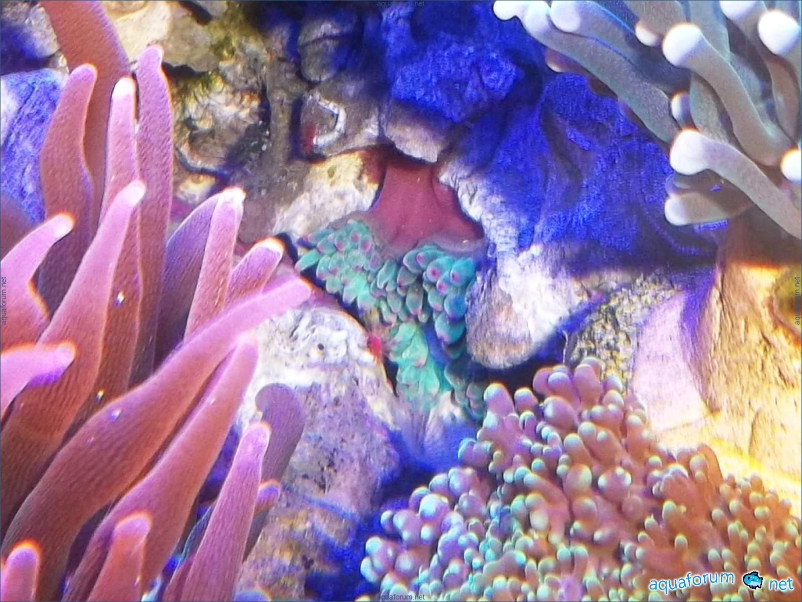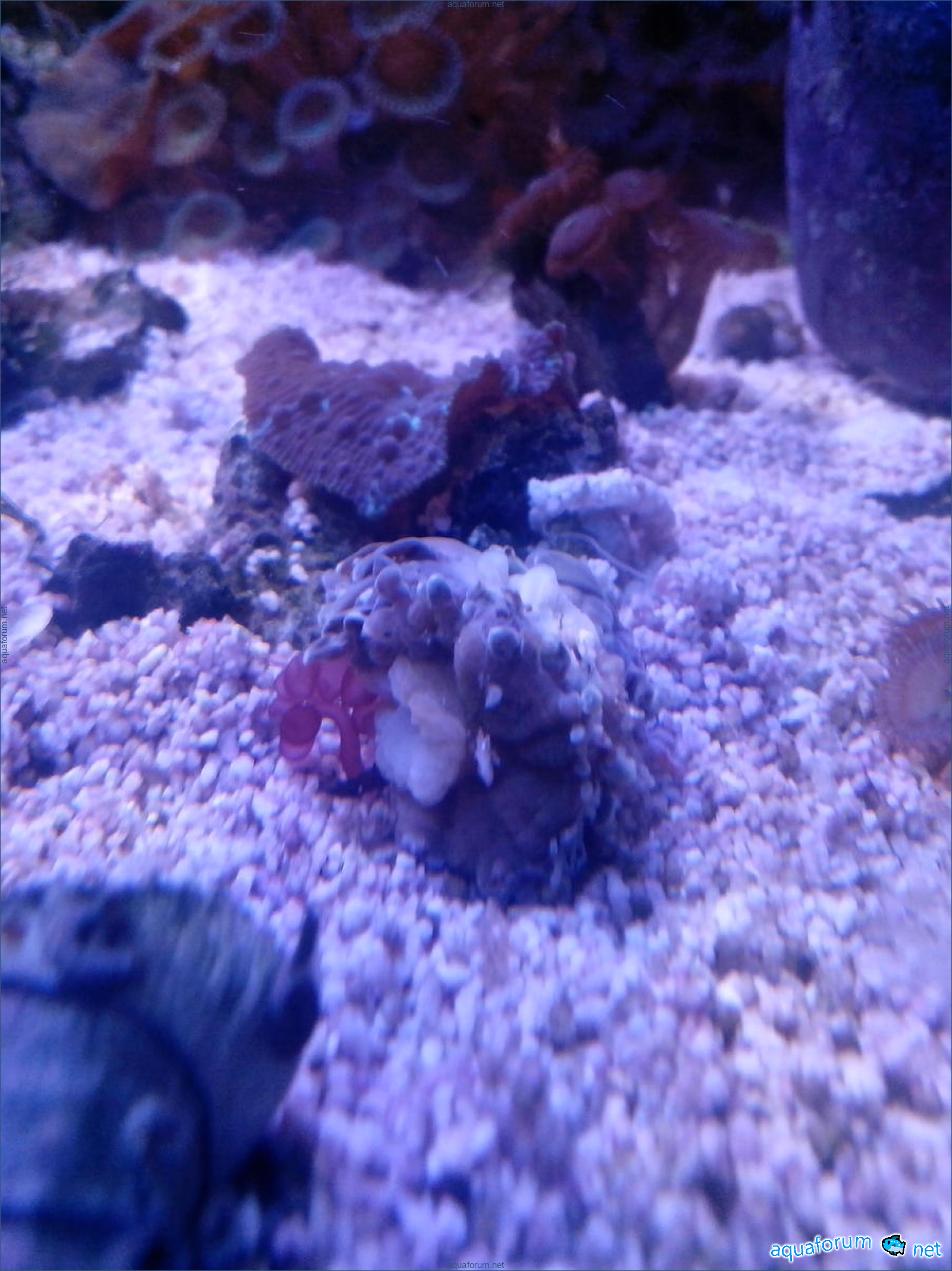 In my 450 liters, there are three Heteractis Malu. Quadricolor is another small one of cherry color - I don't know its name... it sits in the reef. It only opens at night, and I don't know what it feeds on; it probably suffers because it has shrunk in size... Malu tried to move around the aquarium - it's very interesting how it uses its foot to travel such distances in the sand - it has now returned to its place and calmed down. By the way, I didn't notice any conflict near Quadricolor; the latter seemed to share... into two and a half...