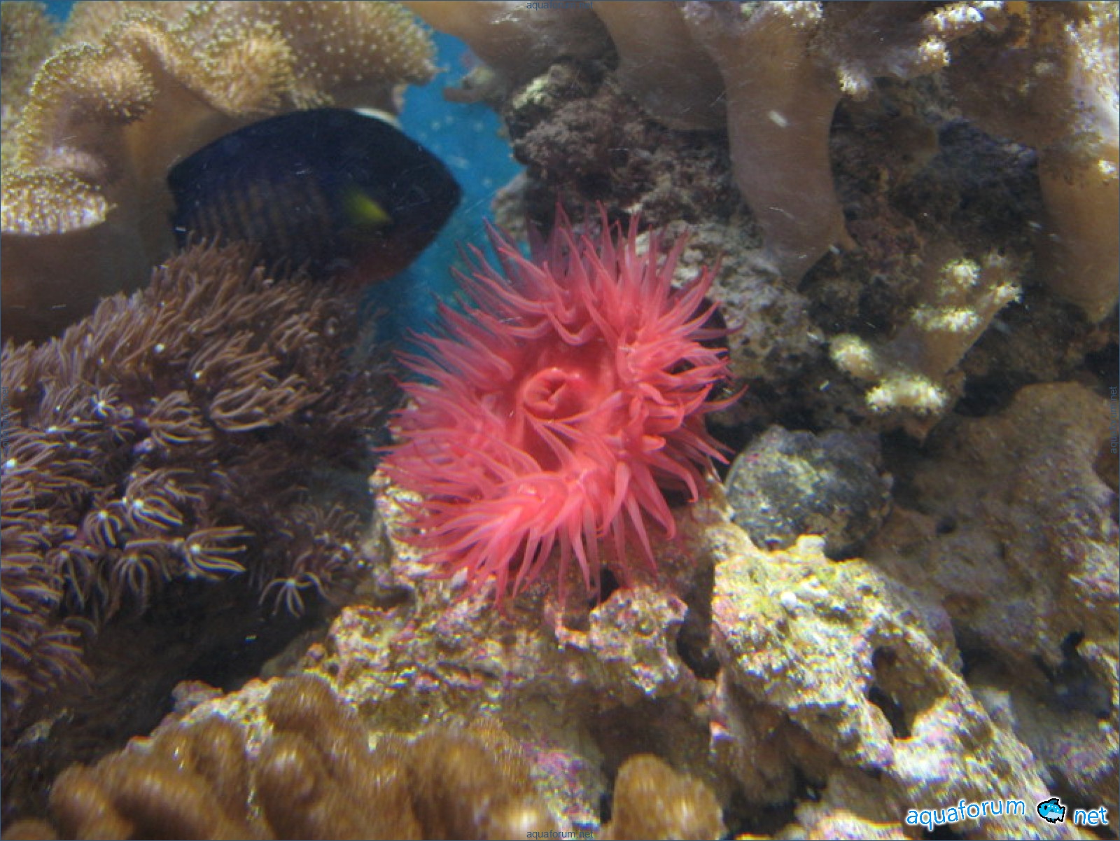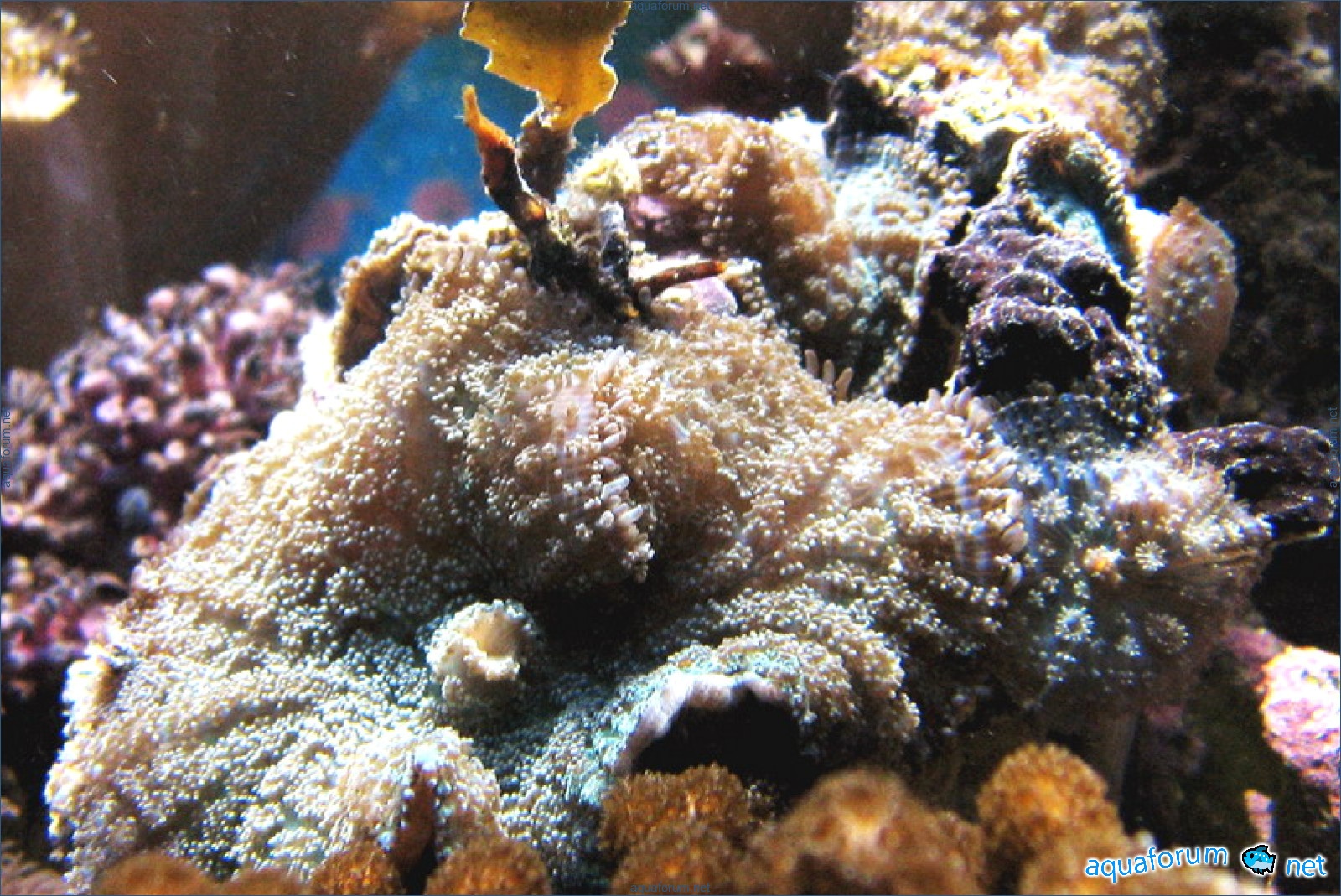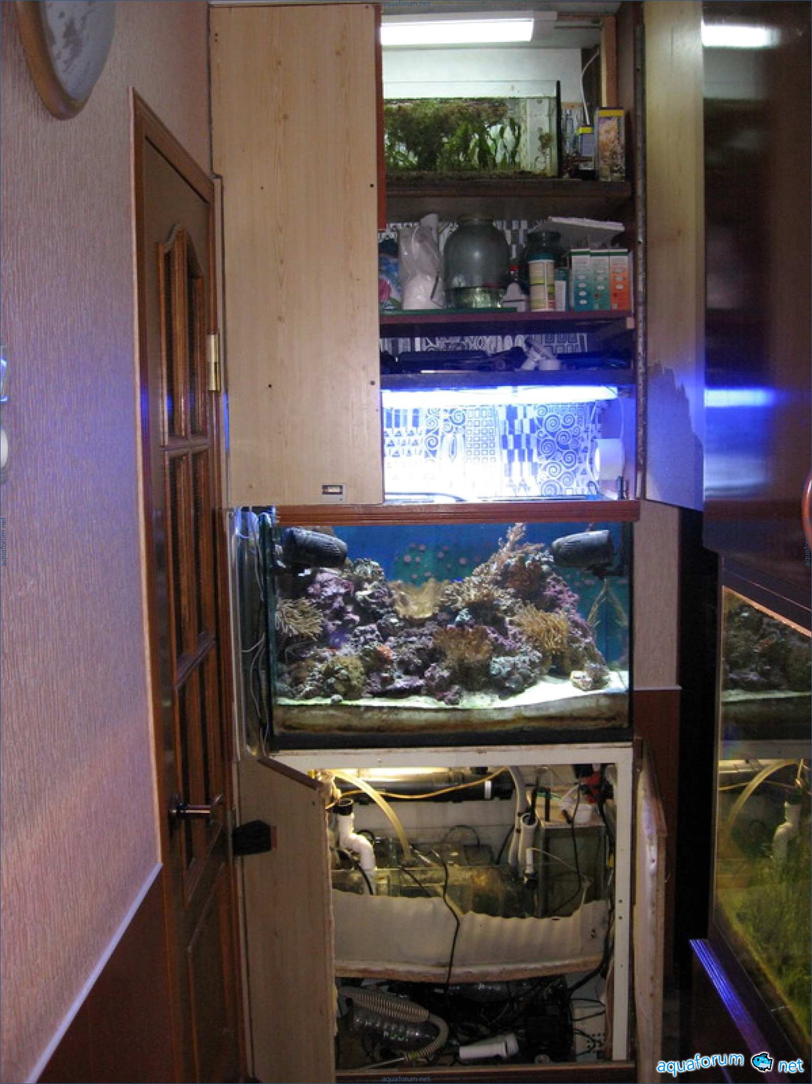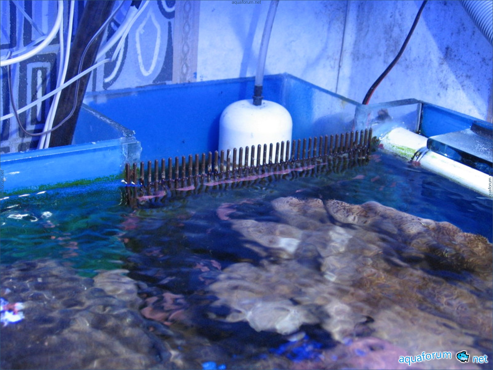 It's my turn now, time to show. The system is standard. Age 1 year. Calcium powder - DSB. Live rocks - 20kg Sandstone - 20kg Beating, kicking - It's all nonsense, live rocks are exaggerated many times. Lighting: MH BLV 150W - 14000K, T5Atman 20000K 4x30W. Algae scrubber at the top, pumped from the sump below, draining into the main aquarium. Atman protein skimmer modified (description and photos later). Return: Atman 4500l/h through UV. Ventilation (visible in the photo) bottom (constant) blows in, top (only with MH) extracts. The aquarium is blown from three sides. Power supply from the mains and emergency (return and skimmer) through U