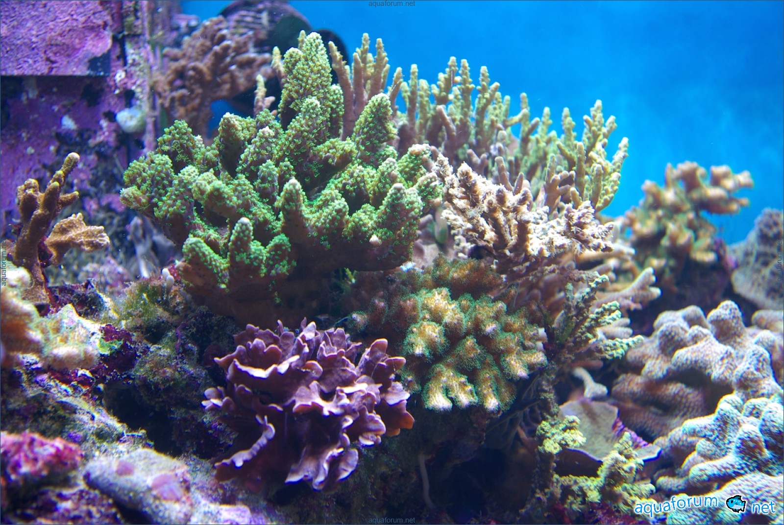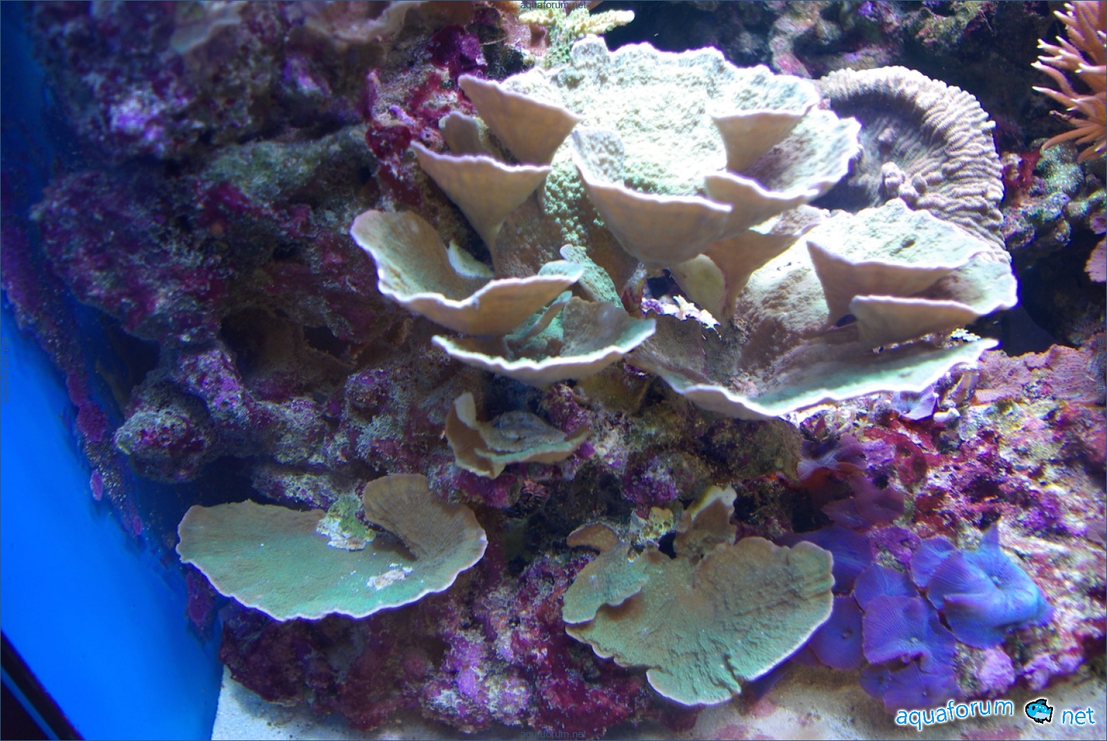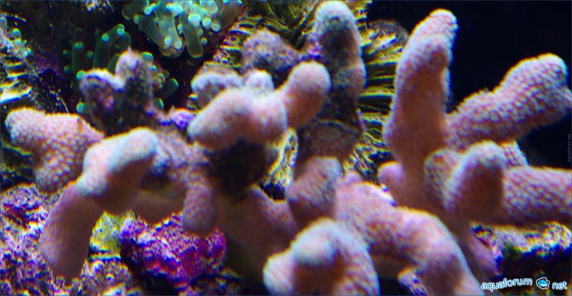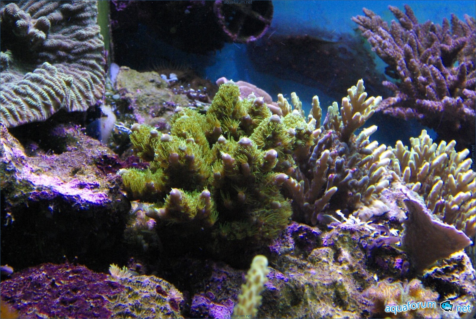 There is definitely a difference, and it's for the better. In the center of the aquarium, where there is a lot of light, the corals have started to color interestingly. In the photo, there is a coral with green polyps and dark red tissue - the tissue and polyps have started to lighten. It feels like the dark color is "washing out," leaving only a light, delicate color.