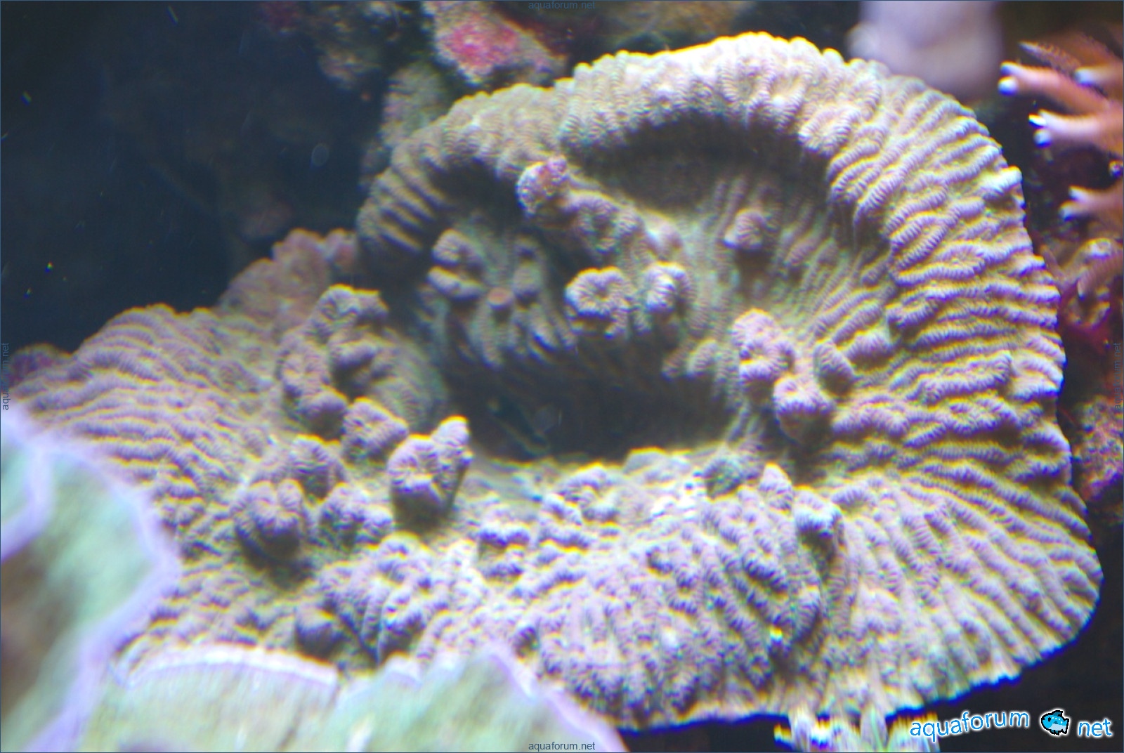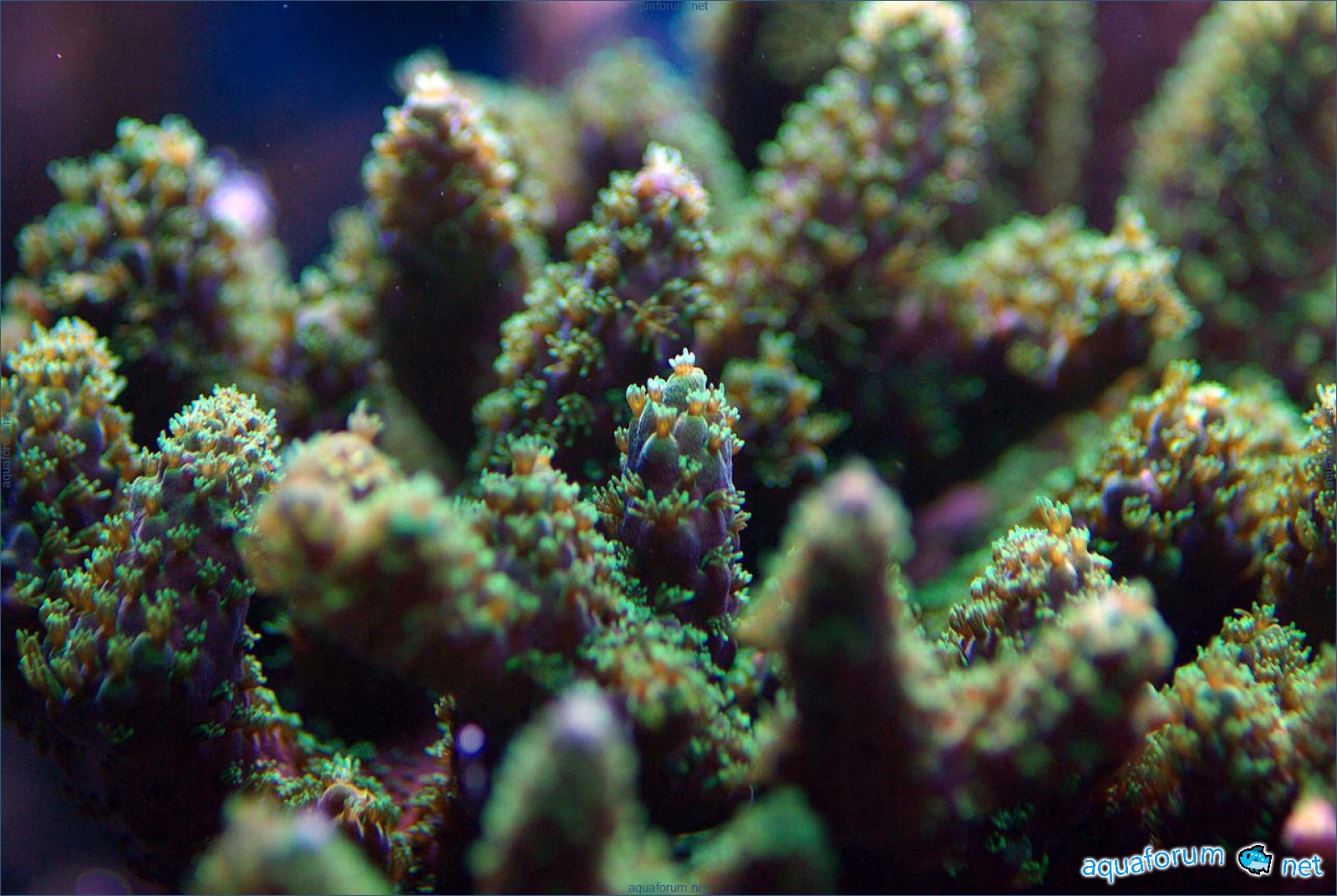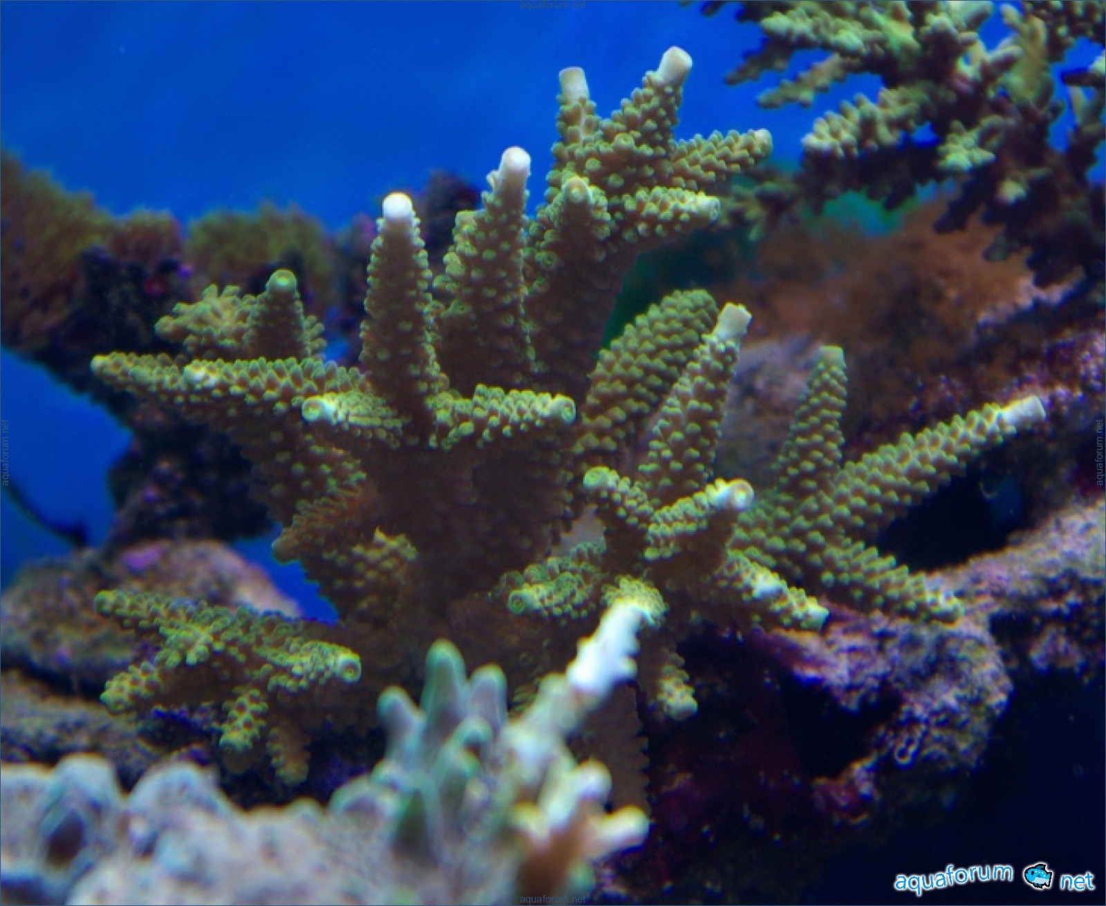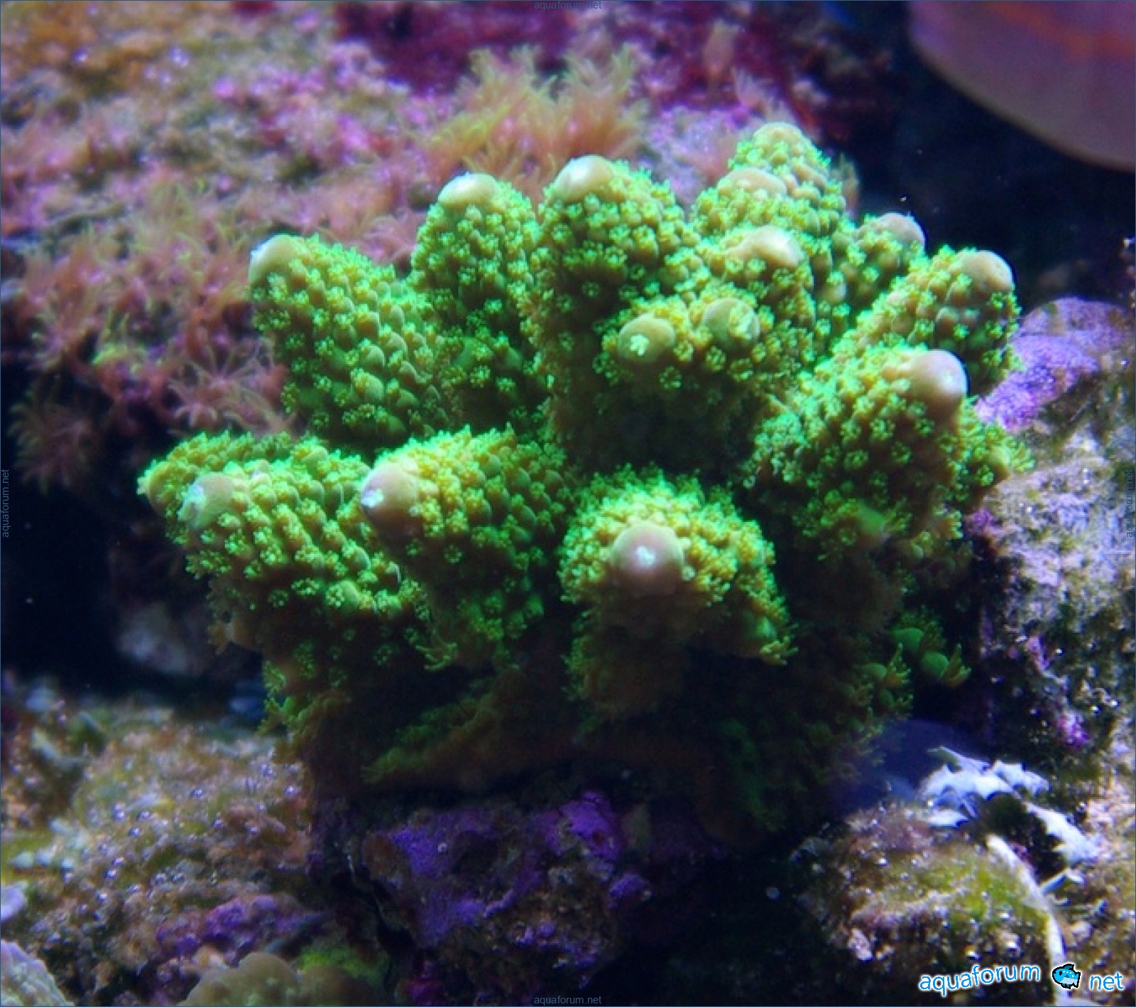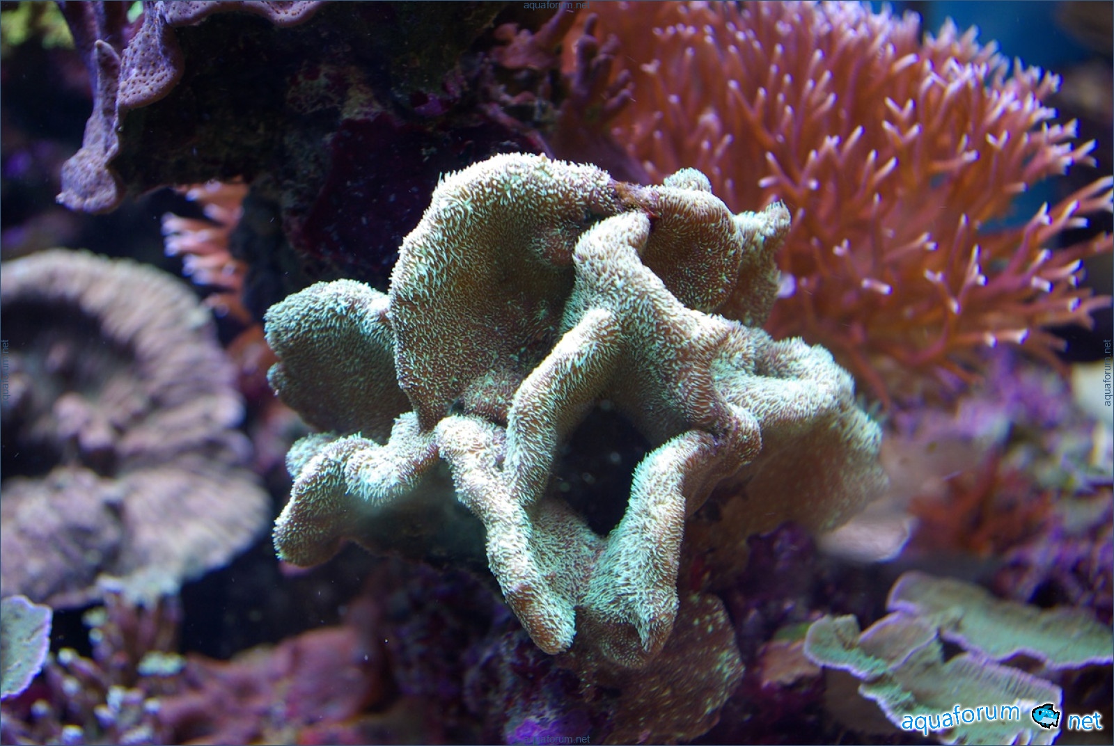There is definitely a difference, and it's for the better. In the center of the aquarium, where there is a lot of light, the corals have started to color interestingly. In the photo, there is a coral with green polyps and dark red tissue - the tissue and polyps have started to lighten. It feels like the dark color is "washing out," leaving only a light, delicate color.