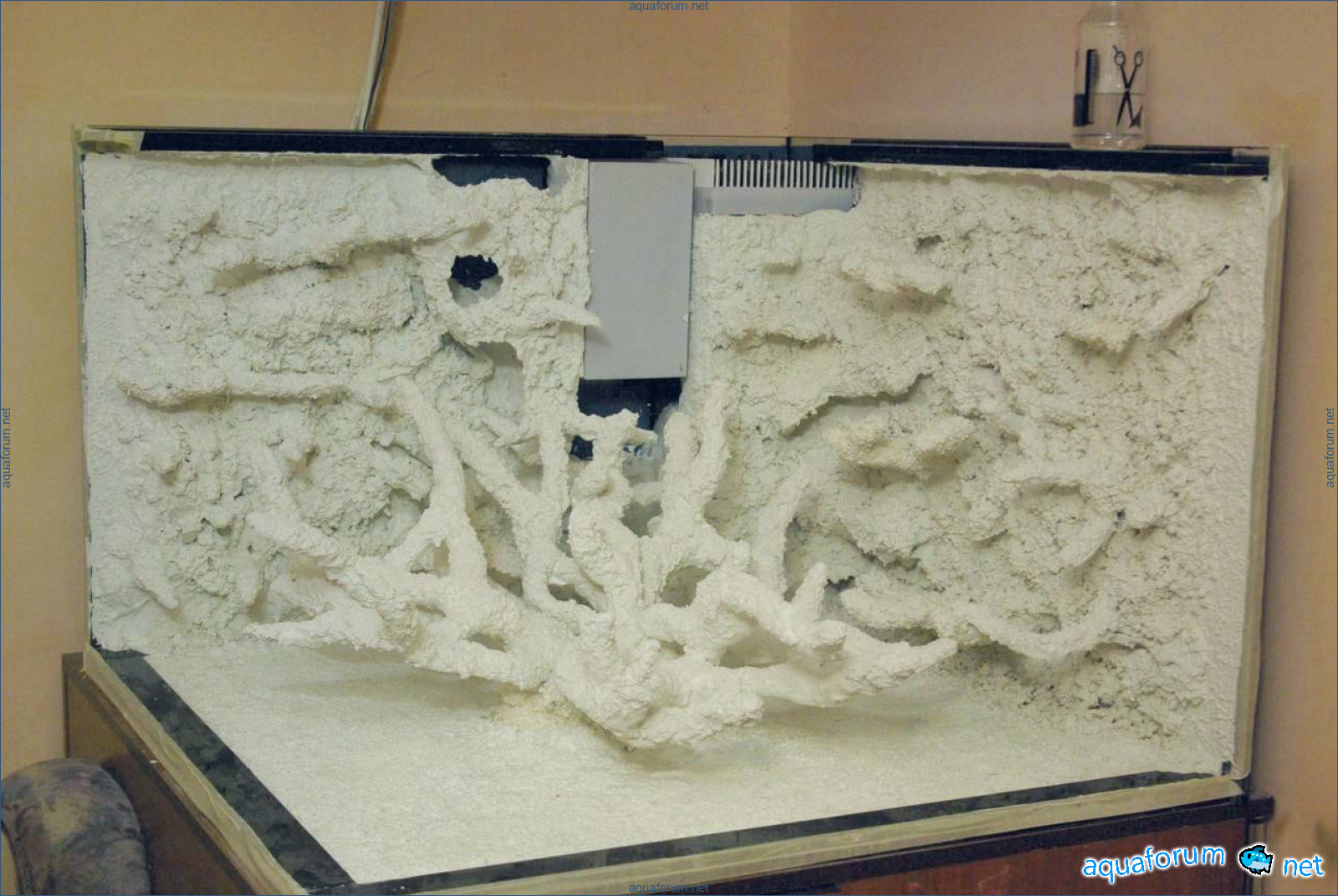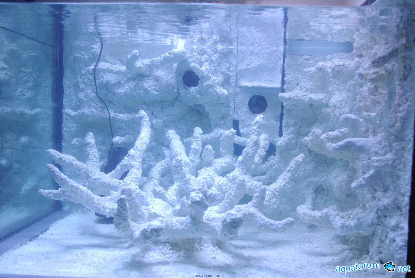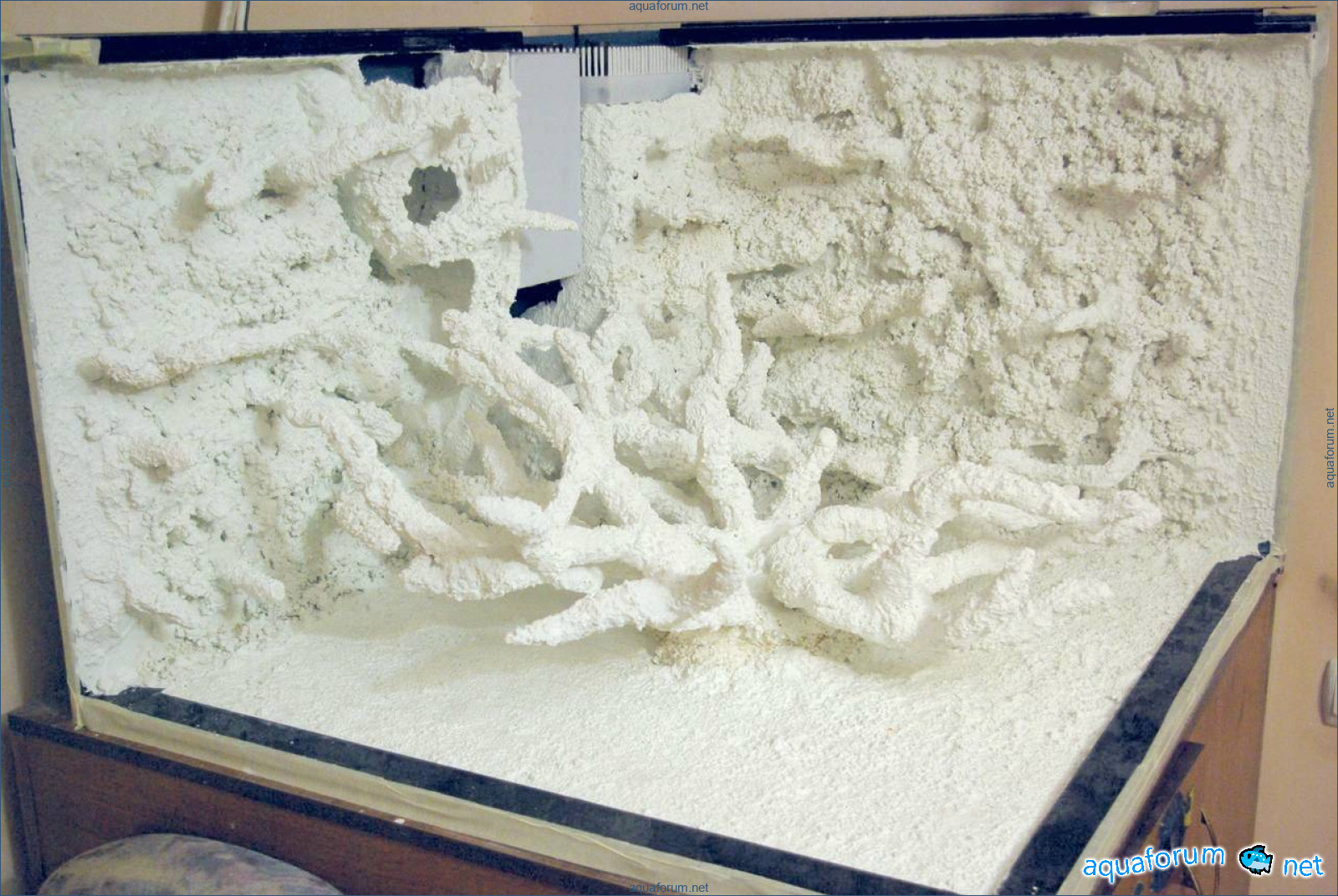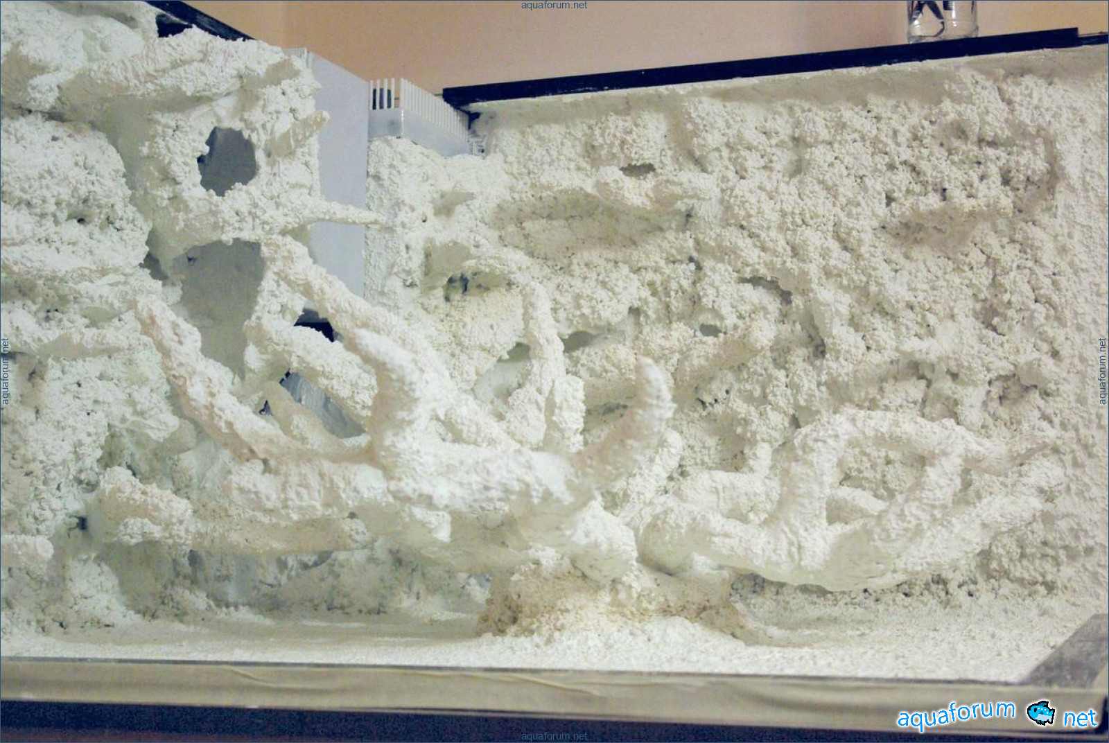 Some rearrangements in the aquarium. Two viewing glasses have been cut. The bottom and the stiffeners have been reinforced. A new grid on the drain column. New decorations made of white cement and Deep Coral sand. This week I plan to glue the glasses. Then it will be time for the sump - I want to redesign the compartments.