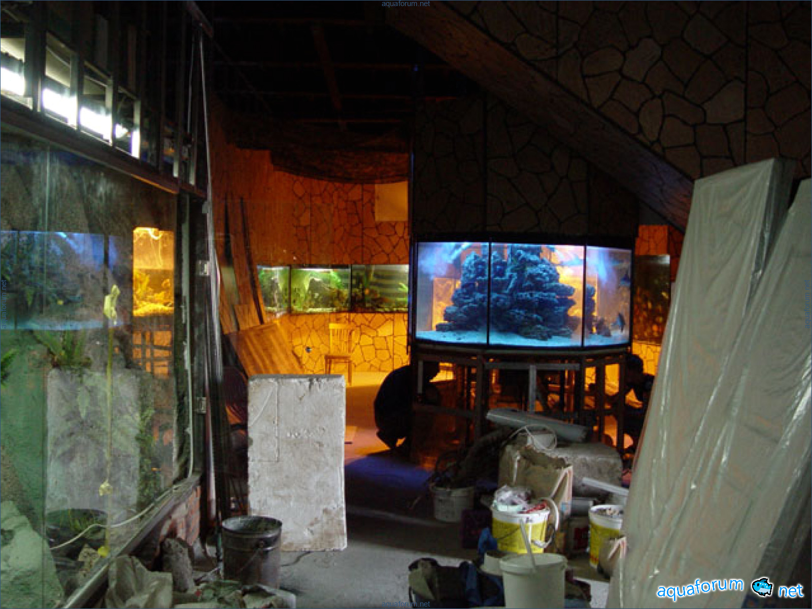 At the launch stage, there is such a structure: The Hull - steel. Viewing glass - three silicate glasses 1500x2100 mm. Skimmer. Light - 6 pcs. The tank (and not only this one) is located on a watercraft that I hope will sail away soon.