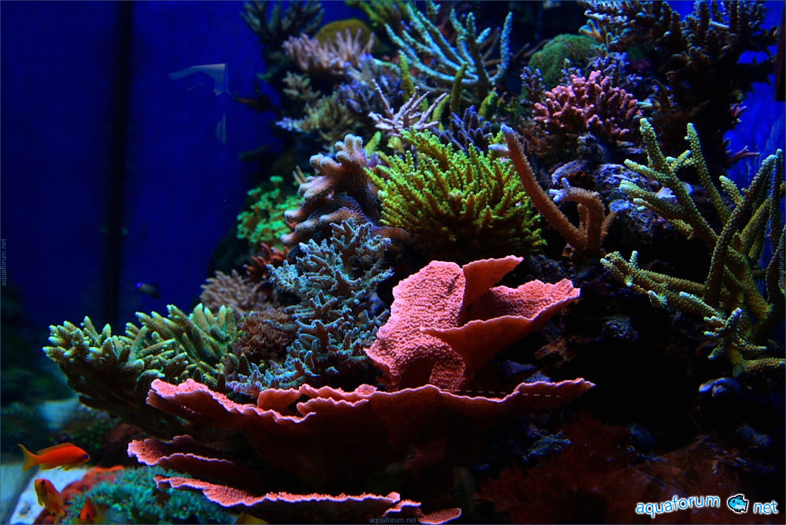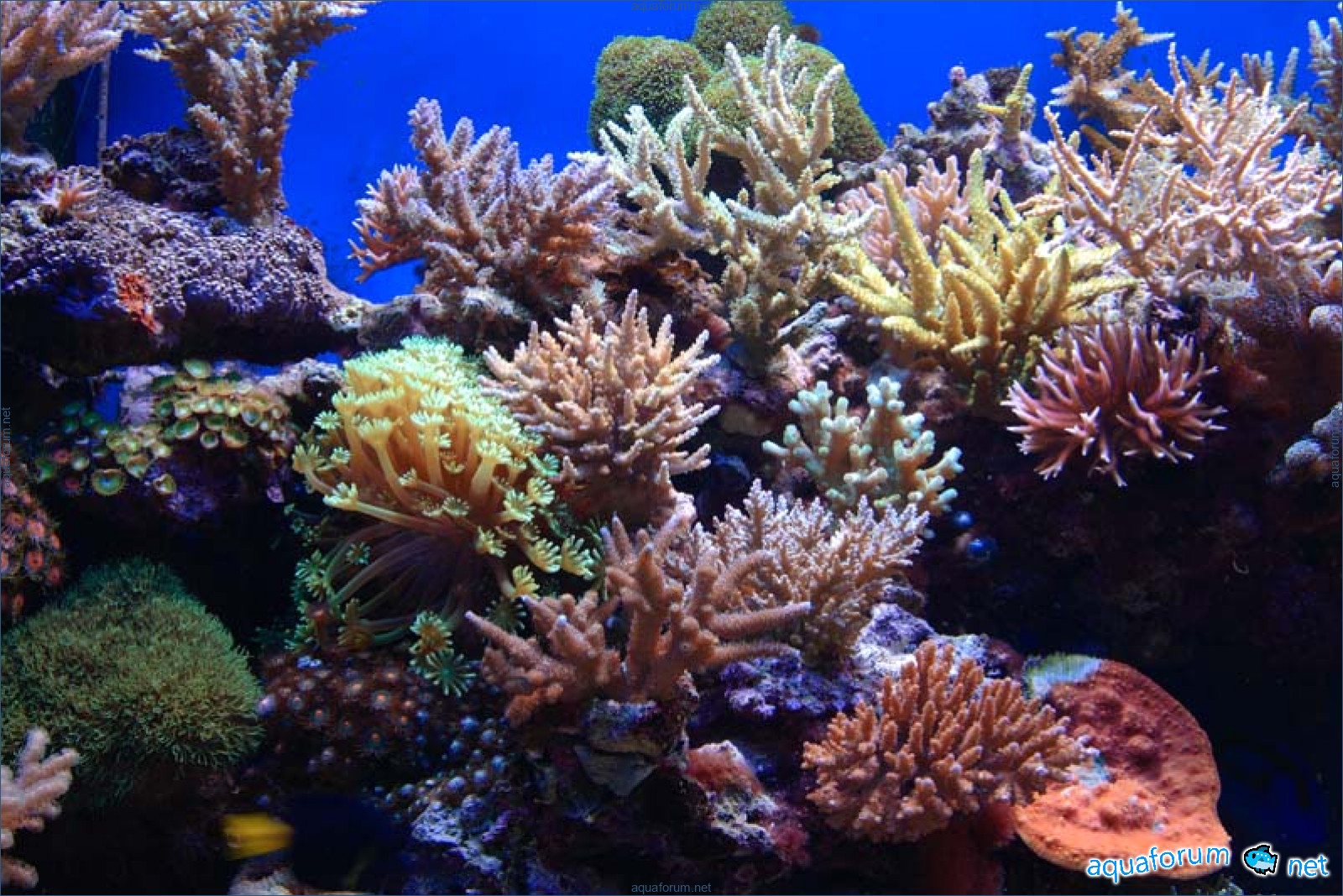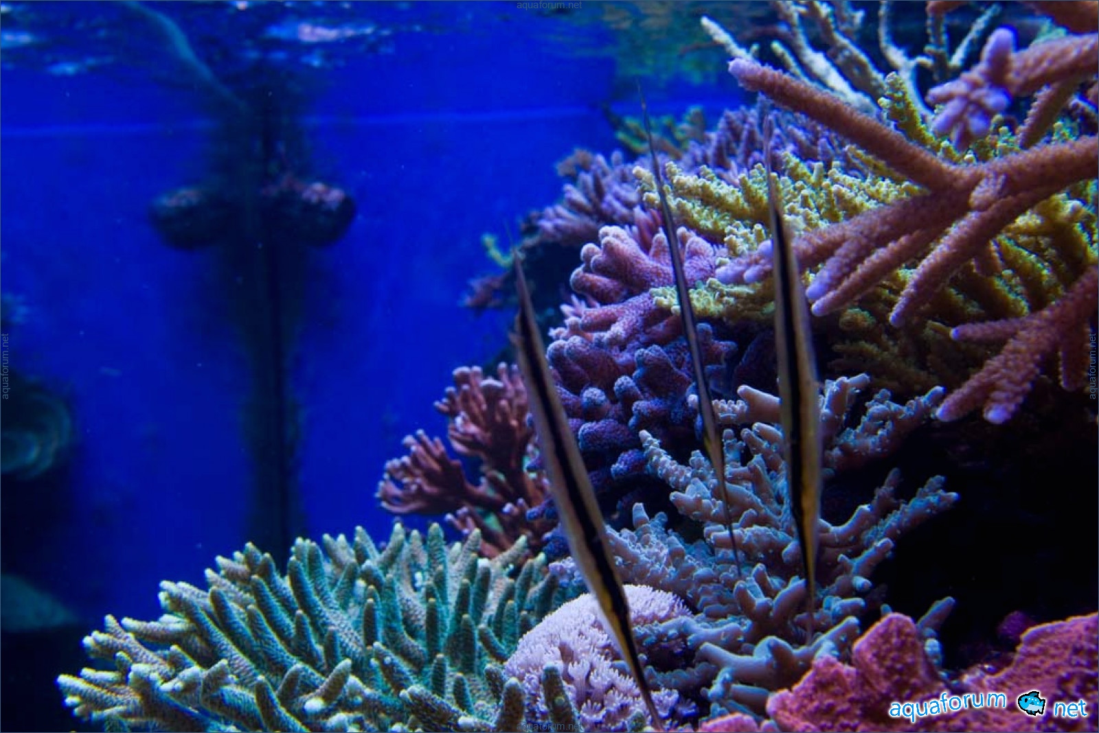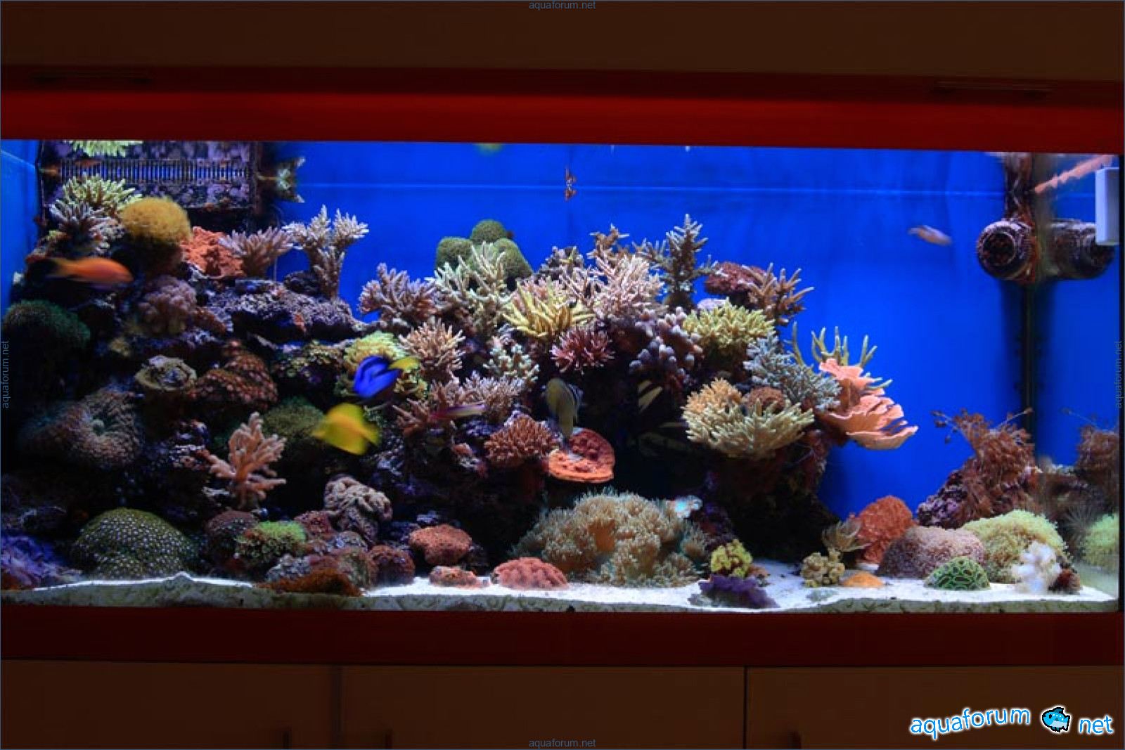 Good evening. I also decided to contribute to this forum. It seems unpatriotic not to. I immediately want to express my gratitude to everyone who helped launch this system, which will be a year old in a couple of months. Special thanks to Ray Tkach, who provided invaluable assistance in creating the reef in the initial stage (and not only in the initial stage), and to Sergey's team, who set up an excellent living environment. The description is provided here: Brief system description: size - 1600x650x700 (height) + sump + mangrove tank (but more on that later) lighting - 3 MG 250 watt reef-crest 12000K + 2 actinic T5 from Fauna Marin flow - 2 Tunze on a controller + Sicce 5000 (for rock movement) Protein skimmer - on a Beckett injector, manufactured by Ray Tkach. After replacing the pump with a Resun PG-10000, it became simply "on fire." The system contains approximately 100 kg of live rock + 20 kg of live rock in the mangrove tank. The aquarium has a 5 cm deep live aragonite sand, the sump has 9 cm, and the mangrove tank has Mineral Mud and aragonite sand. The canister filter in the system contains 4 oz. of ChemiPure Elite + Purigen. The Reef Octopus calcium reactor is not keeping up with the system's appetite, so I'm adding Fauna Marin. An