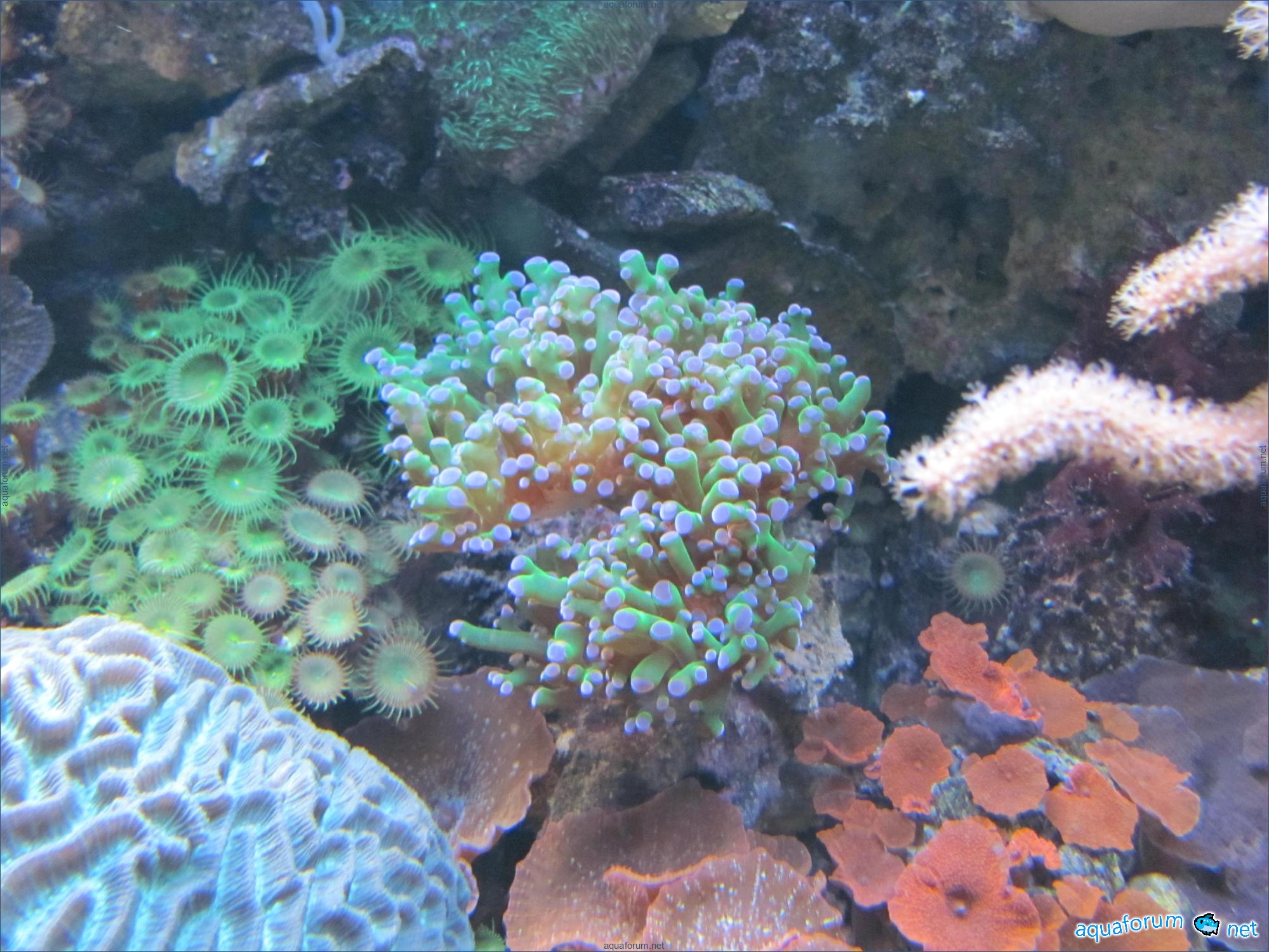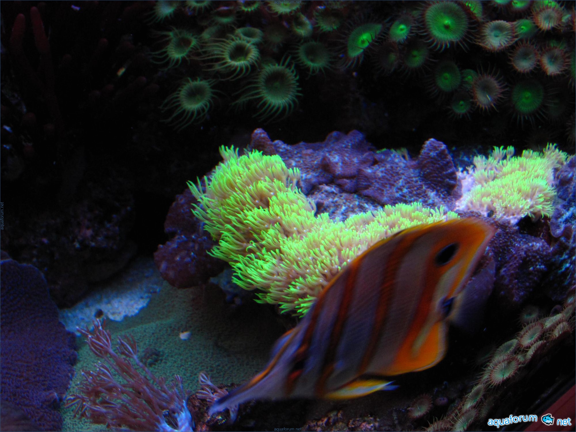 The reef aquarium has been operating since 1996, with3 restarts, filtration: pre-filter 15x60x60, aerobic filter, upper transit aquarium with algae 40x23x22, PC - 2500 l/h, live rocks, Tetra salt, lighting MH 150W, 4 t-5 l, 2 Power Glo, 2 ina Glo. The fish aquarium has been operating since 1998, everything is the same, except for M