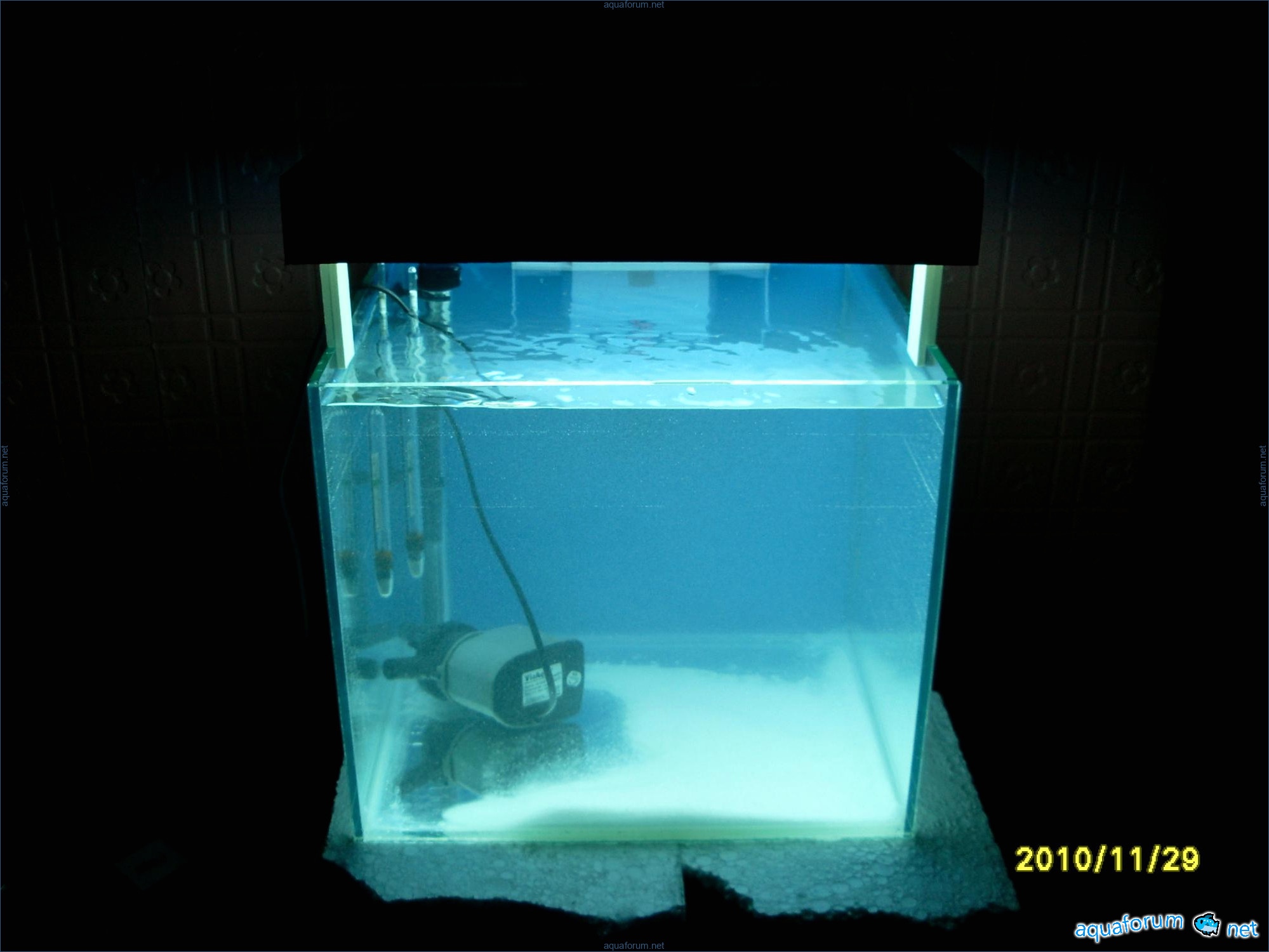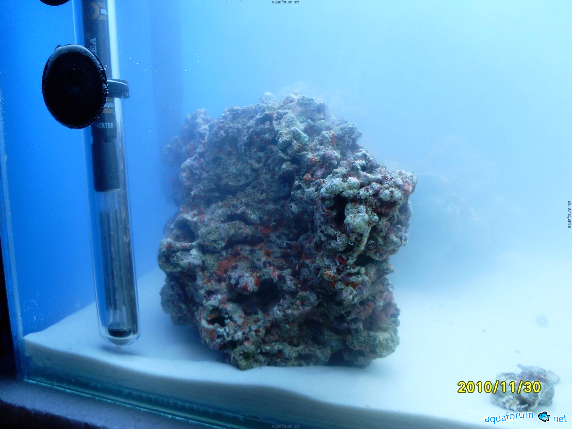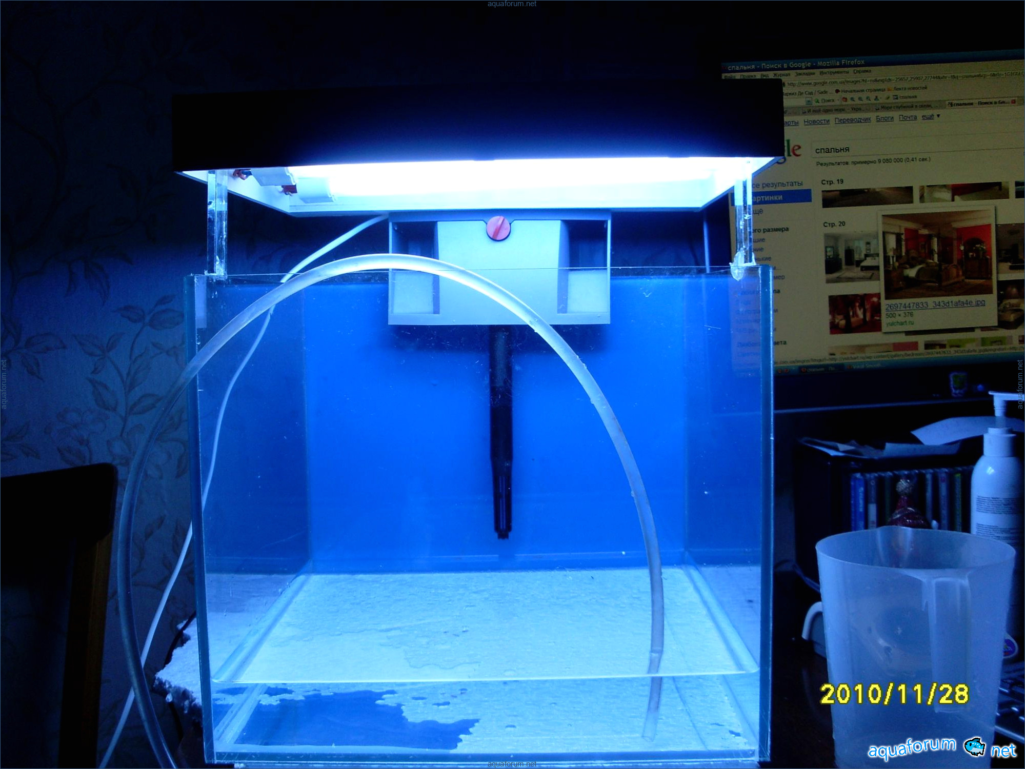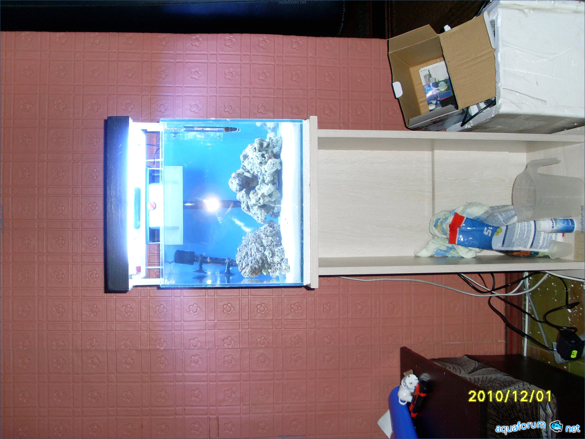 A31-liter cube was used for practice instead of launching a 200-liter sea project. Surprisingly, a 370-liter cichlid aquariumhlid aquarium looks like a bomb, despite the small 31-liter size and two stones. The cube dimensions are 35*35*30 cm. The lighting setup includes 2*24 PL lamps, blue LEDs, and a moonlight. The filtration system consists of an Eheim Liberty filter with sponge, polyfill, and Prigen. A Hailea heater and a Red Sea hydrometer are used. Red Sea salt and Natures Ocean sand are the substrate. Reverse osmosis water is