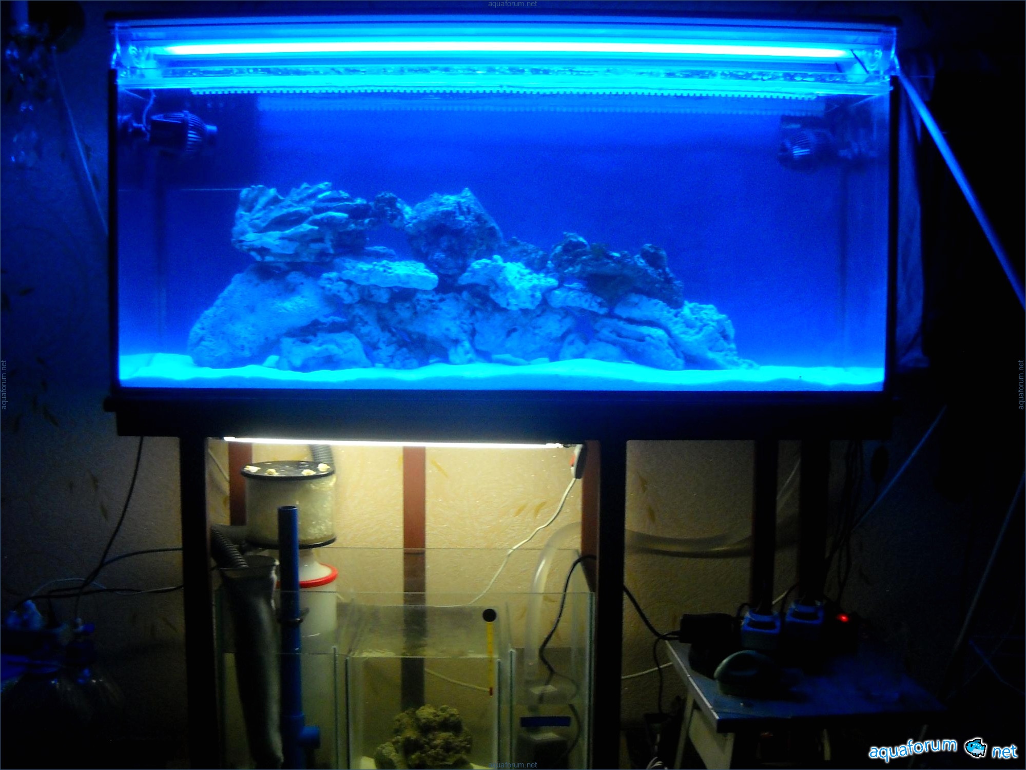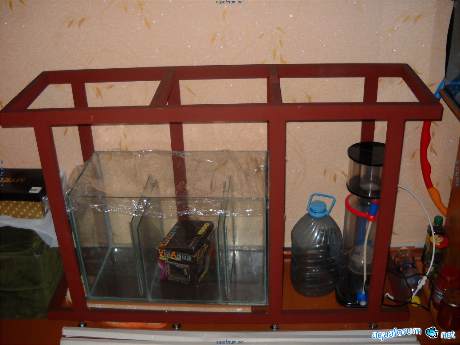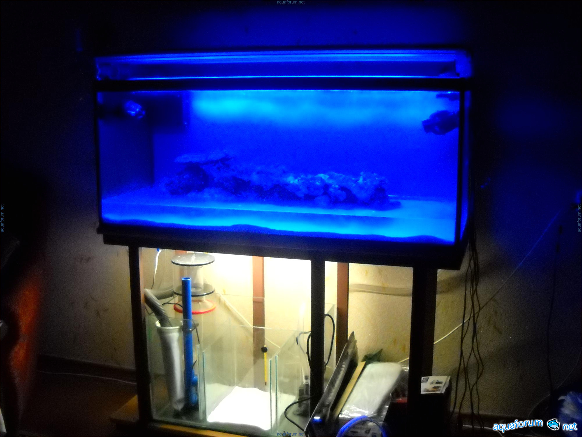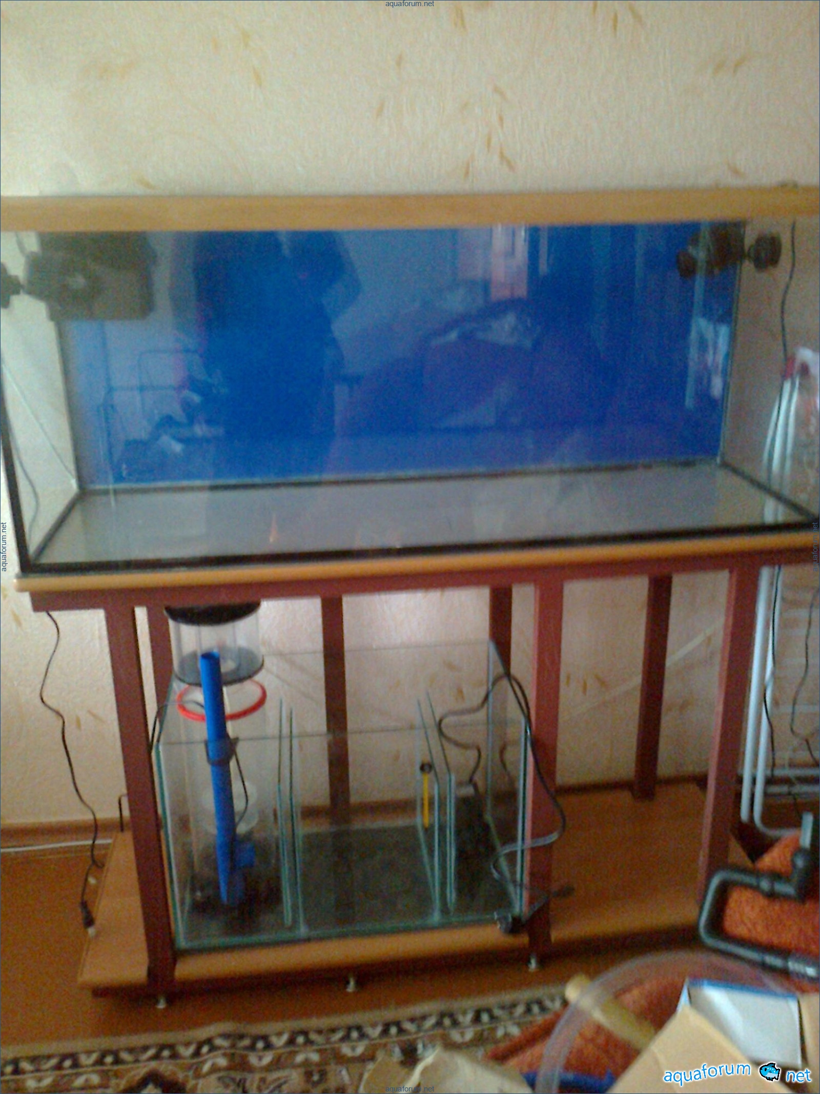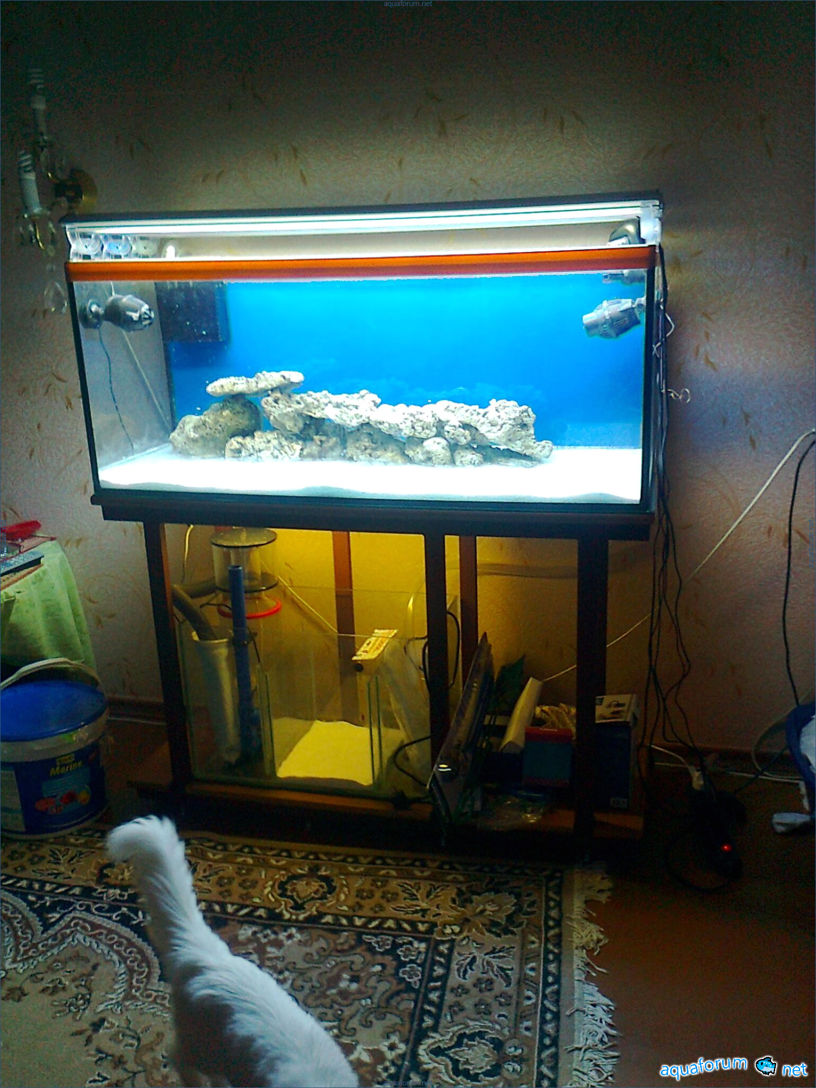 Hello everyone, dear forum participants! I have finally collected all the components to launch a marine aquarium. So, it consists of: Aquarium: 1200x400x500H (former freshwater); had to cut off a piece of the back stiffeningrib on one side for the overflow installation (cut with a metal hacksaw with a tungsten blade). Sump: 600x300x400H Lighting: 3 SunSun HDD-1200B lamps, 2x54W T5, 3 white bulbs, 3 blue. Reverse osmosis: 6-stage reverse osmosis system with a pump and AURO-50P-16+M + 2K + 2 resin cartridges. Salt: Tetra Marine (will fill the osmosis and mix in the sump) Overflow: Eshopps PF 300 Protein skimmer: Bubble Magnus BM-110 Drain hose: Eshopps filter sock Flow: 1 x sun sun 3000 l/h, 1 x 5000 l/h Return pump: Viaaqua 1800 Live rock - 7 kg, Dry rock - 25 kg, Sand - 15-18 kg approximately. That's all for now. Photo description: 1,2 - sump gluing; 3 - frame; The rest of the photos up to the cat show the current state of the aquarium; 15, 16 - sump gluing; 17 - sump testing; Further - the chronology of the work done. Gluing the chipboard to the frame, installing the aqu