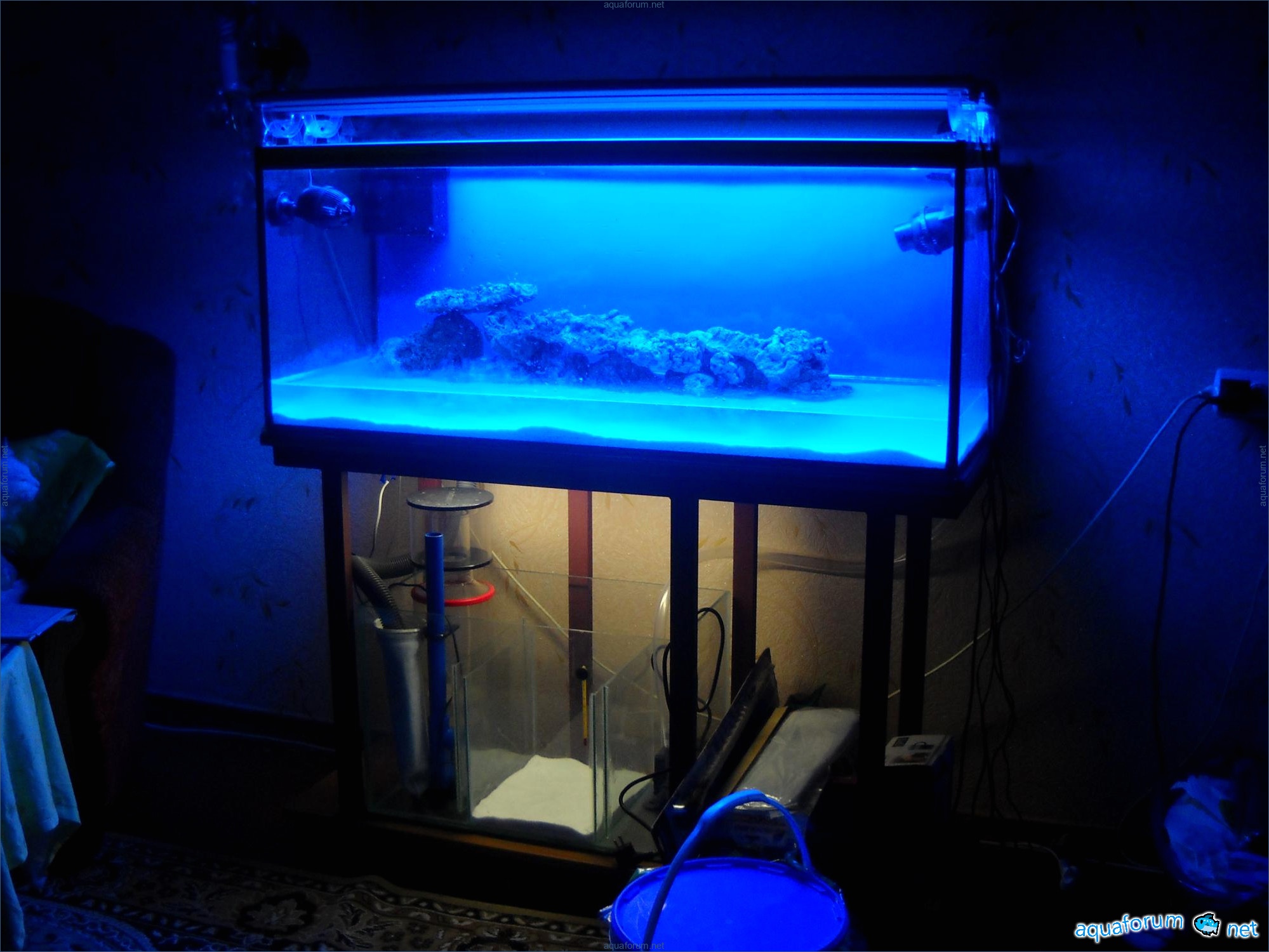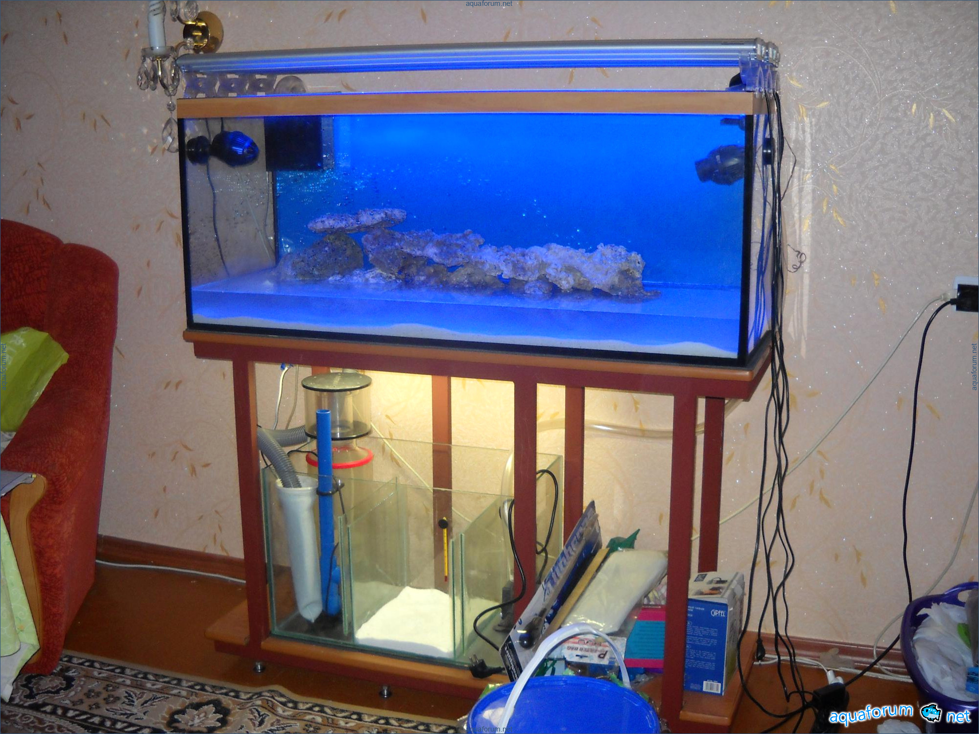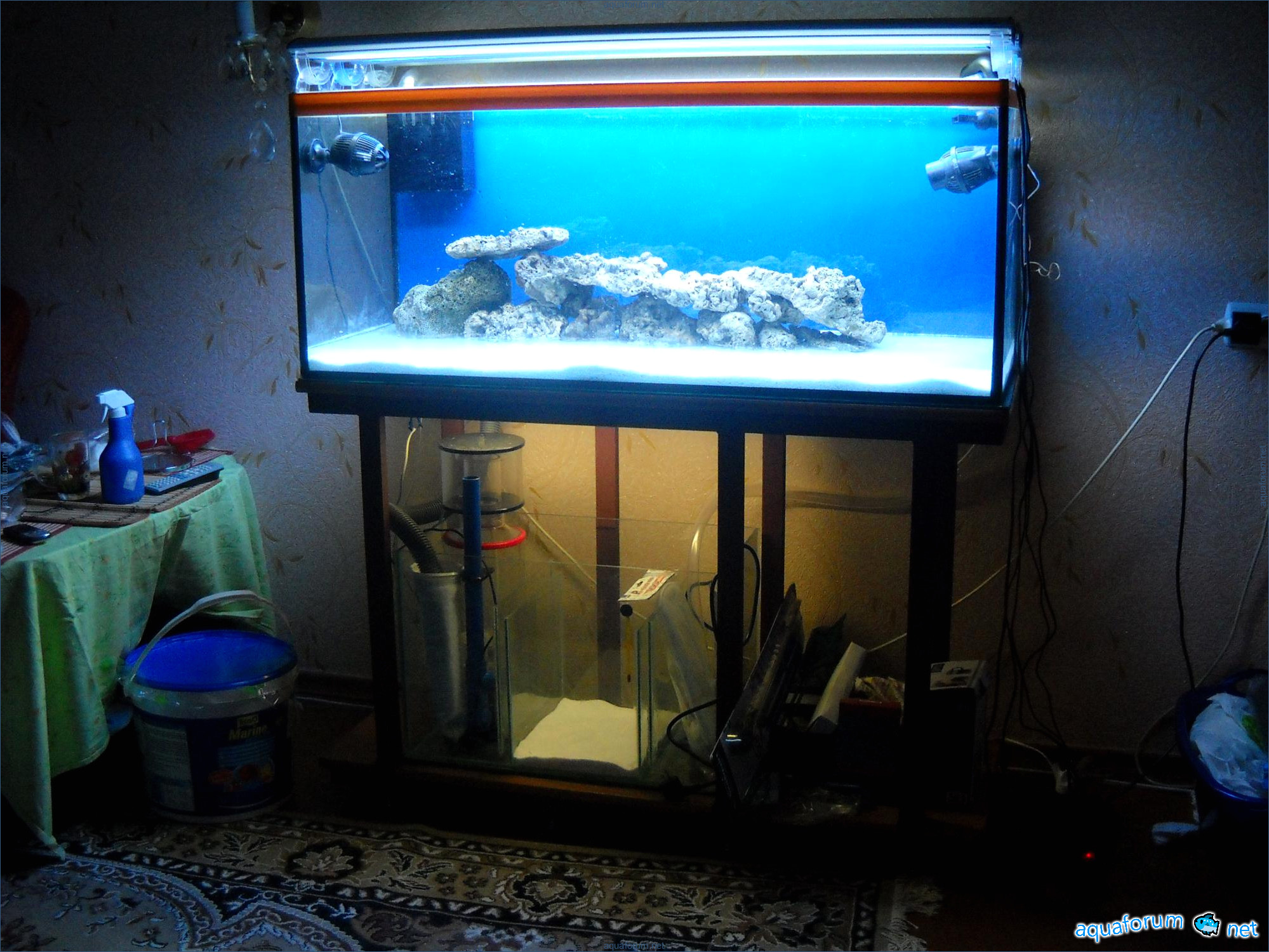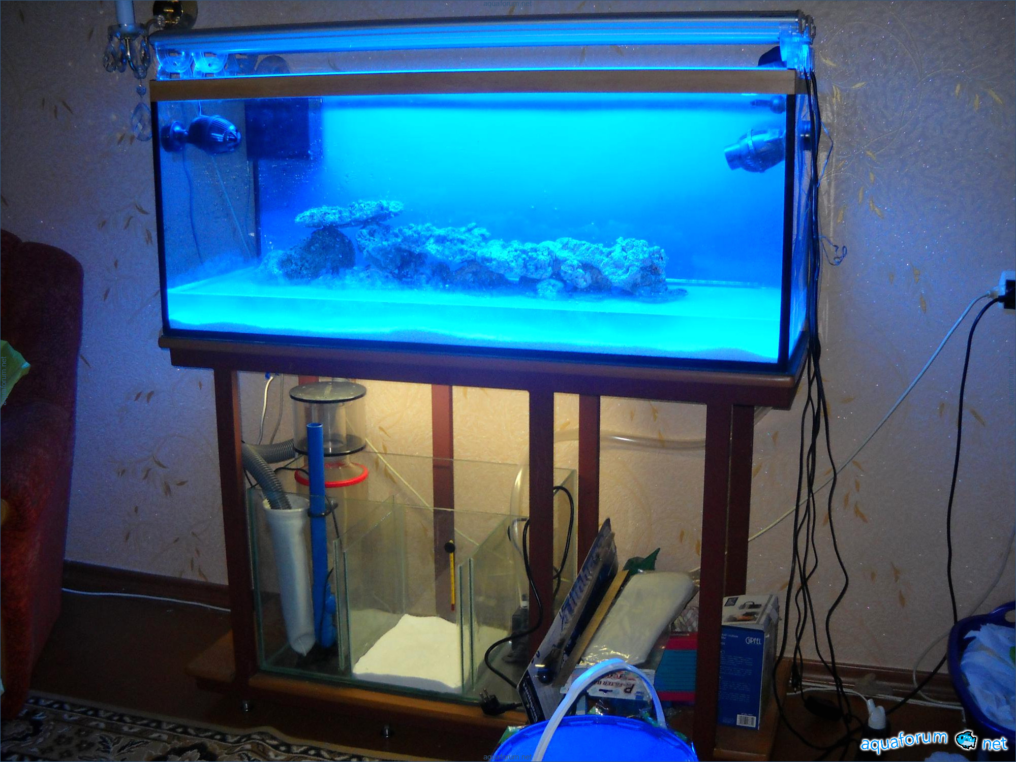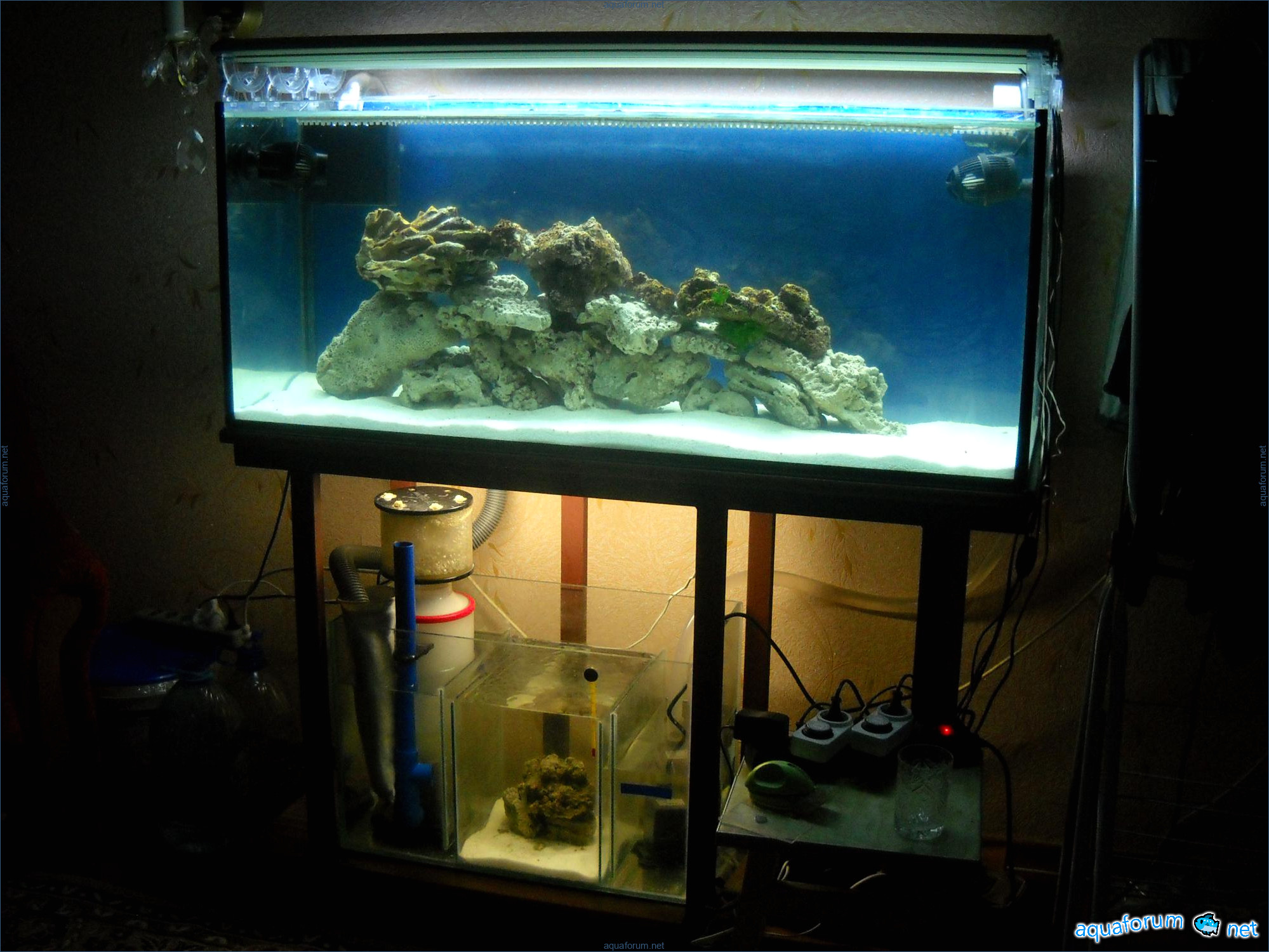 Hello everyone, dear forum participants! I have finally collected all the components to launch a marine aquarium. So, it consists of: Aquarium: 1200x400x500H (former freshwater); had to cut off a piece of the back stiffeningrib on one side for the overflow installation (cut with a metal hacksaw with a tungsten blade). Sump: 600x300x400H Lighting: 3 SunSun HDD-1200B lamps, 2x54W T5, 3 white bulbs, 3 blue. Reverse osmosis: 6-stage reverse osmosis system with a pump and AURO-50P-16+M + 2K + 2 resin cartridges. Salt: Tetra Marine (will fill the osmosis and mix in the sump) Overflow: Eshopps PF 300 Protein skimmer: Bubble Magnus BM-110 Drain hose: Eshopps filter sock Flow: 1 x sun sun 3000 l/h, 1 x 5000 l/h Return pump: Viaaqua 1800 Live rock - 7 kg, Dry rock - 25 kg, Sand - 15-18 kg approximately. That's all for now. Photo description: 1,2 - sump gluing; 3 - frame; The rest of the photos up to the cat show the current state of the aquarium; 15, 16 - sump gluing; 17 - sump testing; Further - the chronology of the work done. Gluing the chipboard to the frame, installing the aqu