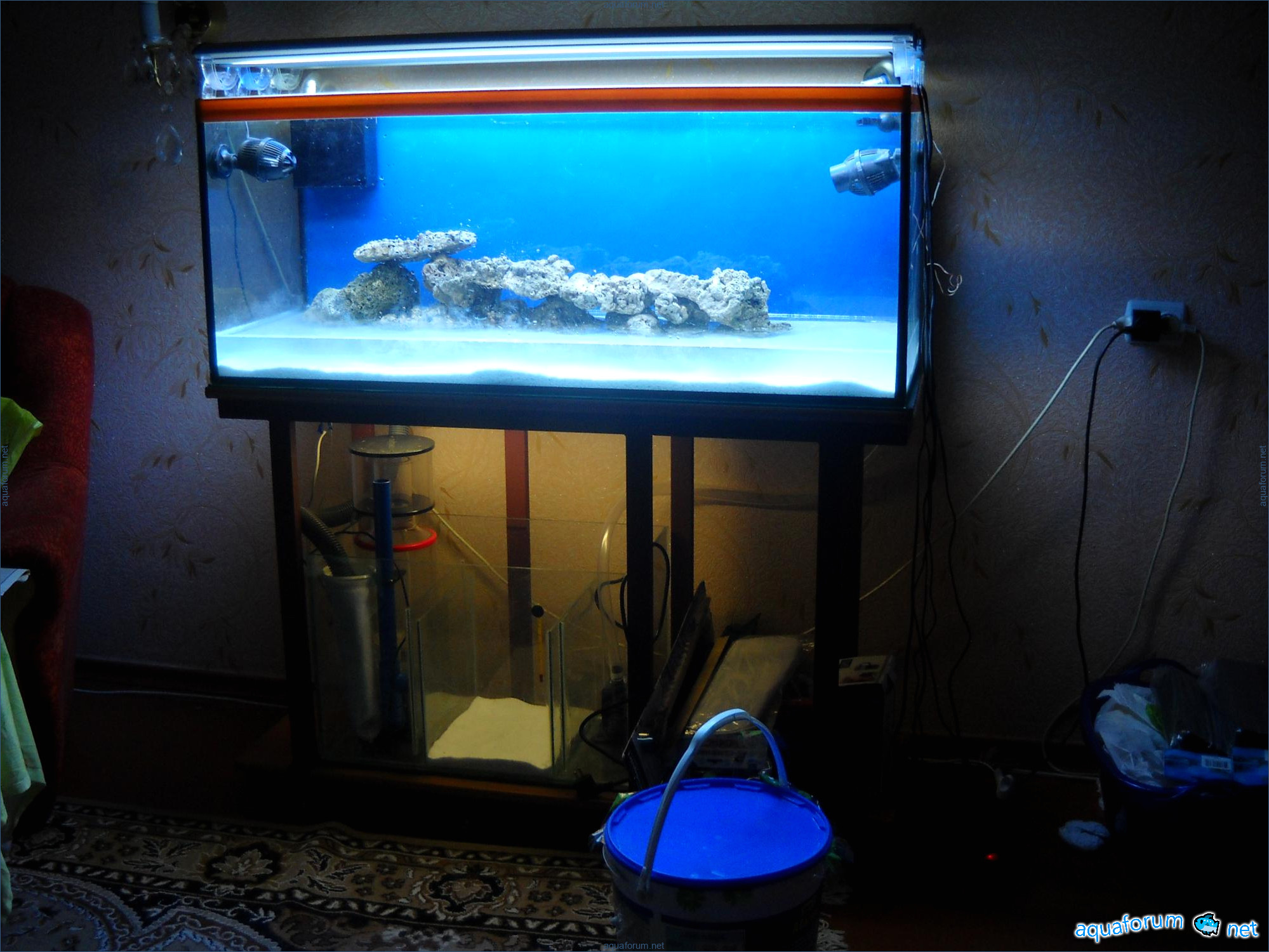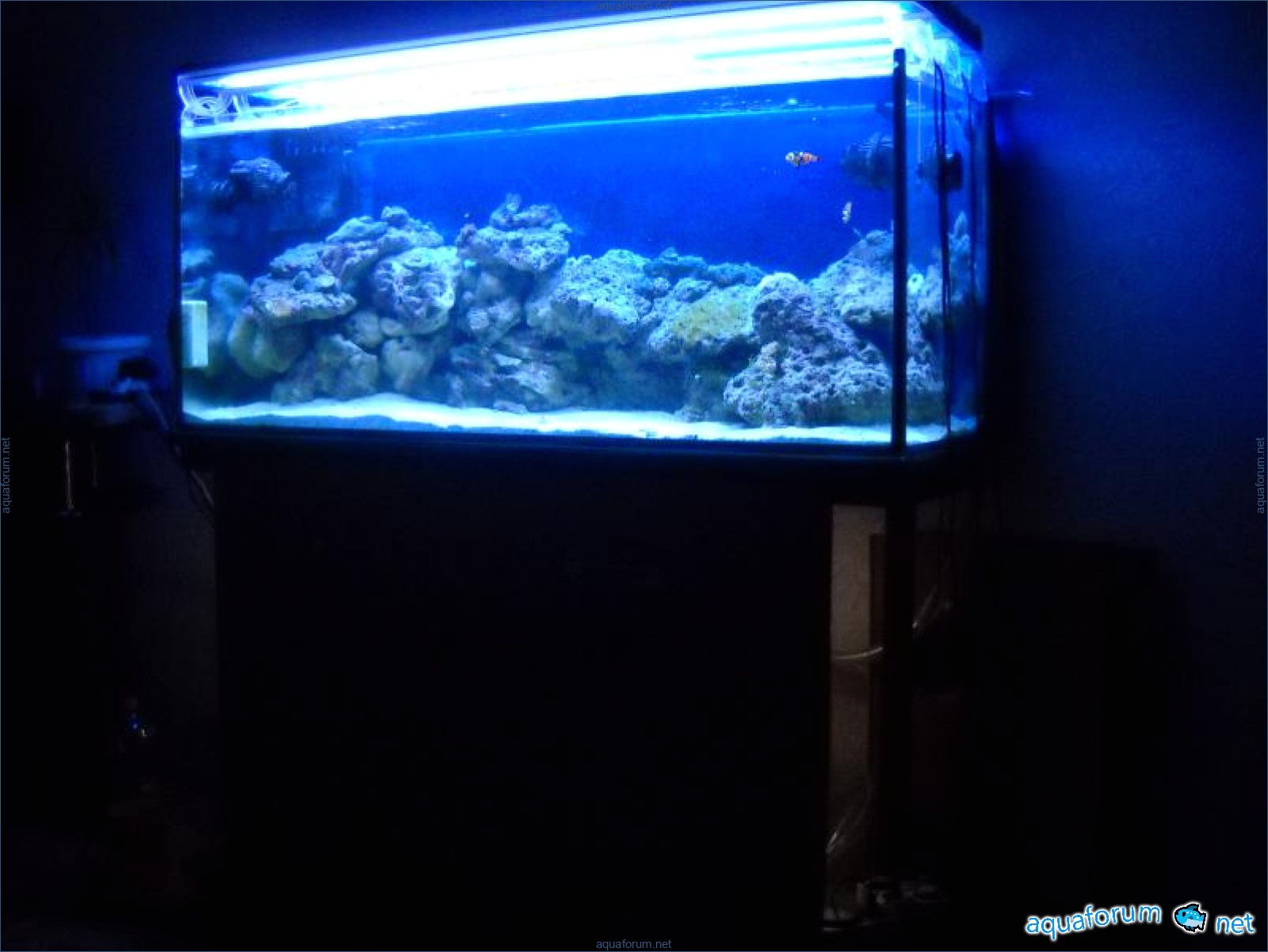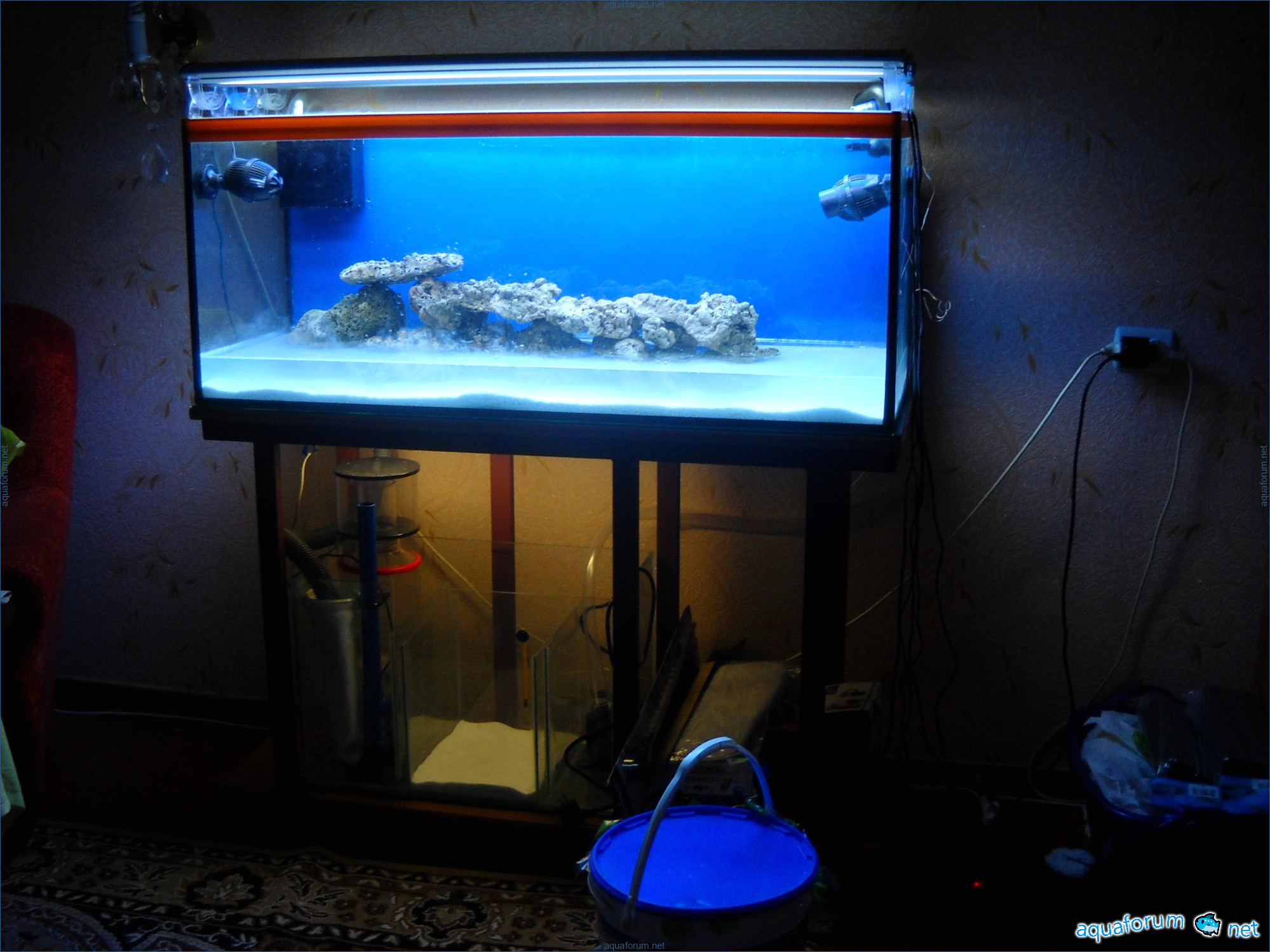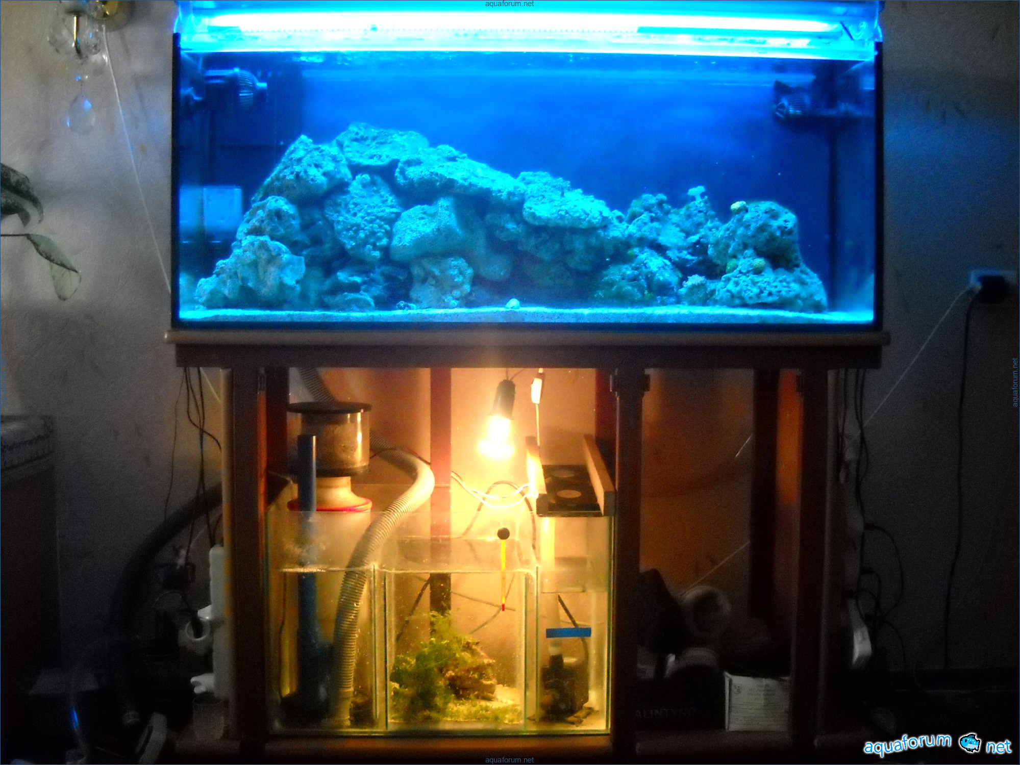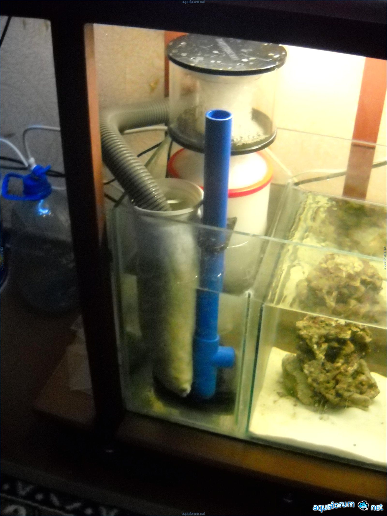 Hello everyone, dear forum participants! I have finally collected all the components to launch a marine aquarium. So, it consists of: Aquarium: 1200x400x500H (former freshwater); had to cut off a piece of the back stiffeningrib on one side for the overflow installation (cut with a metal hacksaw with a tungsten blade). Sump: 600x300x400H Lighting: 3 SunSun HDD-1200B lamps, 2x54W T5, 3 white bulbs, 3 blue. Reverse osmosis: 6-stage reverse osmosis system with a pump and AURO-50P-16+M + 2K + 2 resin cartridges. Salt: Tetra Marine (will fill the osmosis and mix in the sump) Overflow: Eshopps PF 300 Protein skimmer: Bubble Magnus BM-110 Drain hose: Eshopps filter sock Flow: 1 x sun sun 3000 l/h, 1 x 5000 l/h Return pump: Viaaqua 1800 Live rock - 7 kg, Dry rock - 25 kg, Sand - 15-18 kg approximately. That's all for now. Photo description: 1,2 - sump gluing; 3 - frame; The rest of the photos up to the cat show the current state of the aquarium; 15, 16 - sump gluing; 17 - sump testing; Further - the chronology of the work done. Gluing the chipboard to the frame, installing the aqu
