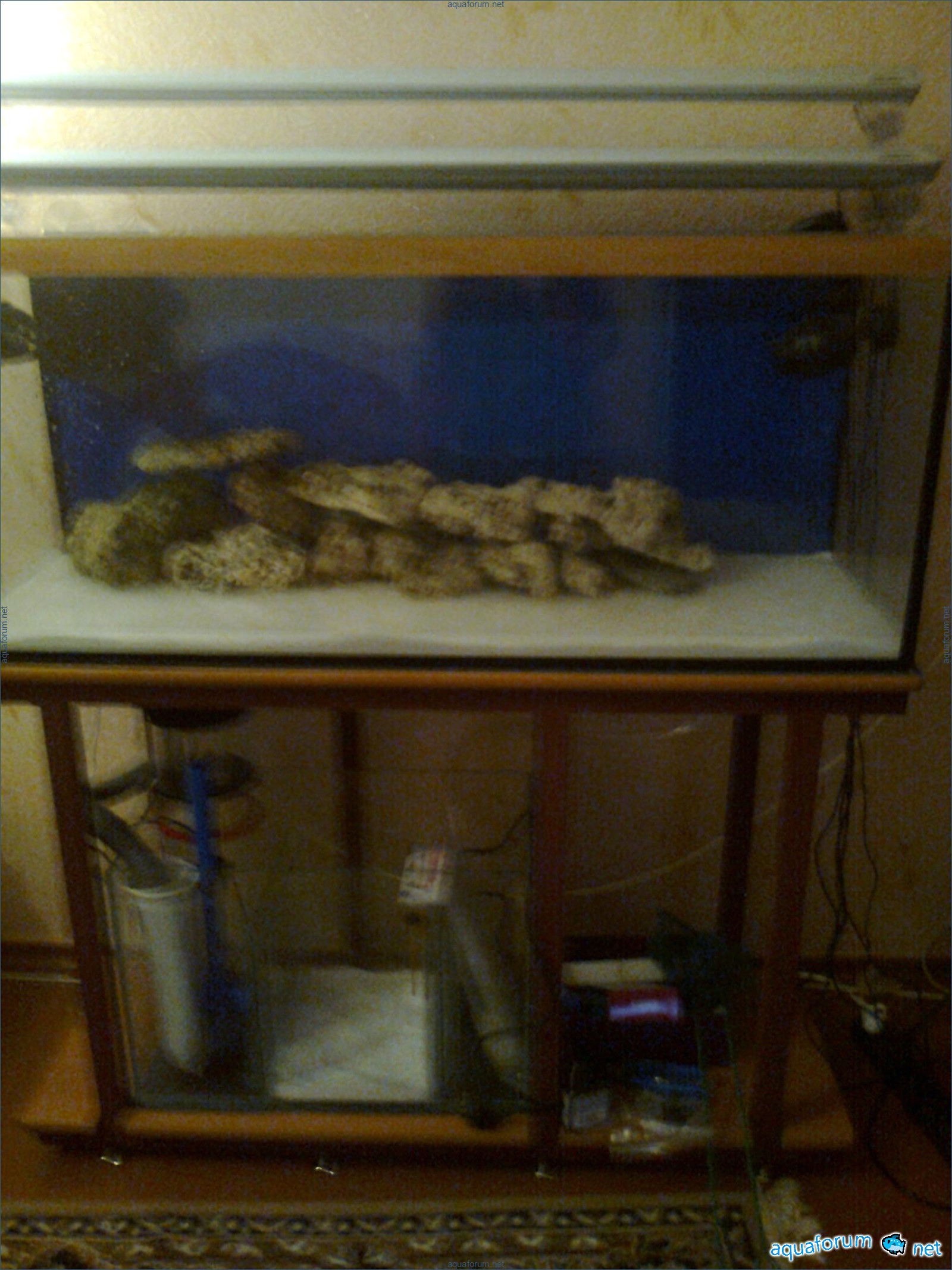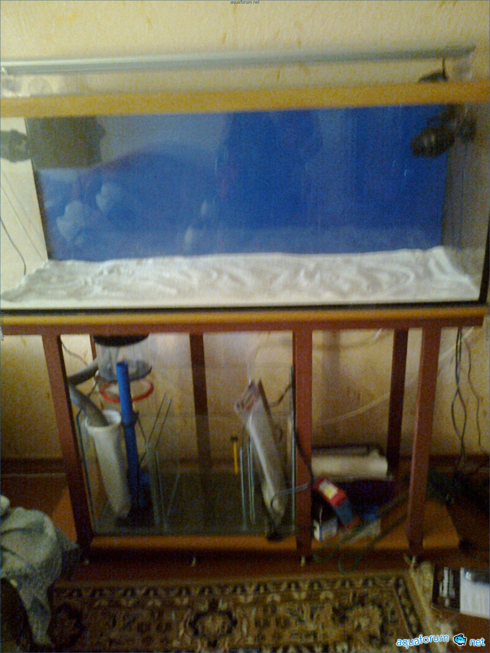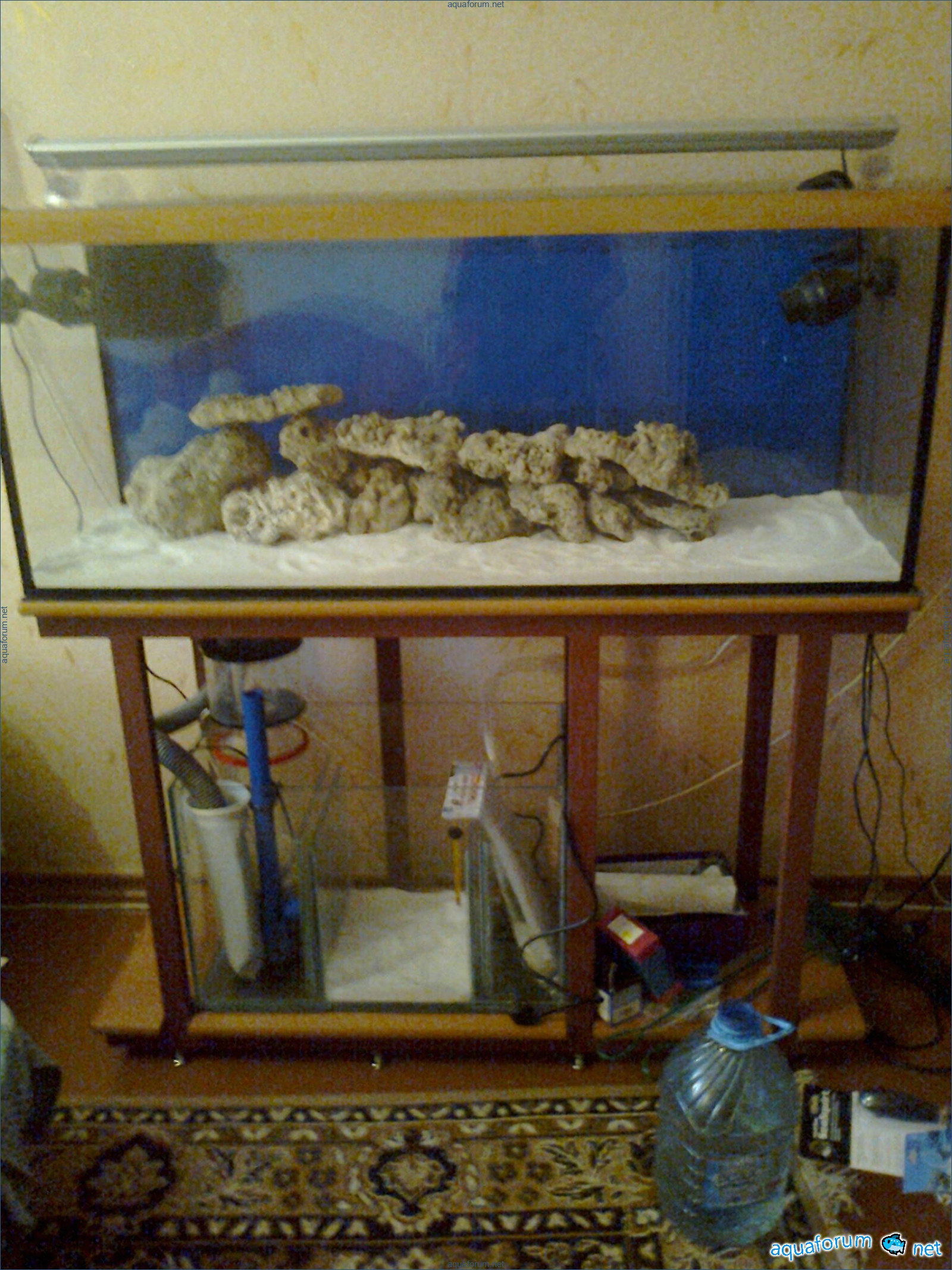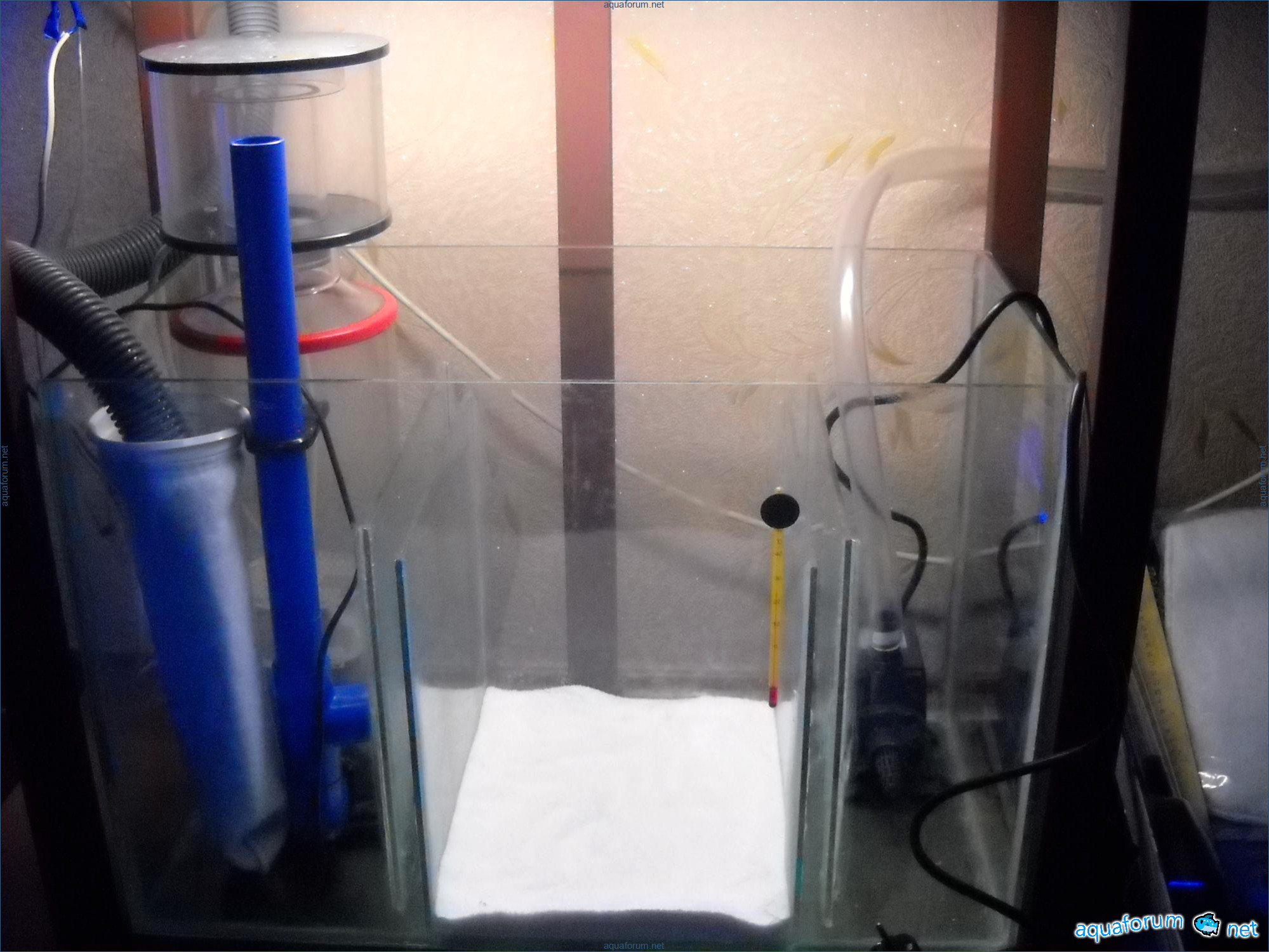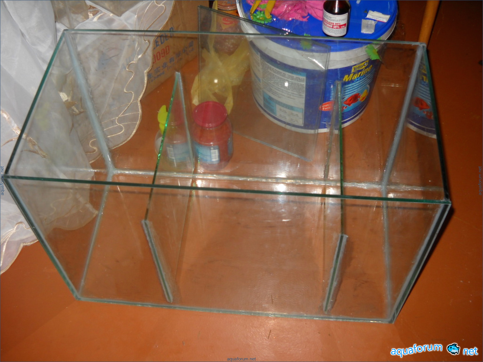 Hello everyone, dear forum participants! I have finally collected all the components to launch a marine aquarium. So, it consists of: Aquarium: 1200x400x500H (former freshwater); had to cut off a piece of the back stiffeningrib on one side for the overflow installation (cut with a metal hacksaw with a tungsten blade). Sump: 600x300x400H Lighting: 3 SunSun HDD-1200B lamps, 2x54W T5, 3 white bulbs, 3 blue. Reverse osmosis: 6-stage reverse osmosis system with a pump and AURO-50P-16+M + 2K + 2 resin cartridges. Salt: Tetra Marine (will fill the osmosis and mix in the sump) Overflow: Eshopps PF 300 Protein skimmer: Bubble Magnus BM-110 Drain hose: Eshopps filter sock Flow: 1 x sun sun 3000 l/h, 1 x 5000 l/h Return pump: Viaaqua 1800 Live rock - 7 kg, Dry rock - 25 kg, Sand - 15-18 kg approximately. That's all for now. Photo description: 1,2 - sump gluing; 3 - frame; The rest of the photos up to the cat show the current state of the aquarium; 15, 16 - sump gluing; 17 - sump testing; Further - the chronology of the work done. Gluing the chipboard to the frame, installing the aqu