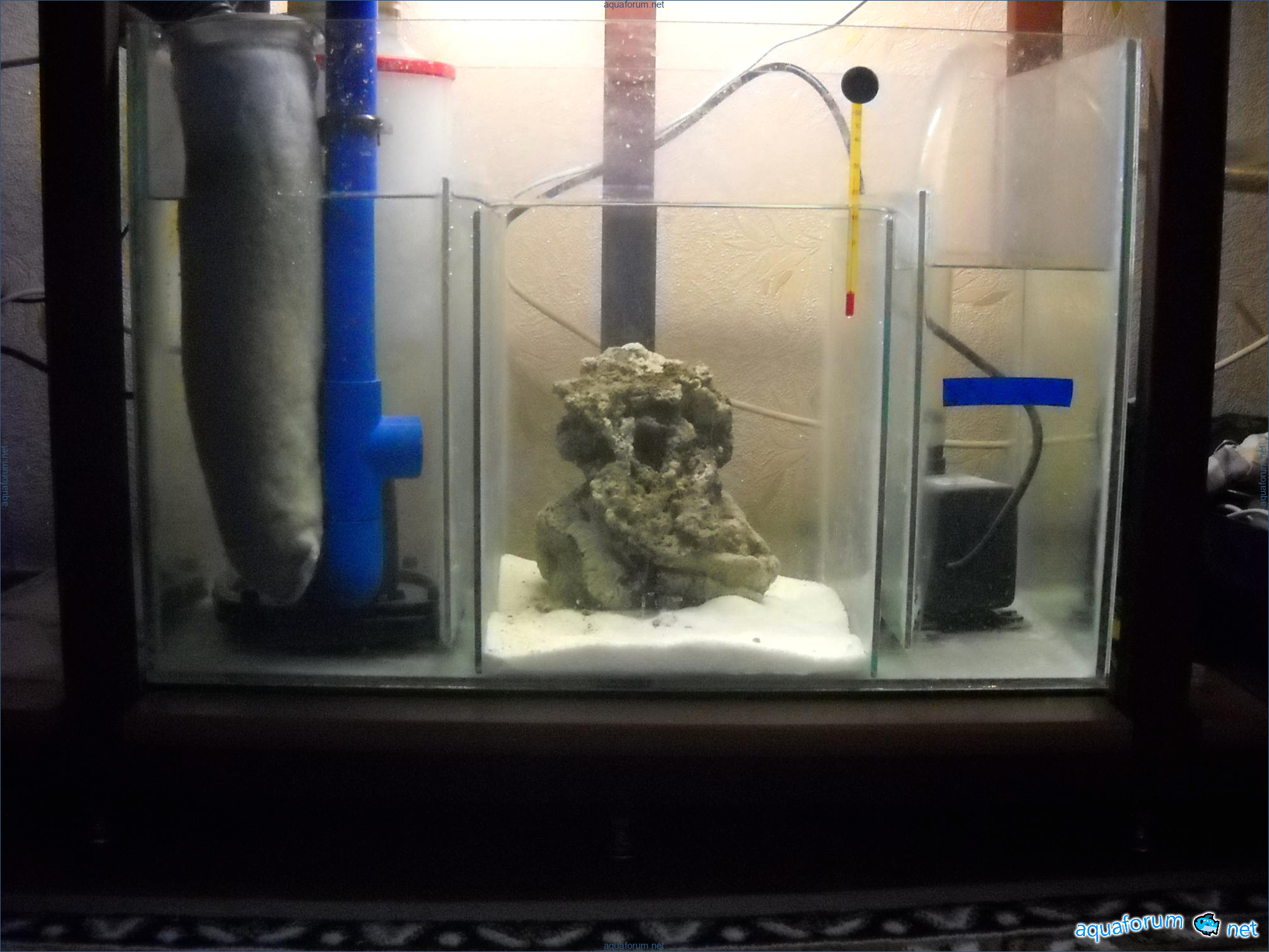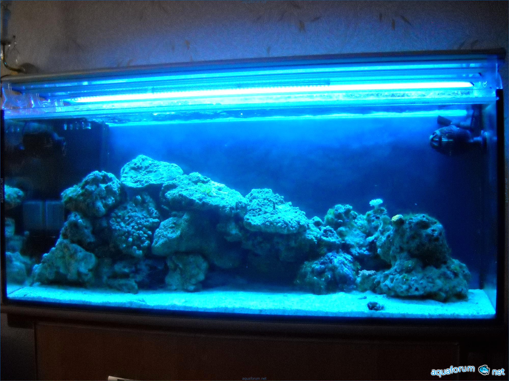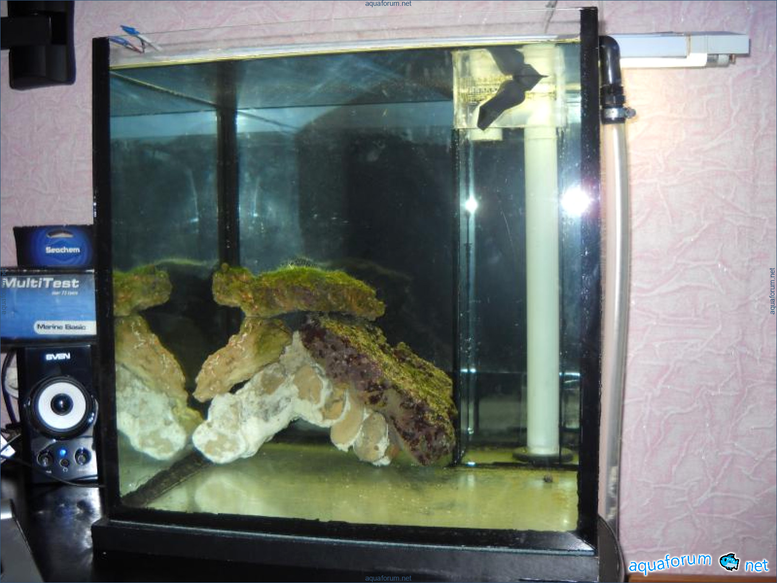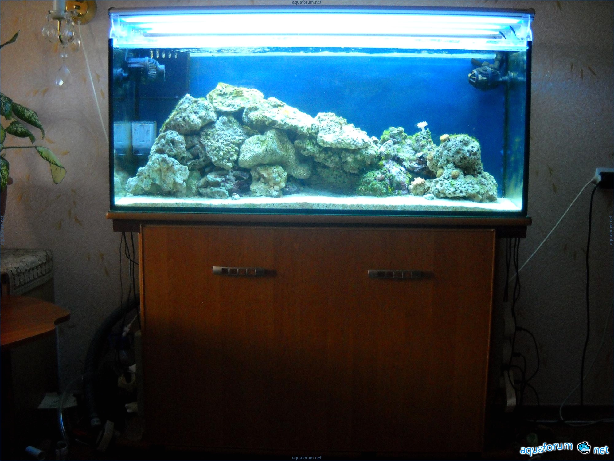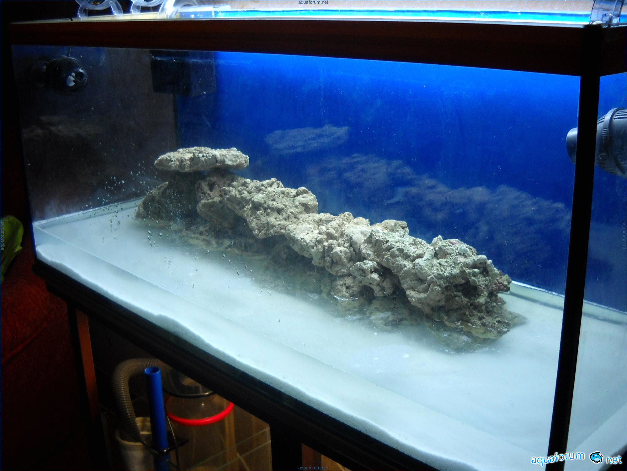 Hello everyone, dear forum participants! I have finally collected all the components to launch a marine aquarium. So, it consists of: Aquarium: 1200x400x500H (former freshwater); had to cut off a piece of the back stiffeningrib on one side for the overflow installation (cut with a metal hacksaw with a tungsten blade). Sump: 600x300x400H Lighting: 3 SunSun HDD-1200B lamps, 2x54W T5, 3 white bulbs, 3 blue. Reverse osmosis: 6-stage reverse osmosis system with a pump and AURO-50P-16+M + 2K + 2 resin cartridges. Salt: Tetra Marine (will fill the osmosis and mix in the sump) Overflow: Eshopps PF 300 Protein skimmer: Bubble Magnus BM-110 Drain hose: Eshopps filter sock Flow: 1 x sun sun 3000 l/h, 1 x 5000 l/h Return pump: Viaaqua 1800 Live rock - 7 kg, Dry rock - 25 kg, Sand - 15-18 kg approximately. That's all for now. Photo description: 1,2 - sump gluing; 3 - frame; The rest of the photos up to the cat show the current state of the aquarium; 15, 16 - sump gluing; 17 - sump testing; Further - the chronology of the work done. Gluing the chipboard to the frame, installing the aqu