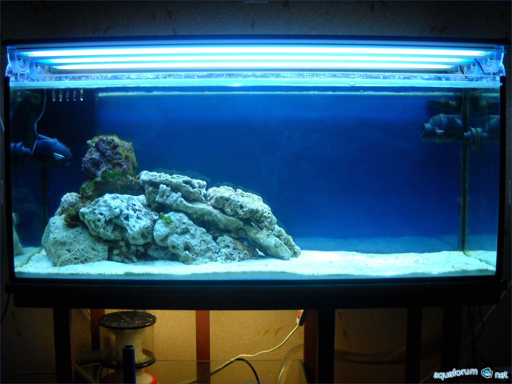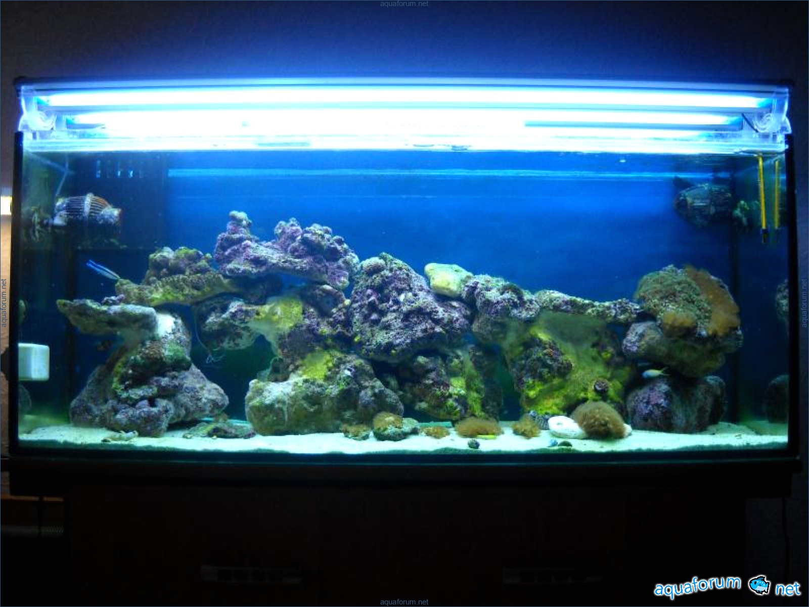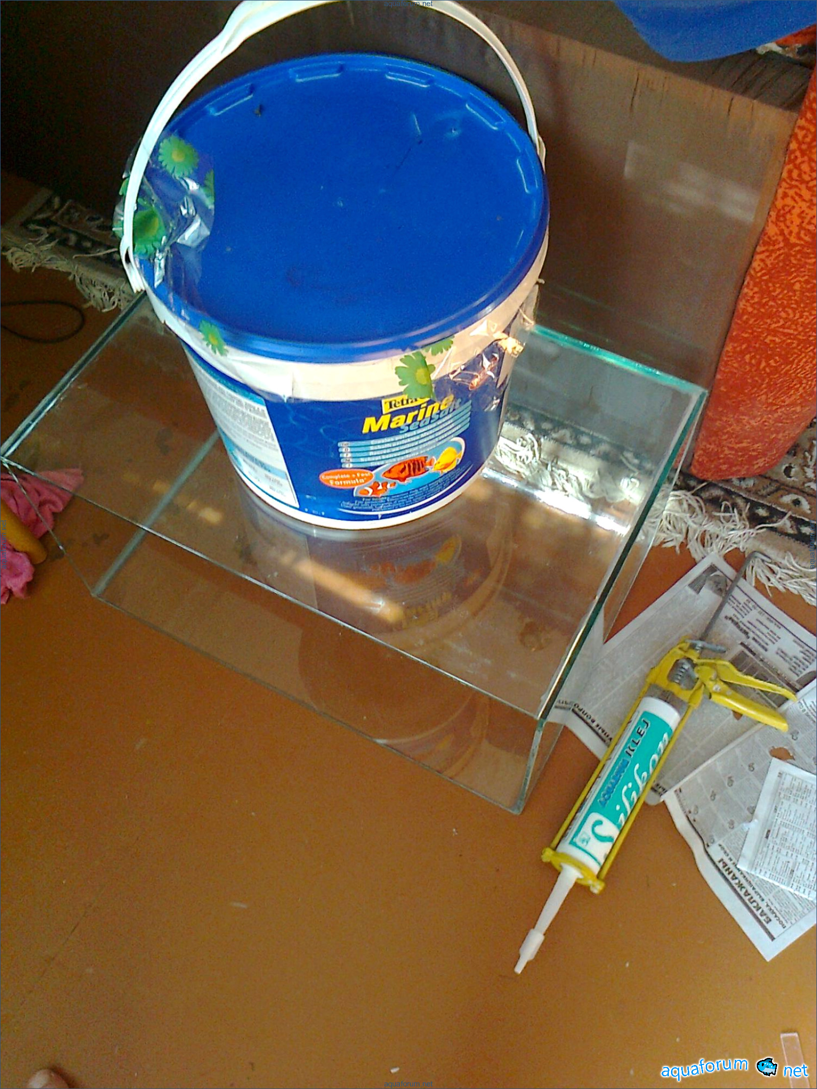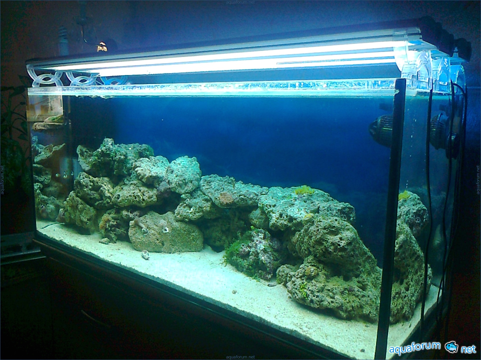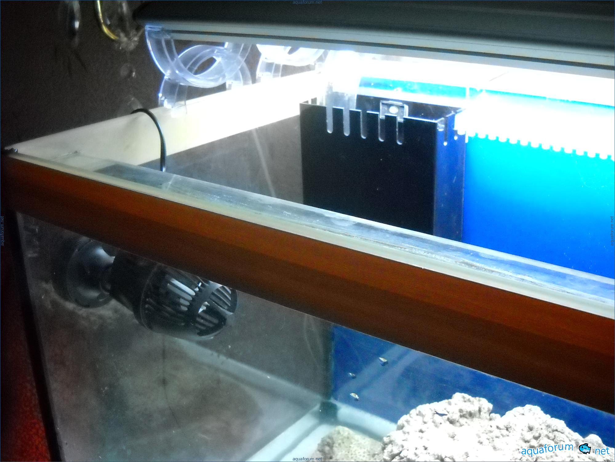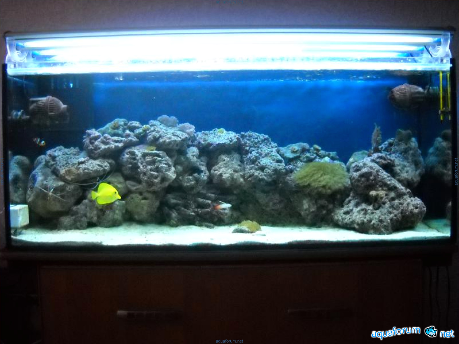 Hello everyone, dear forum participants! I have finally collected all the components to launch a marine aquarium. So, it consists of: Aquarium: 1200x400x500H (former freshwater); had to cut off a piece of the back stiffeningrib on one side for the overflow installation (cut with a metal hacksaw with a tungsten blade). Sump: 600x300x400H Lighting: 3 SunSun HDD-1200B lamps, 2x54W T5, 3 white bulbs, 3 blue. Reverse osmosis: 6-stage reverse osmosis system with a pump and AURO-50P-16+M + 2K + 2 resin cartridges. Salt: Tetra Marine (will fill the osmosis and mix in the sump) Overflow: Eshopps PF 300 Protein skimmer: Bubble Magnus BM-110 Drain hose: Eshopps filter sock Flow: 1 x sun sun 3000 l/h, 1 x 5000 l/h Return pump: Viaaqua 1800 Live rock - 7 kg, Dry rock - 25 kg, Sand - 15-18 kg approximately. That's all for now. Photo description: 1,2 - sump gluing; 3 - frame; The rest of the photos up to the cat show the current state of the aquarium; 15, 16 - sump gluing; 17 - sump testing; Further - the chronology of the work done. Gluing the chipboard to the frame, installing the aqu