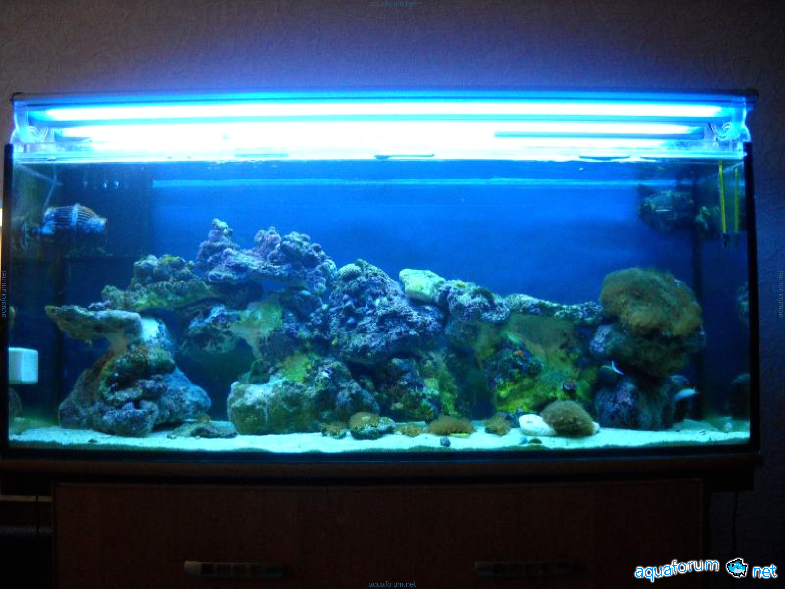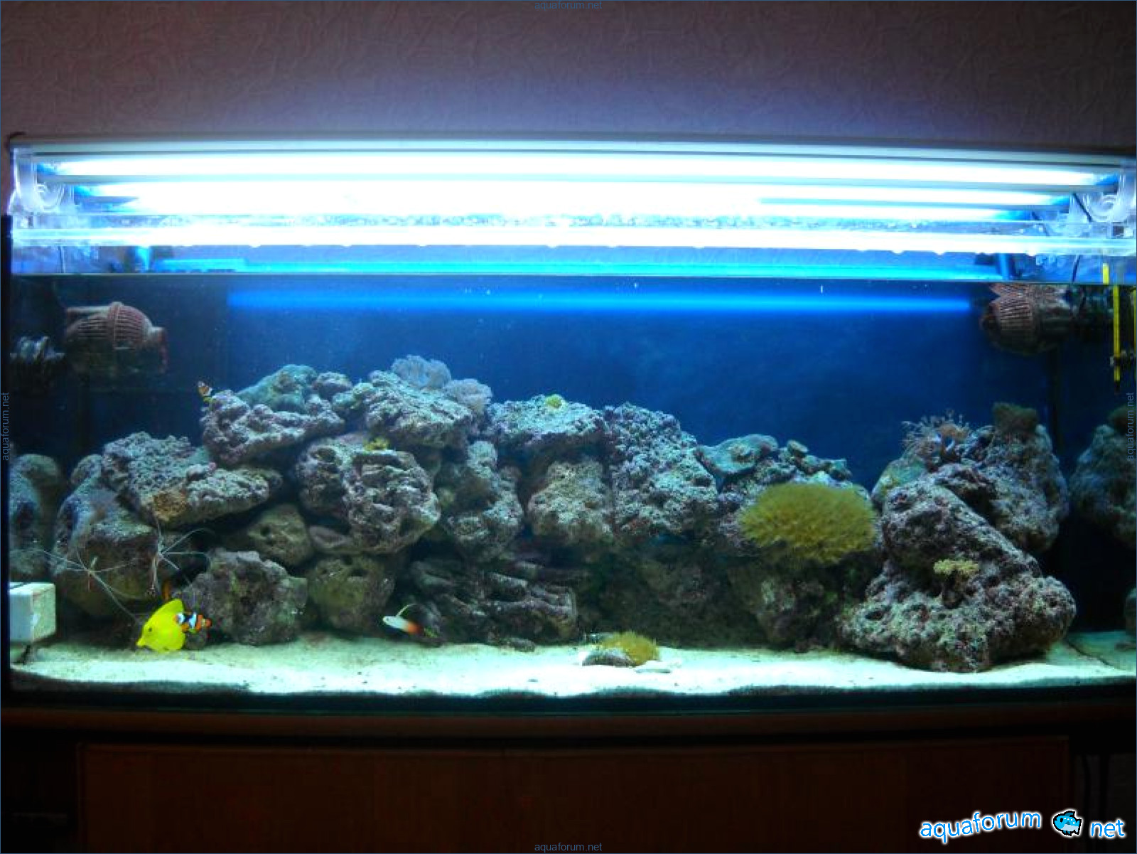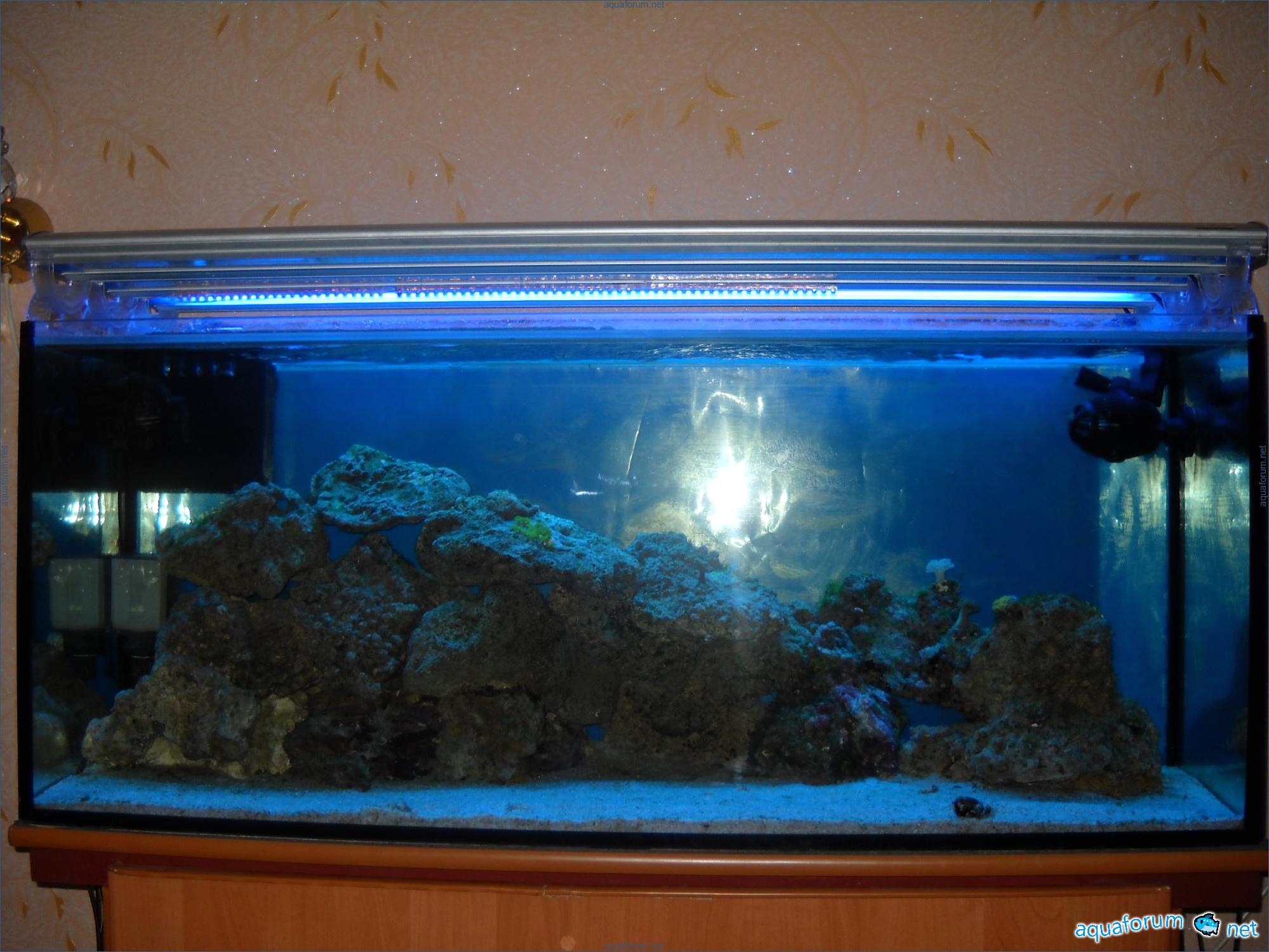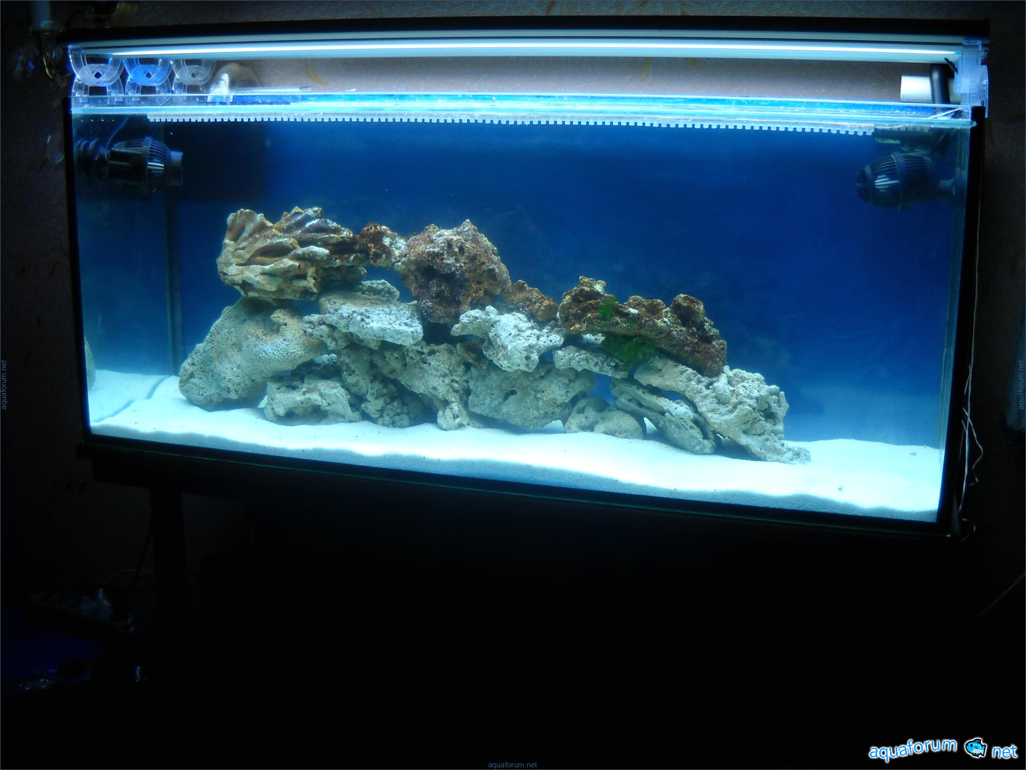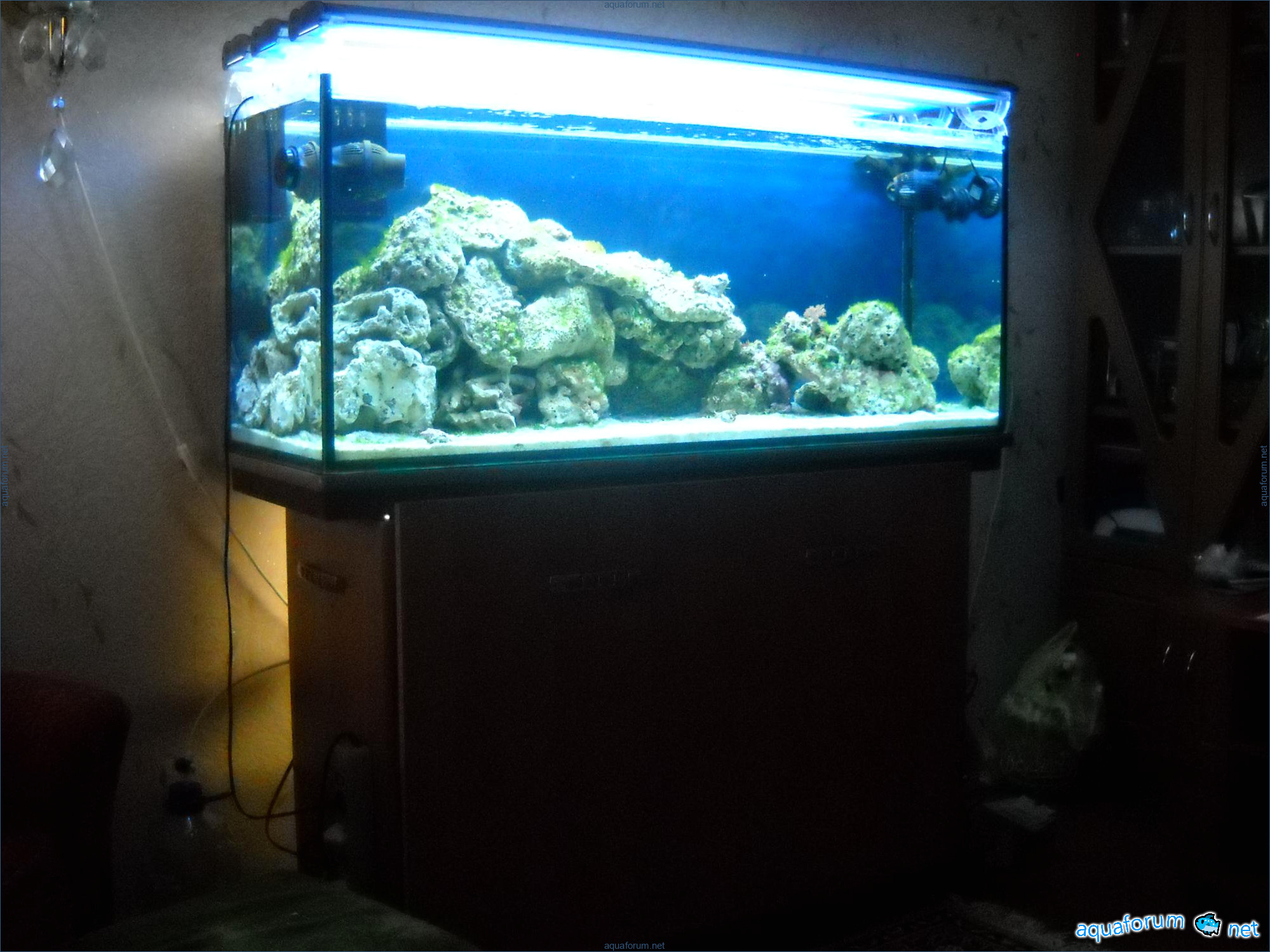 Hello everyone, dear forum participants! I have finally collected all the components to launch a marine aquarium. So, it consists of: Aquarium: 1200x400x500H (former freshwater); had to cut off a piece of the back stiffeningrib on one side for the overflow installation (cut with a metal hacksaw with a tungsten blade). Sump: 600x300x400H Lighting: 3 SunSun HDD-1200B lamps, 2x54W T5, 3 white bulbs, 3 blue. Reverse osmosis: 6-stage reverse osmosis system with a pump and AURO-50P-16+M + 2K + 2 resin cartridges. Salt: Tetra Marine (will fill the osmosis and mix in the sump) Overflow: Eshopps PF 300 Protein skimmer: Bubble Magnus BM-110 Drain hose: Eshopps filter sock Flow: 1 x sun sun 3000 l/h, 1 x 5000 l/h Return pump: Viaaqua 1800 Live rock - 7 kg, Dry rock - 25 kg, Sand - 15-18 kg approximately. That's all for now. Photo description: 1,2 - sump gluing; 3 - frame; The rest of the photos up to the cat show the current state of the aquarium; 15, 16 - sump gluing; 17 - sump testing; Further - the chronology of the work done. Gluing the chipboard to the frame, installing the aqu