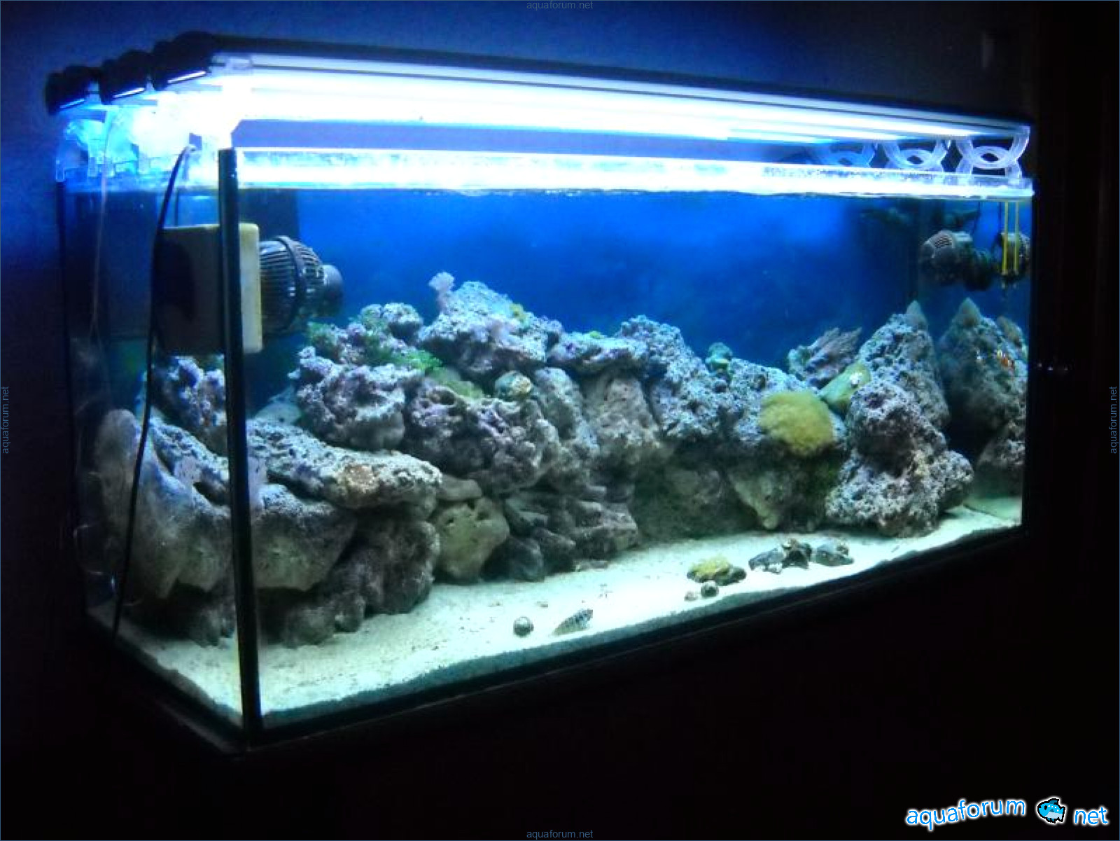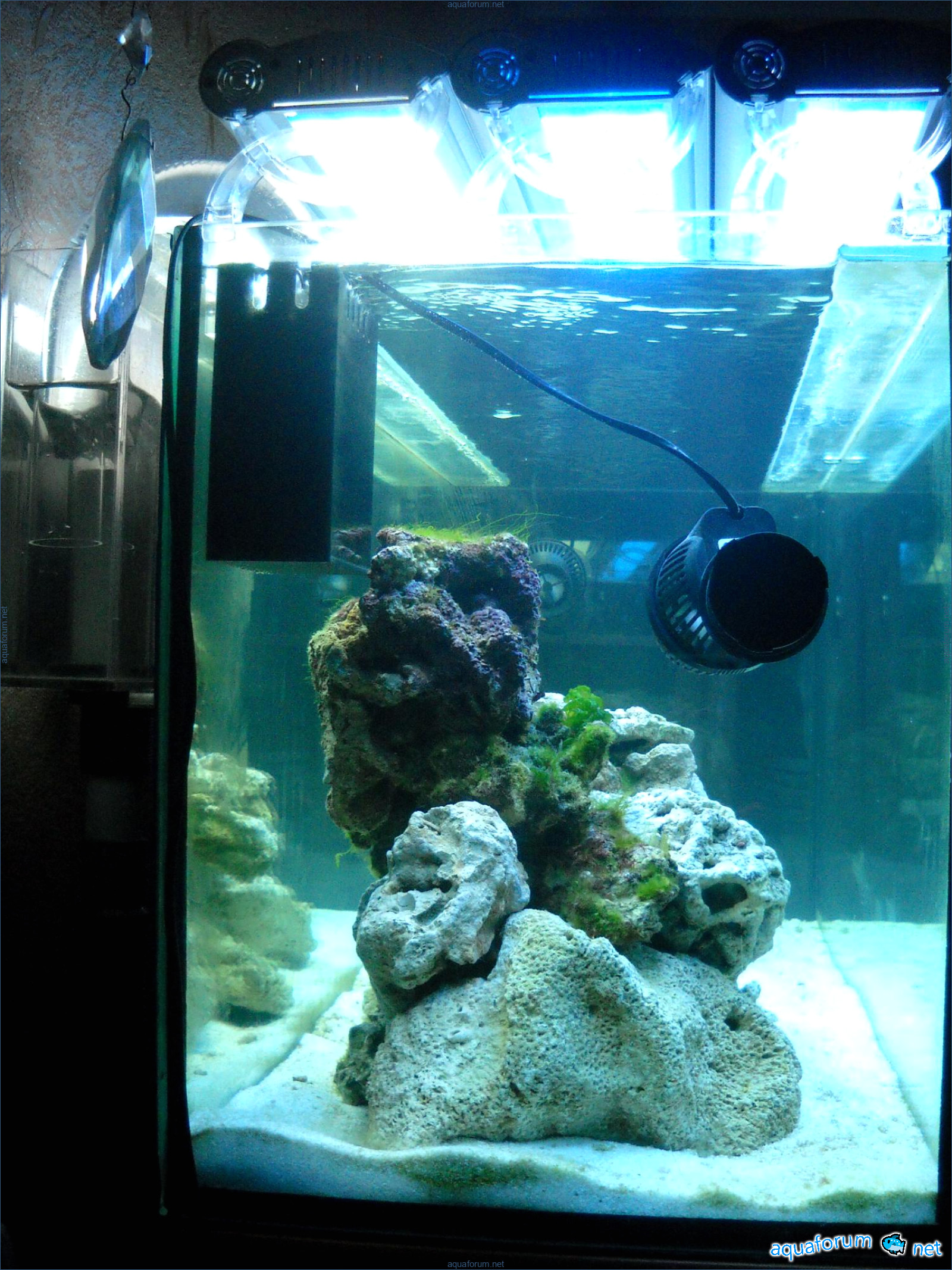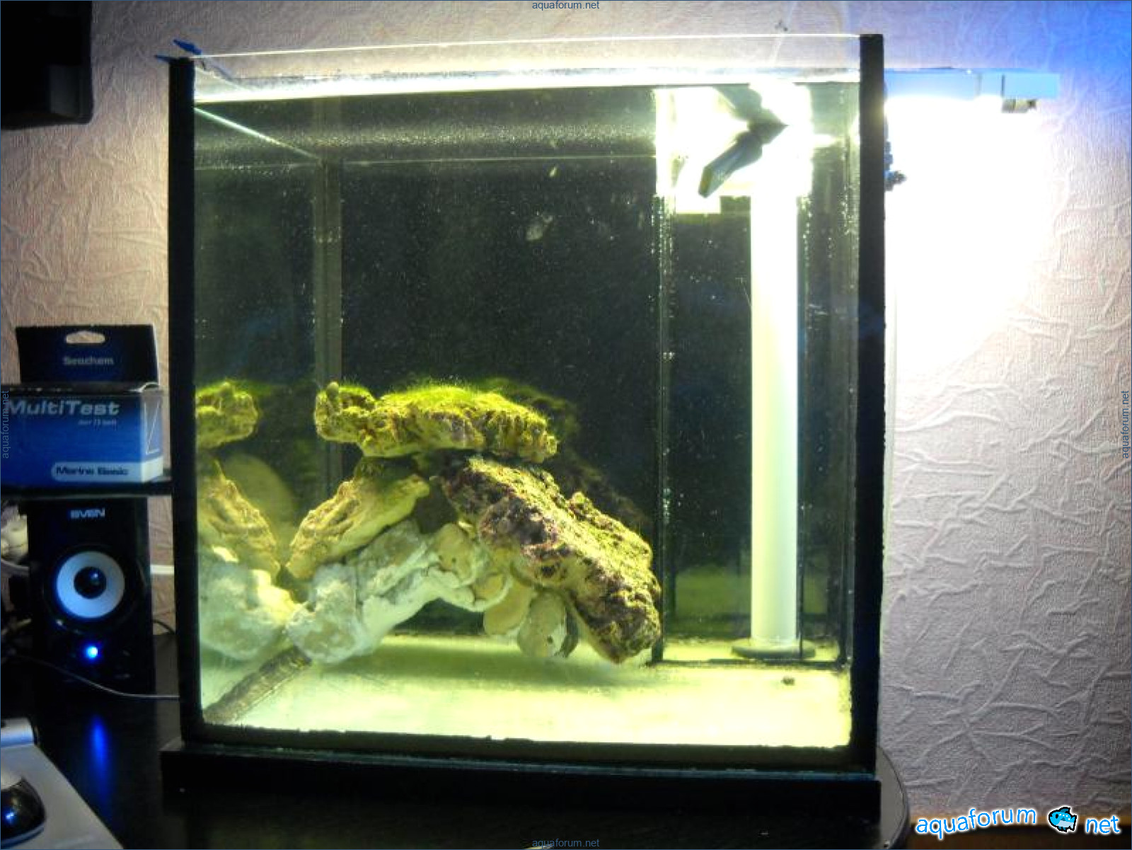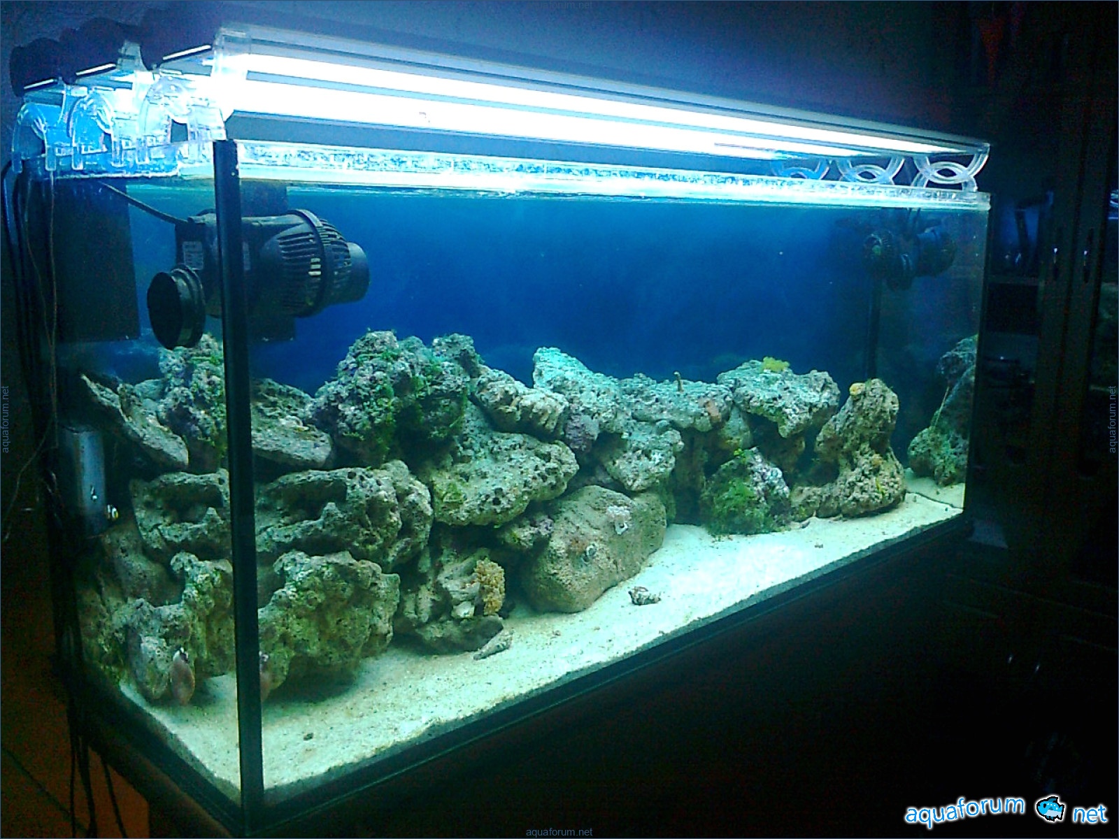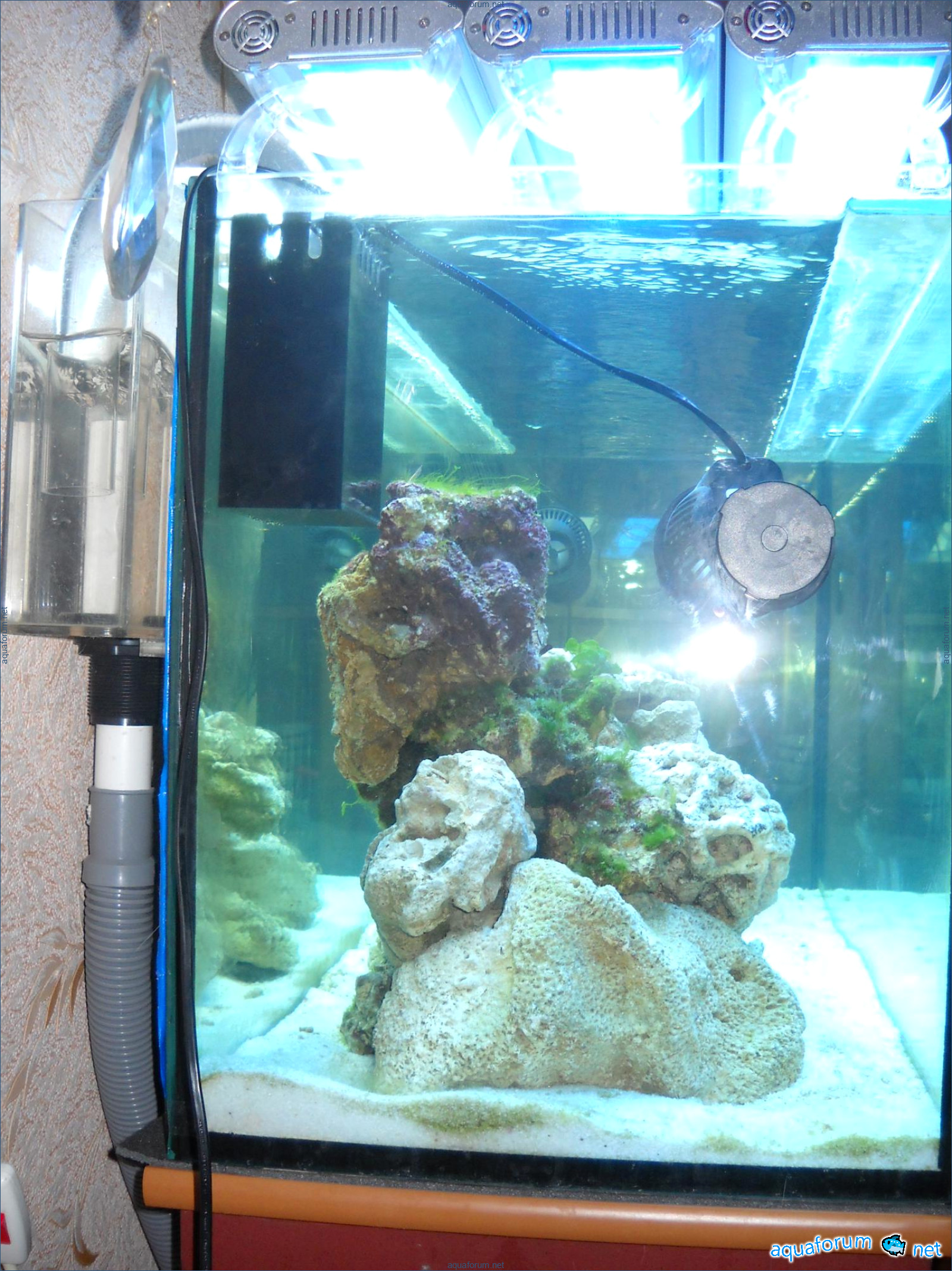 Hello everyone, dear forum participants! I have finally collected all the components to launch a marine aquarium. So, it consists of: Aquarium: 1200x400x500H (former freshwater); had to cut off a piece of the back stiffeningrib on one side for the overflow installation (cut with a metal hacksaw with a tungsten blade). Sump: 600x300x400H Lighting: 3 SunSun HDD-1200B lamps, 2x54W T5, 3 white bulbs, 3 blue. Reverse osmosis: 6-stage reverse osmosis system with a pump and AURO-50P-16+M + 2K + 2 resin cartridges. Salt: Tetra Marine (will fill the osmosis and mix in the sump) Overflow: Eshopps PF 300 Protein skimmer: Bubble Magnus BM-110 Drain hose: Eshopps filter sock Flow: 1 x sun sun 3000 l/h, 1 x 5000 l/h Return pump: Viaaqua 1800 Live rock - 7 kg, Dry rock - 25 kg, Sand - 15-18 kg approximately. That's all for now. Photo description: 1,2 - sump gluing; 3 - frame; The rest of the photos up to the cat show the current state of the aquarium; 15, 16 - sump gluing; 17 - sump testing; Further - the chronology of the work done. Gluing the chipboard to the frame, installing the aqu