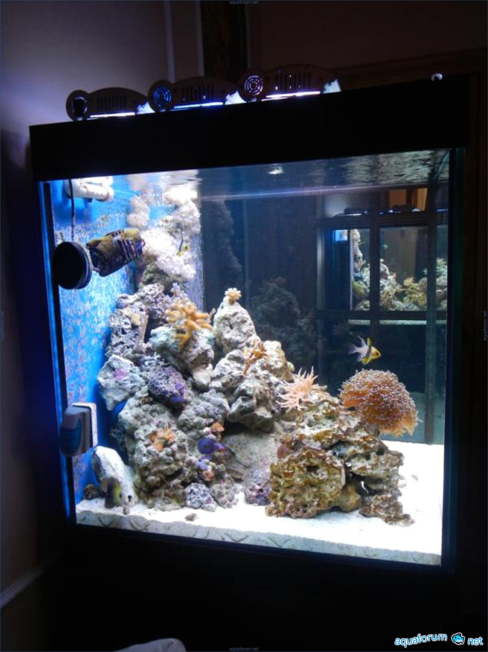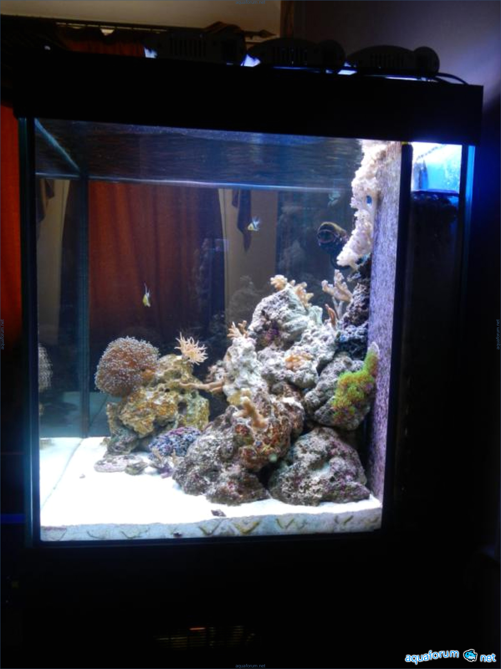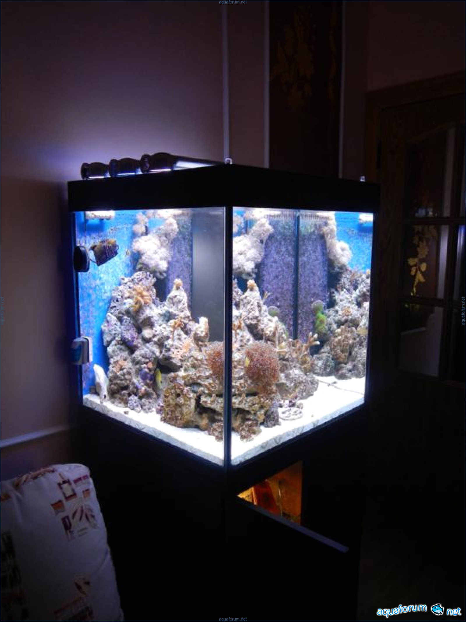 The total volume of the system is approximately 300 liters. The tank dimensions are 60x60x60 cm. The scm. The sump dimensions are 45x45x50 cm. The plan is to have an LPS, SPS (small-polyp stony) reef, but time will tell. The live rock load is around 35 kg. There are many small rocks, and it's challenging to build a good, stable rock structure. The lighting is T5, 6x24w Sylvania lamps: 2 CORALSTAR, 1 AQUASTAR, 2 MARINSTAR, 1 Gro-Lu, turned on in pairs. The skimmer is a Reef Octopus (the model is unfortunately not remembered). The return pump is a Hydor Seltz L40. The circulation pump is an Aquael Reef