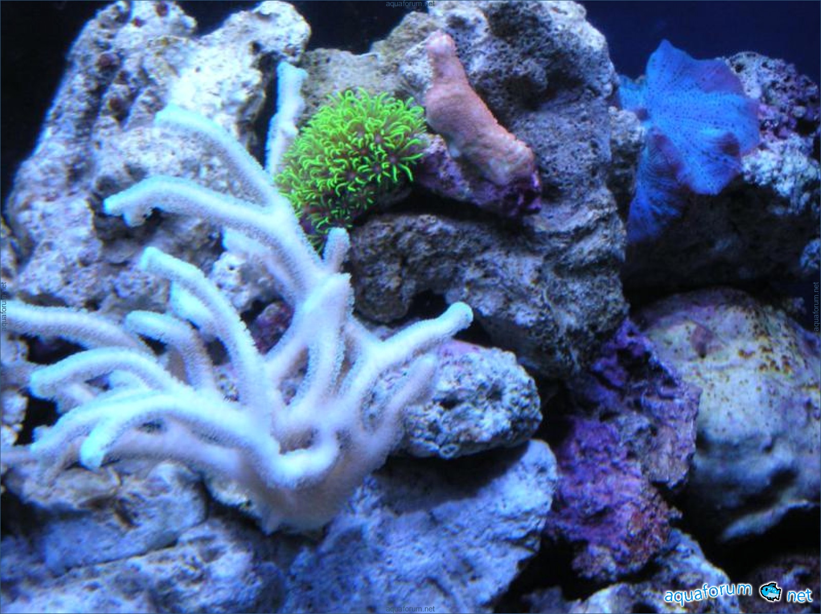 Hello everyone! A month ago, I launched an aquarium. The parameters are as follows: Size: 42x38x38 (W H D) (about 45 liters of water) Lighting: 3 collar lamps. One of them with a controller. Protein skimmer: Aqua medic turboflotor 500 Wave maker: hydor LCD (live rock): 9kg Salt: coral pro salt When launching the aquarium and setting up the rocks, I the rocks, I considered several points. - The less the rocks touch the sand, the better. With the right current, less dirt will accumulate. - There should be caves and depressions for the fish to hide in. - The rock pile is located at a distance from the side walls. This is an important point for me in terms of the convenience of cleaning the glasses in the future. - For the first week, the duration of the day was no more than 8 hours, so that algae would not start growing. Instead of 3 lamps, only one was turned on. The aquarium only had rocks. Over the course of the second week, I gradually transferred corals from a small aquarium to the new one. I watched how they felt. When the condition was not pleasing, I replaced the water, after which I transferred other corals. I am now satisfied with the condition of the aquarium. There is no algae, and the corals are doing well and growing. Two days ago, I bought ocellaris and a shrimp. I have not added or purchased any additives yet, as I am still learning about them. Most of the corals are currently not in their proper places. The aquarium is one month ol