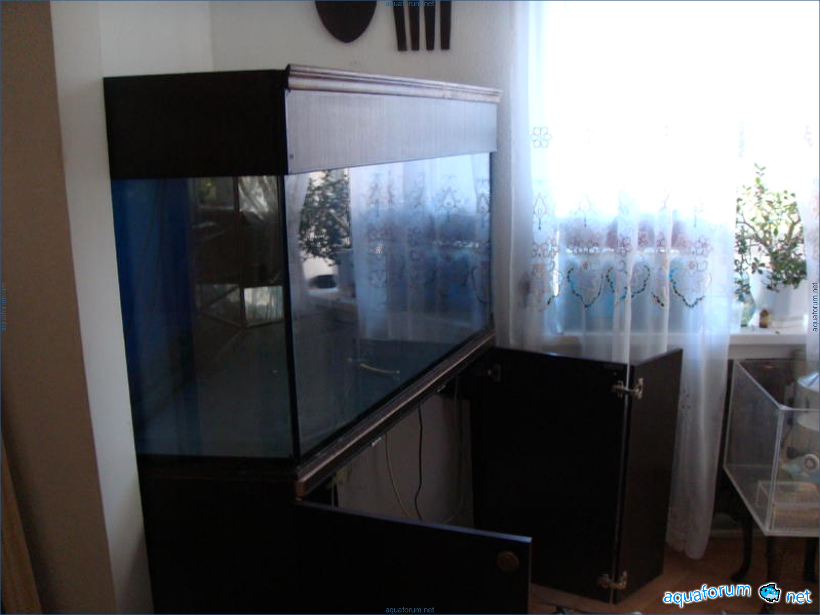 Hello!!! Welcome to the community... I've long wanted to create a topic, but I've been hesitant - sometimes I don't have time, sometimes the thoughts don't come... and in general, there's not much to show... But if N.V. Gogol hadn't written about the Myrhorod puddle, no one would have known about its existence... and now a sea puddle in my performance... I hope with God's help and the help of the forum members, it will turn into a real sea...So, the aquarium was made to order by Vitaliy Aqua-city according to my dimensions. The front glass is Optiwhite, with stiffening ribs. One tie, 10mm glass. The aquarium is corner-shaped, but with irregular dimensions - it was dictated by the place for it - length 130cm, width on the left side 40cm, on the right 80cm, display - front glass - 50 inches.