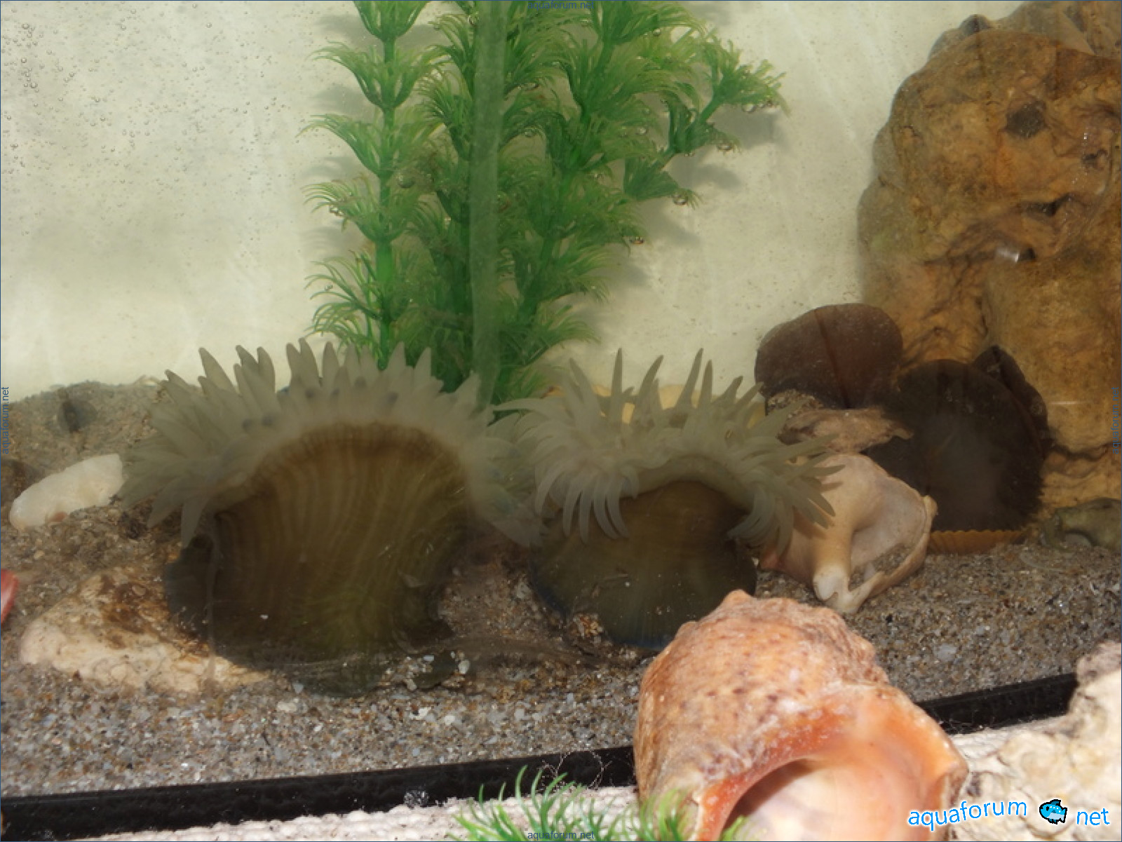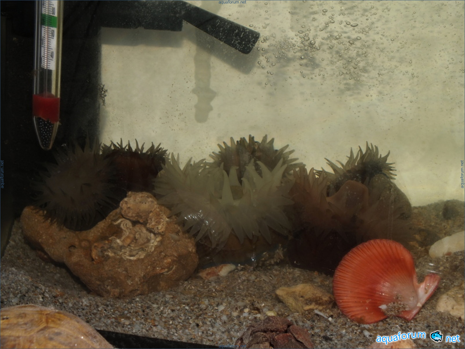Hello everyone! A year ago, I brought 3 anemones (horse, if I'm not mistaken), a hermit crab, and mussels from the Black Sea. Quickly realizing that they wouldn't survive without filters and an aquarium, I bought a 19L aquarium and an Aquael Pat Mini Filter air filter. I also acquired a thermometer to measure the temperature, marine aquarium salt, and T i 2 water additives. After a month, the hermit crab died, but the anemones continued to live. This summer, I brought another 11 anemones, 3 crabs, and 1 hermit crab. Currently, the anemones are healthy and content, two stone crabs have eaten the sand crab, and the hermit crab continues to diligently clean the sand. In their free time from eating, the crabs completely change the appearance of the aquarium and burrow passages under the rocks. I decided to post on the forum because 4 (or maybe more) small anemones were born, which in my opinion means the aquarium is suitable for habitation. In the near future, I plan to order lighting, as I