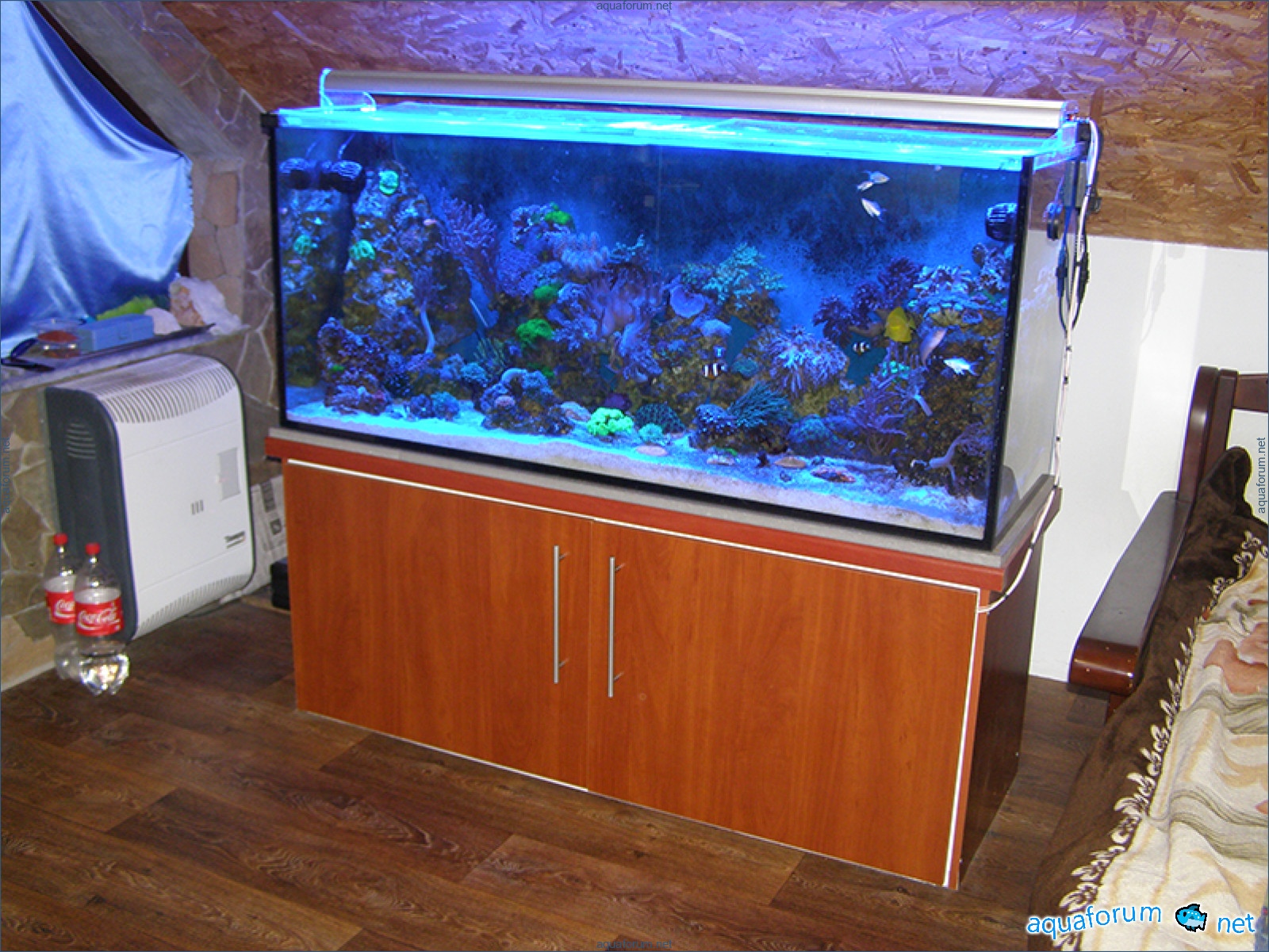 Hello! Aquarium: 150x50x65 walls 10mm SUMP: 110x40x40 (skimmer, algae reactor) Lighting: profile BPO-3373, LEDs 260W, 4 channels (blue + cyan, green, white, UF) Controller: Return: Jebao DCT-6000 Flow: 2 pcs Jebao RW-8 Automatic Doser: JEBAO DP-3 Skimmer: NOX Cabinet - welded frame pipe 20x40, lined with laminated particleboard. Lid - 40mm countertop and foam. Salted in August 2015. Half a year has passed. C.R.K. (dry reef stones), before launching, stacked and poured water with replacement. It lay slightly less than a year. Disassembled stones from three other tanks and made a large aquarium. Thanks to this, the