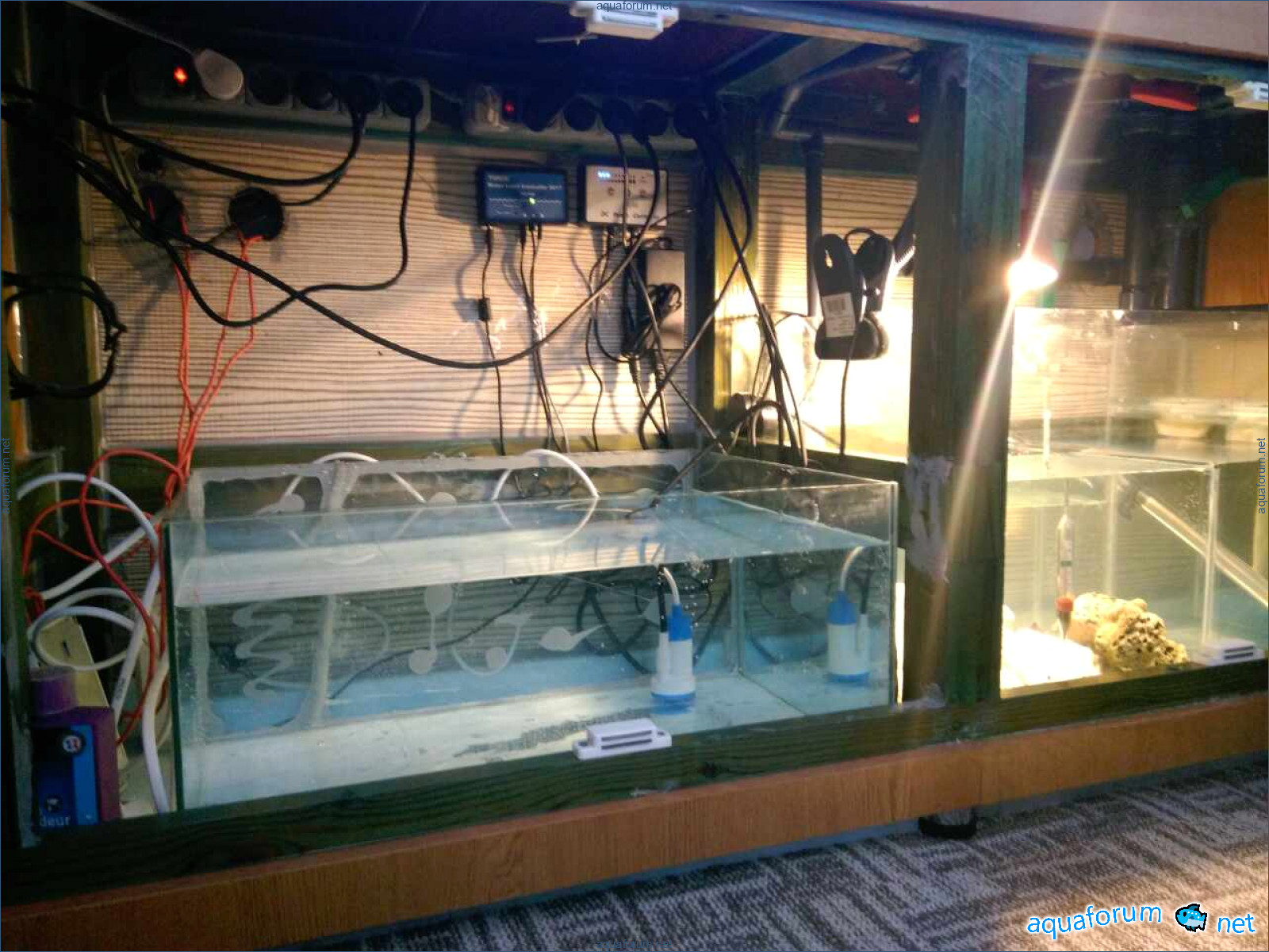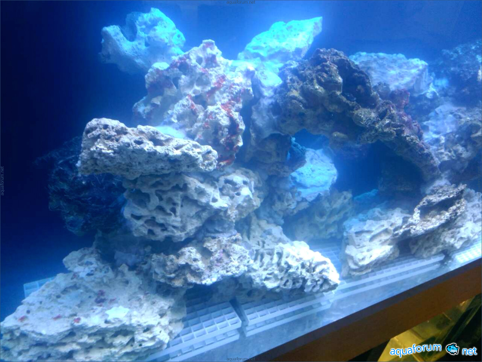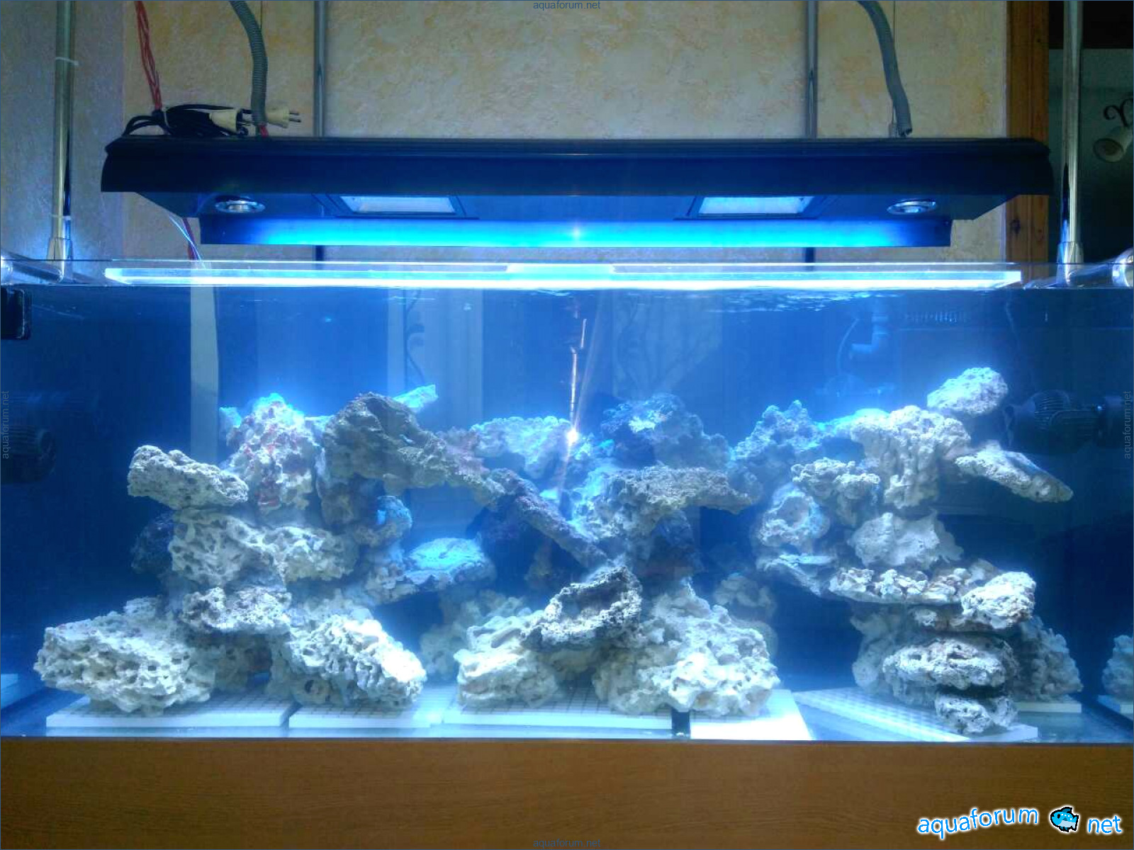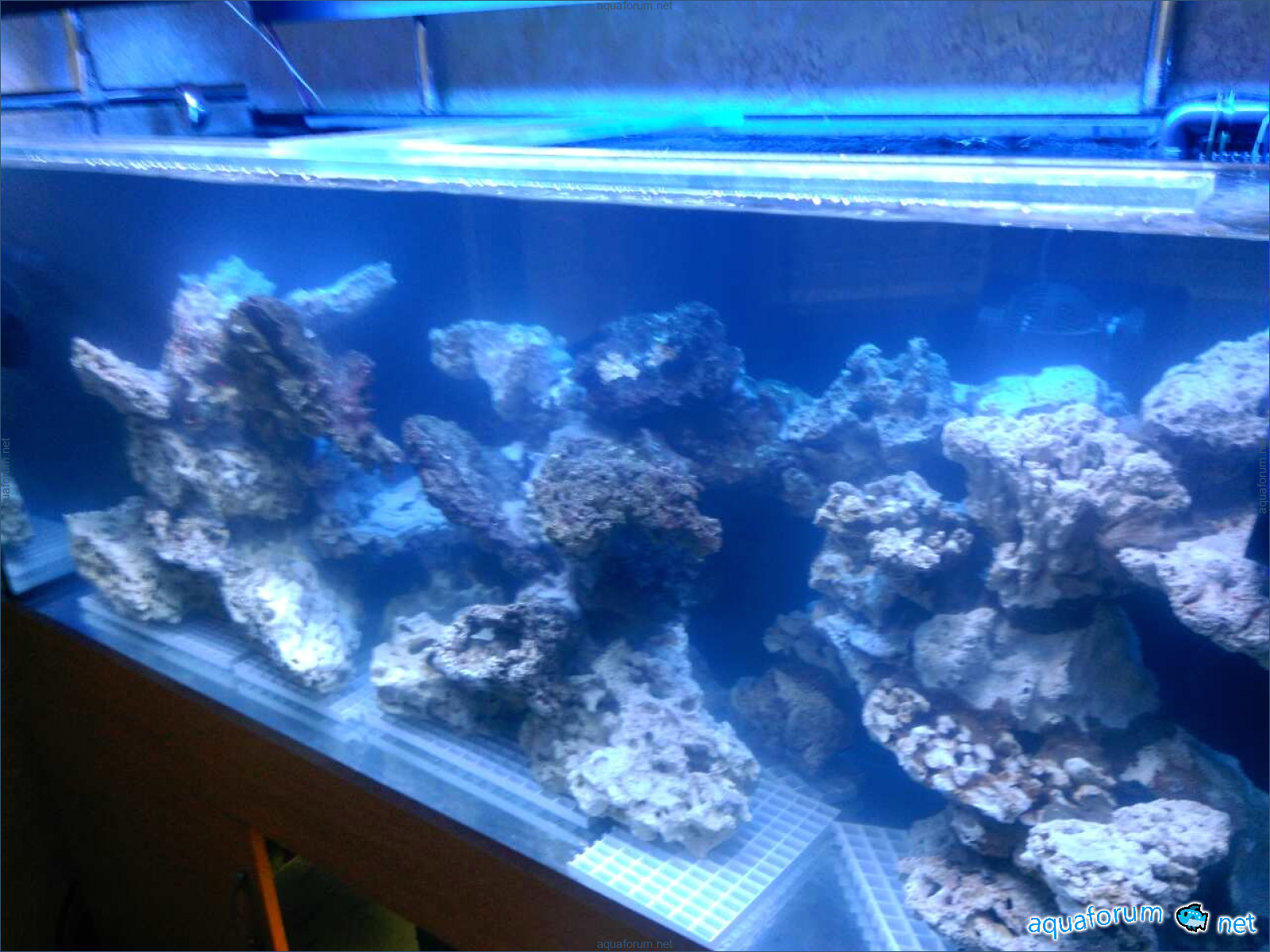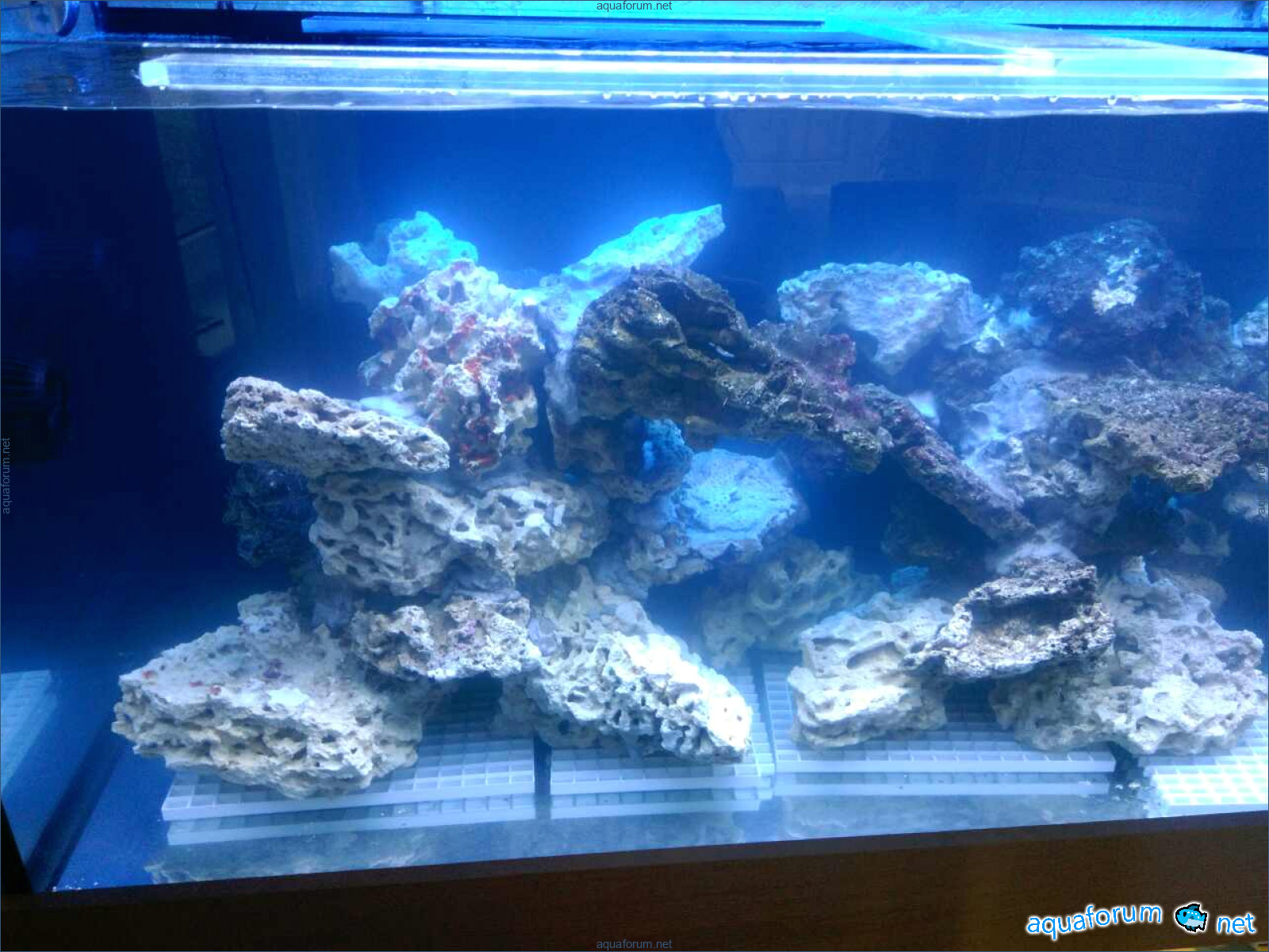 Good day to all. I am creating this topic to discuss the stages of launching a marine aquarium. I will use my own aquarium as an example. Yes, the aquarium is custom-made, measuring 150*50*60cm (L*H*W) with 10mm glass, front and sides are Optiwhite, and the seams are black as clear silicone tends to get covered in algae over time, but this is not noticeable on black. The stand is made of a wooden frame, covered with particleboard. The lighting consists of 2 metal halide lamps of 150W each, with a color temperature of 13000Kelvin, and two T5 lights of 54W each - one ATI Blue Plus and the other Aqua Medica 15K. The flow is provided by two Vortech MP40W pumps in the left corner and two Tunze pumps in the right corner. The heater is a Jager 300W. The overflow is a Herbie 32mm, with a return of 20mm. The circulation pump is a Jebao 4000. The automatic top-up is a Tunze. The rock used is 20kg of Dry Rock, 17kg of Live Rock, and 30kg of Cured Dry Rock. The salt used is Reef Crystals. The bacteria used is Prodibio Stop Amo. The aquarium was launched on
