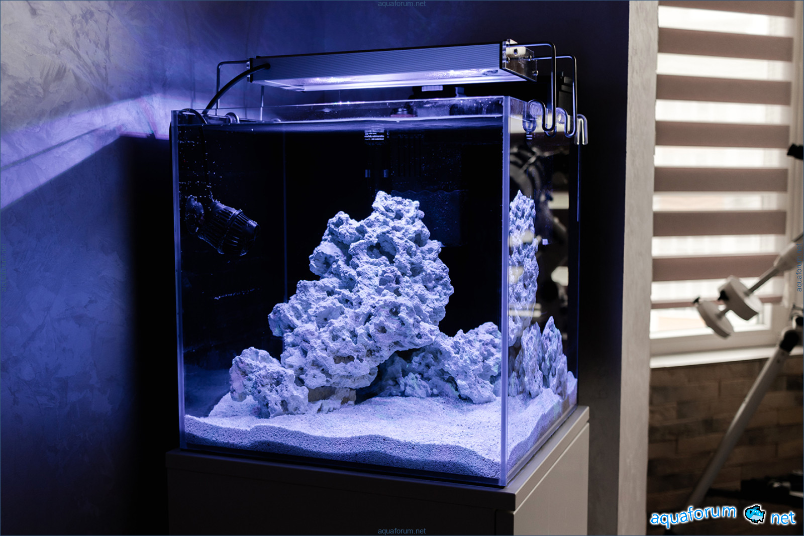 Greetings everyone. I have realized a long-held dream and started saltwater aquarium! The aquarium is 38x38x38cm, made of opti-white glass, with a volume of ~55 liters. The lighting is a Radium PRO 30 66W (Thanks, Spamcheg!). The hang-on filter is a Seachem Tidal 55, and the hang-on protein skimmer is a Bubble Magus QQ1. The water flow is provided by a Hydor Koralia Nano 900. The heater is an EHEIM thermocontrol e 50W. I used Salit test kits. The water is reverse osmosis, and the salt is Aquarium Systems Reef Crystals. Dry reef rocks (~7kg) and Prodibio Aragonite Premium 1-2mm substrate with bacteria were used. The setup was completed on 8.02.2020. Approximately 5kg of sand, with a 3-4cm layer, was used. The rocks were arranged without glue, creating a nice slope for future inhabitants. The reverse osmosis water took half a day to filter, finishing just before midnight. In the filter, I placed the included sponge and Seachem Matrix, filling the remaining volume with polyester to clear the cloudiness. I added two ampoules of bacteria that came with the sand - Prodibio BioDigest + BiOptim. The next morning, the water was crystal clear. The test results are: pH 8.15, KH 12,