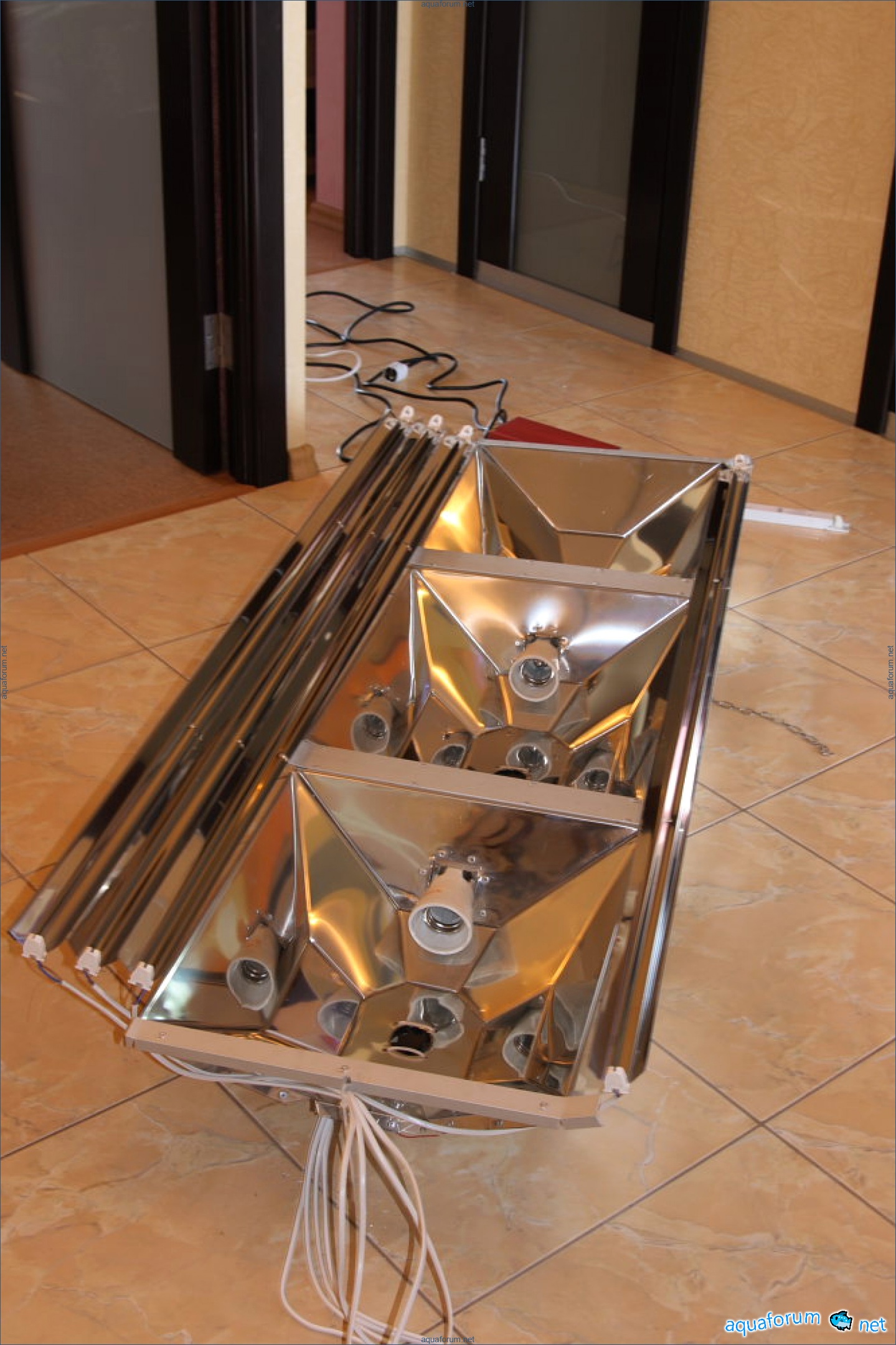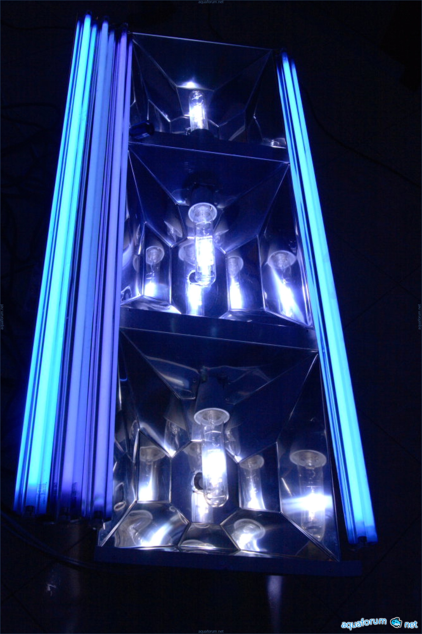 چراغ را از زمستان شروع به ساخت کردم، اما فقط دیروز آن را به پایان رسانده و بالای آکواریوم آویزان کردم. اندازه کلی چراغ 1550x600 است. 2 بازتابنده در دو طرف برای لامپ 250 وات متال هالید. در وسط برای 400 وات. + 4 بازتابنده مستقل برای لامپ T5. ماده - استیل ضد زنگ صیقلی 0.5. الگوها به صورت مستقل و از نظر هندسی طراحی و تحلیل شدهاند (ایده نیز به طور مناسب از لامپهای لومینارک اقتباس شده است). مشکل این است که نقشههایی که در اینترنت پیدا کردم، به نیازهای من پاسخ نمیدادند: آنها پرتوها را به هر سمتی میفرستادند، فقط نه به صورت عمود بر آب. با چسباندن چند نمونه آزمایشی (به طور جداگانه برای 250 وات و 400 وات) و تحلیل آنها، به فلز منتقل شدم. T5 (80 وات) - 2 لامپ آکتی نیکا از فونا مارین + 2 لامپ بنفش از فونا مارین (اما آنها هنوز موجود نیستند و به طور موقت 2 لامپ JBL روشن هستند) متال هالید 2 ریفلوکس 12000 250 وات و 1 ریفلوکس 12000 400 وات. بالاستها - الکترونیکی کُرال ویو.