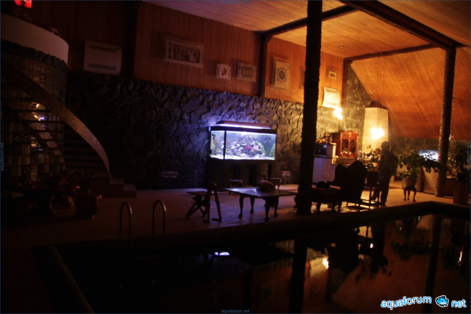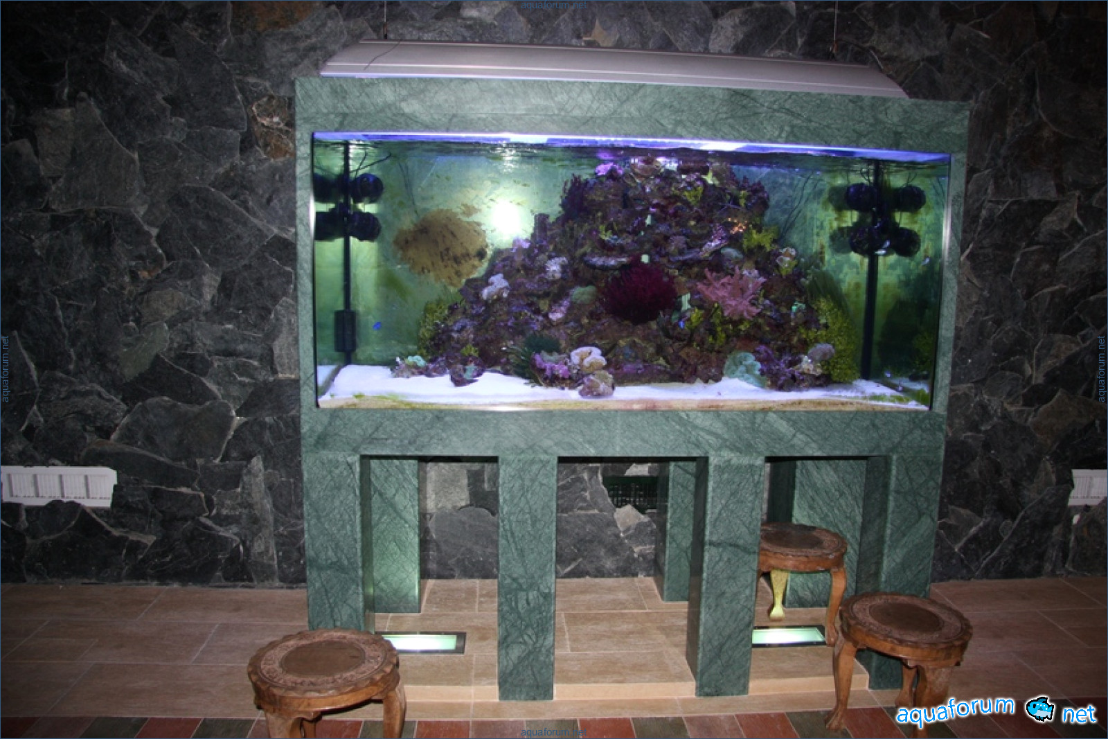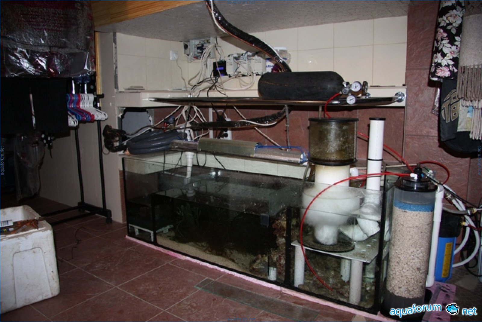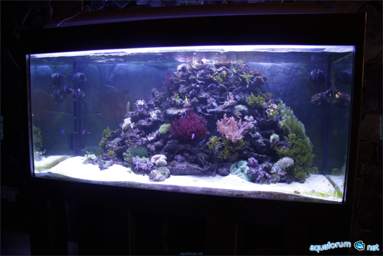 新年に ... 2000x800x850の新しい水槽を設置しました。カルシウムリアクター、冷却機、スキマーが付属しており、コンピューターで給水、照明、冷却を制御しています。機器はランドリールームに設置し、水槽から約5メートル離れた壁の向こうに隠しました。水槽は徐々に入植が進み、良好な状態です。照明は250ワットの20,000K放射状ランプと12,000Kのリフレックスを組み合わせたT5 6本 + 39ワットのATIプロカラー2本を使用しています。生物の組み合わせも気に入っており、カラーと状態が素晴らしいです。写真は点灯したT5のみの状態で