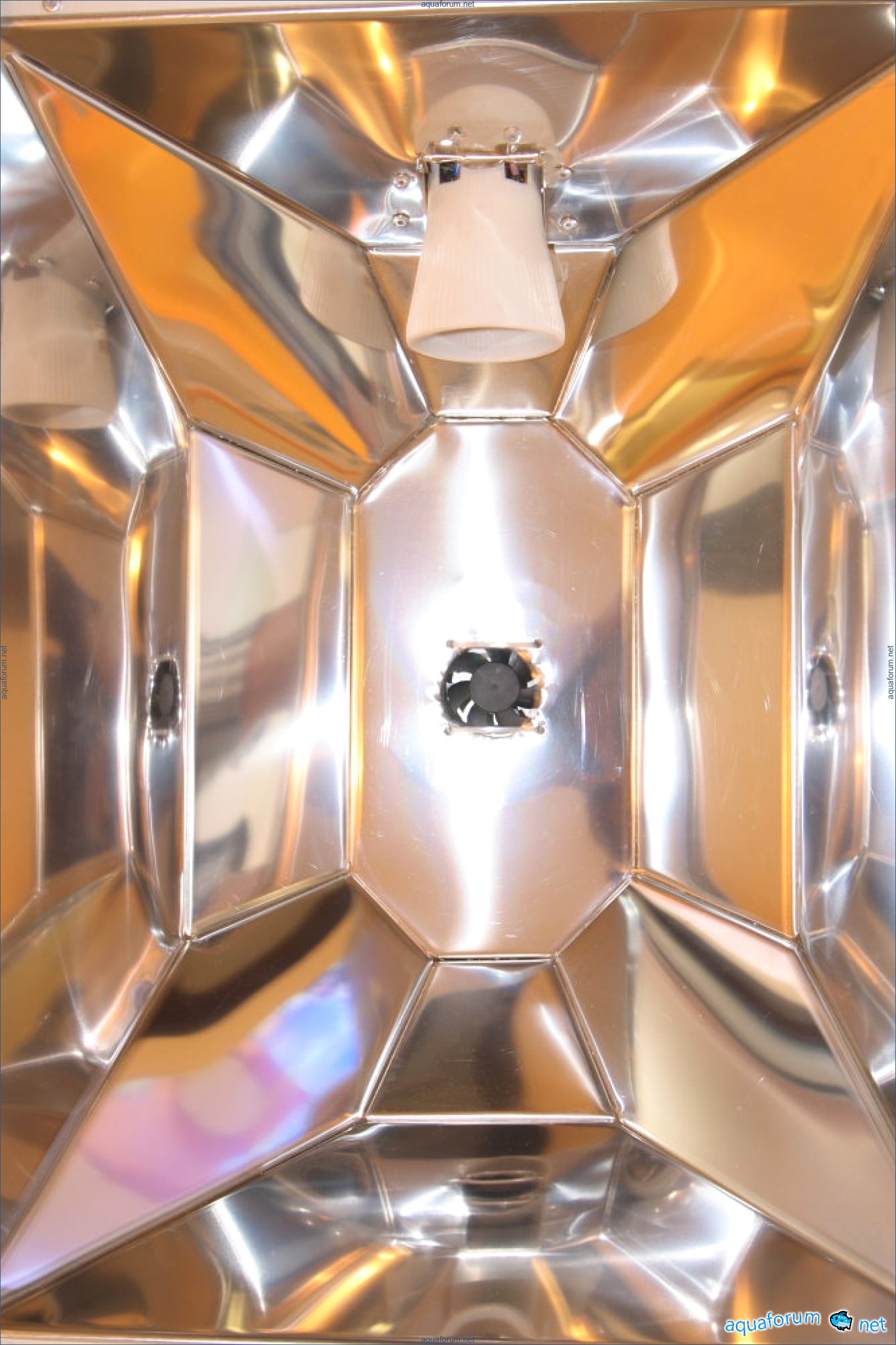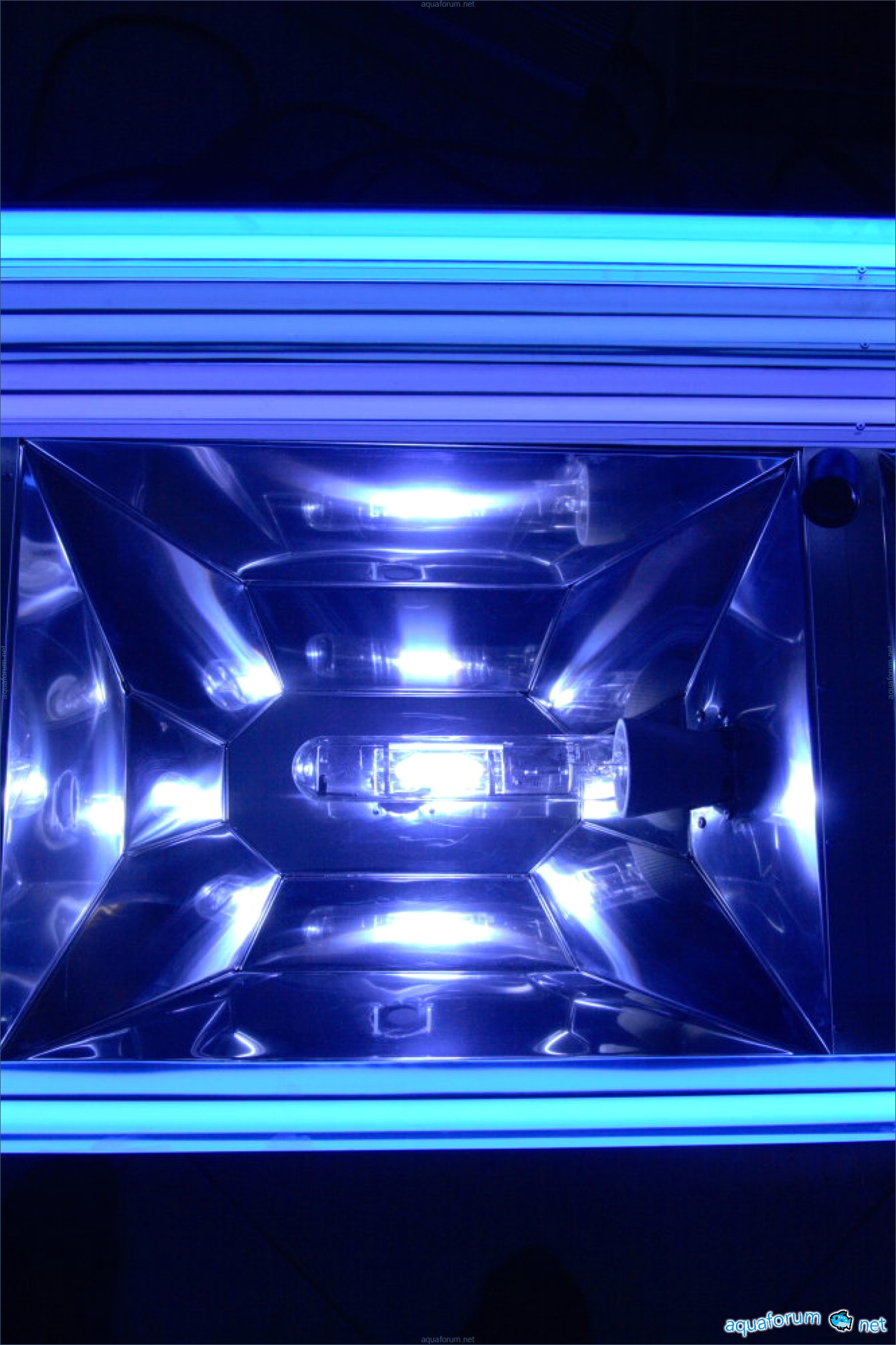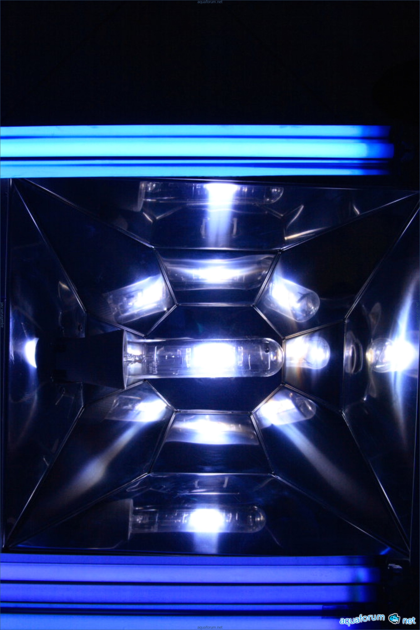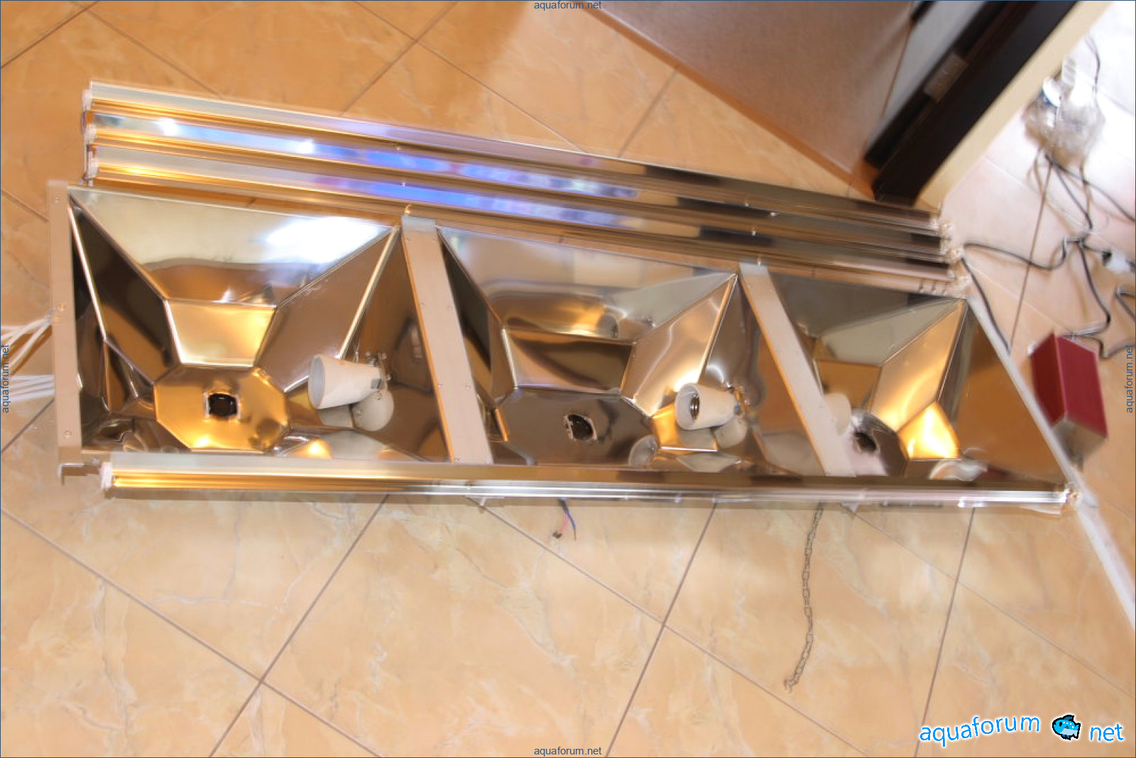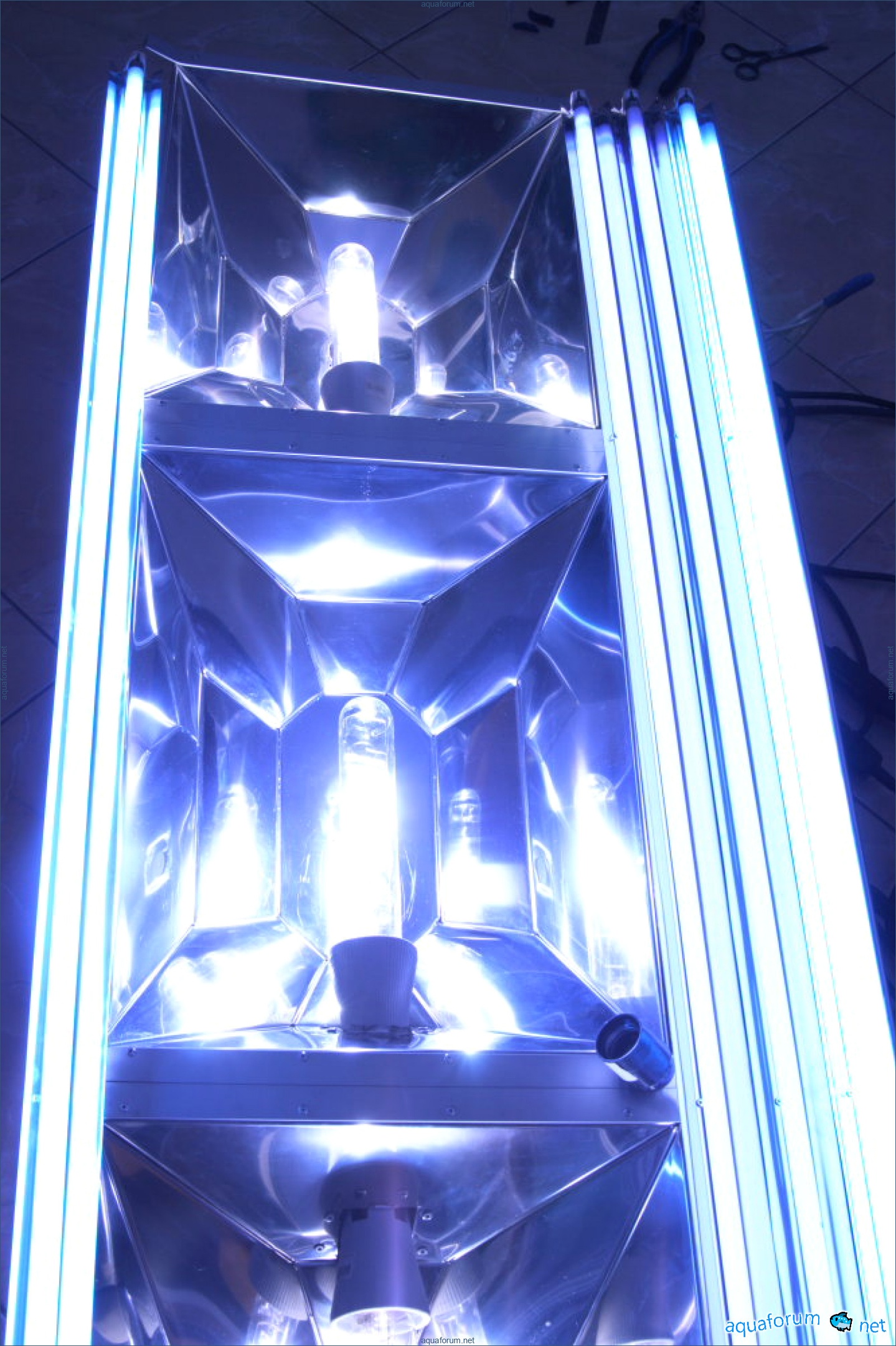 Lampu itu mula dibuat pada musim sejuk tetapi hanya dipasang di atas akuarium semalam. Saiz keseluruhan lampu adalah 1550x600. Terdapat 2 reflektor di sisi untuk MH250W. Di tengah untuk 400W. + 4 reflektor bebas untuk T5. Bahan - keluli tahan karat yang dipoles 0.5. Corak telah direka dan dianalisis dari segi geometri secara sendiri (idea diambil dari lampu luminar). Masalahnya adalah bahawa lukisan yang saya temui di internet tidak memenuhi keperluan saya: mereka memancarkan cahaya ke mana-mana sahaja, bukan secara tegak lurus ke air. Setelah menyatukan beberapa sampel percubaan (secara berasingan untuk 250W dan 400W), dan menganalisisnya, saya beralih kepada logam. T5 (80W) - 2 aktiinik dari Fauna Marin + 2 ungu dari Fauna Marin (tetapi yang itu belum ada dan sementara ini menggunakan 2 JBL) MH 2 Rifluks 12000 250W dan 1 Rifluks 12000 400W. Ballast - Elektronik Coral View.
