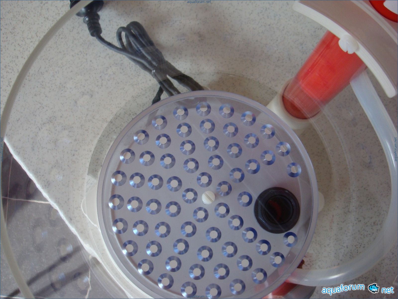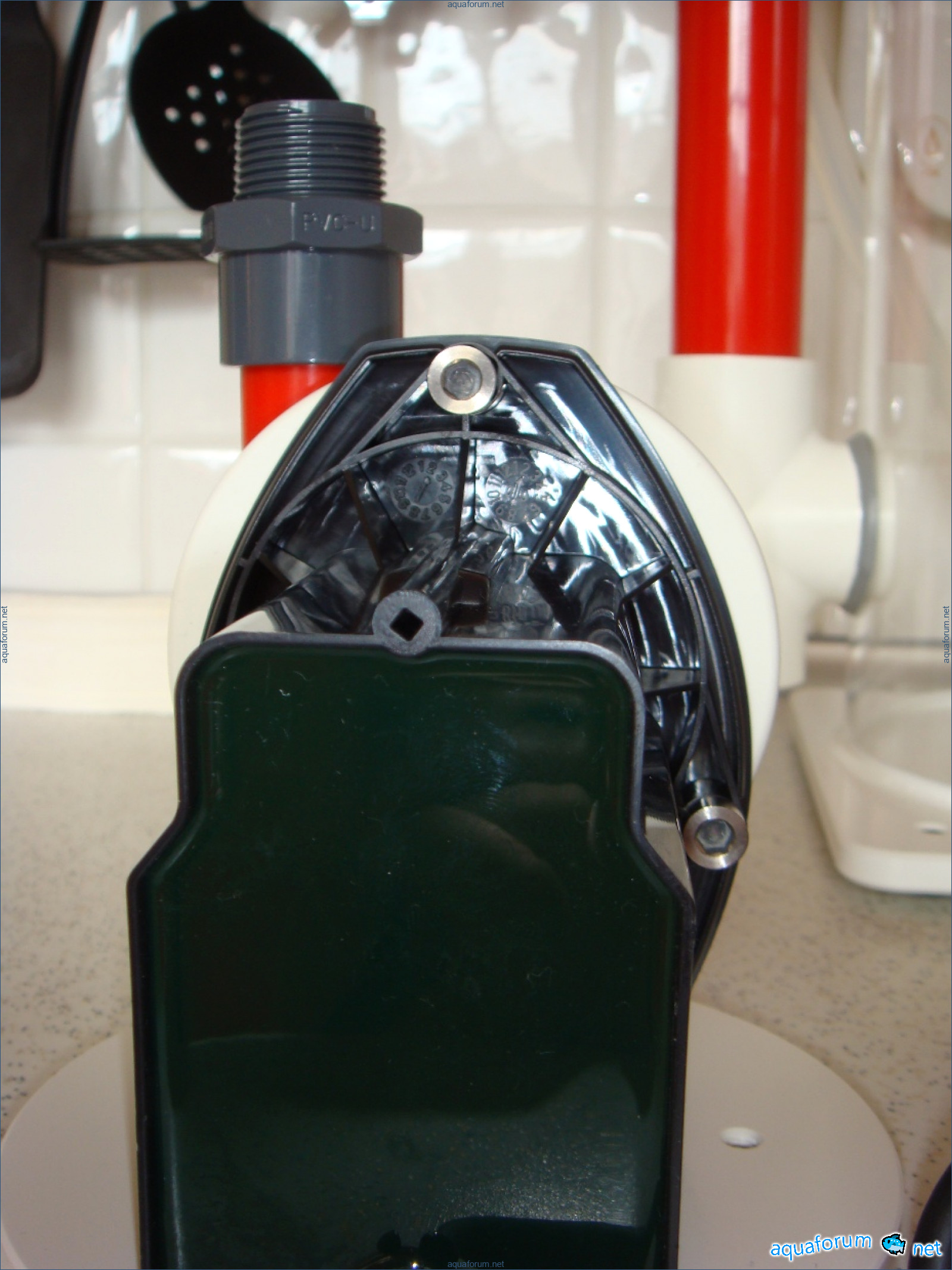 Синенькую пластинку с дырочками провернуть бы, чтобы та часть ее, без дырочек, стала над выходом помпы. А так ВО