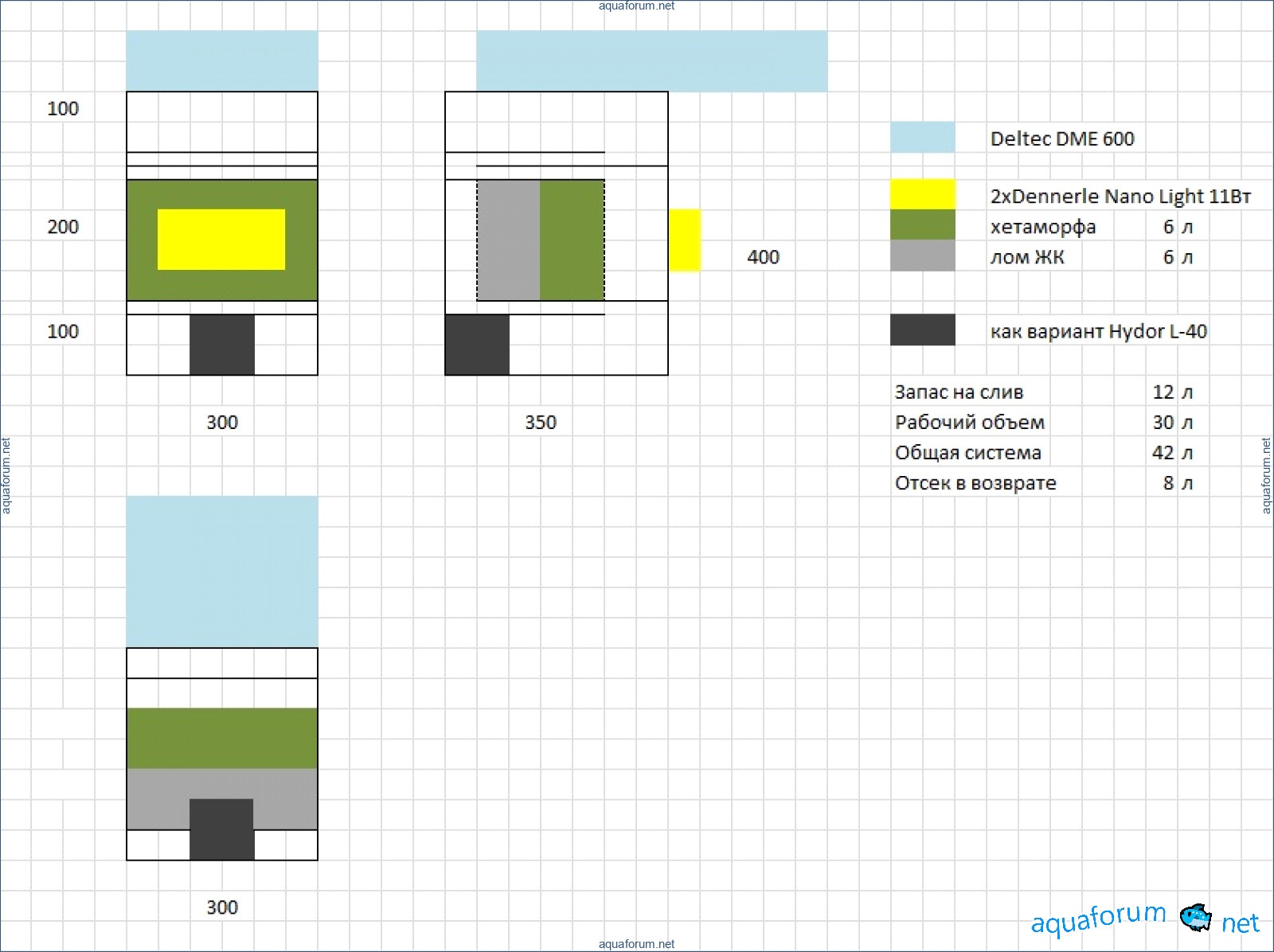 б) в итоге если холодилка станет, то останется место под самп при 1 варианте (500) 200х450х400, при втором (600) 300х450х400 соответственно - в сампе хочу поставить флоратор, водорослевик с био фильтром под ним в виде осколков Ж.К. (живые камни)(свет хотел поставить 2 светильника для нано по 11Вт=22Вт, хватит ?) и возвратная помпа. Хотелось бы приберечь место для кальциевого реактора. соответственно вопрос по флоратору - какой что бы наверняка ? и вопрос по помпе - должна поднять воду на 1м, при этом протянув её через холодильник и УФ. Плюс нужен отсек под уголь и ему подобное и нагреватель на всяк случай.