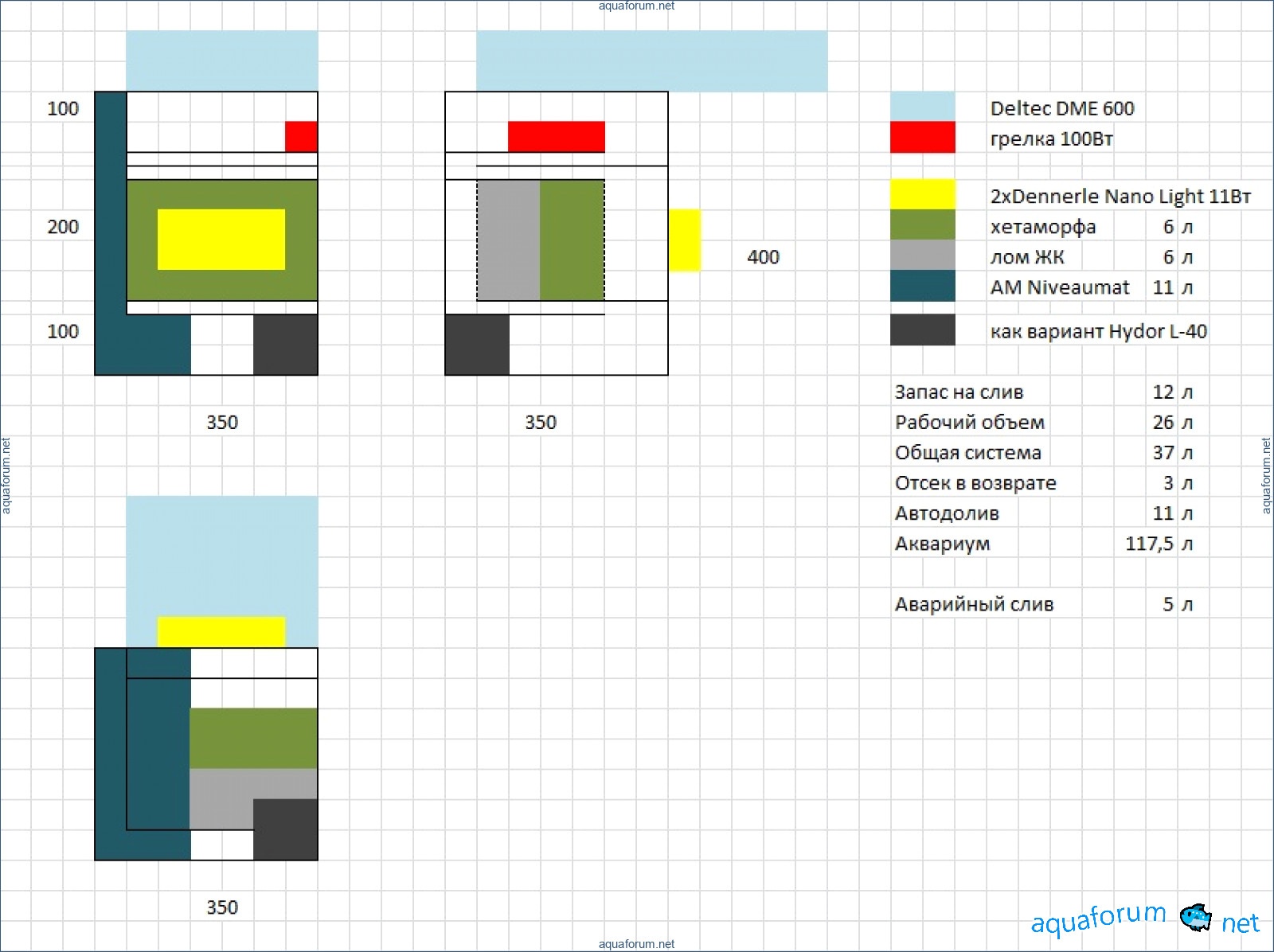 3. Слив-залив - методом Дюрсо - на задней стенке аквариума будет сделана шахта, в днище будет 2 отверстия - 1 под слив, 2 под аварийный слив + подъем воды внутри аварийного слива. Интересуют объемы труб и отверстий соответственно.