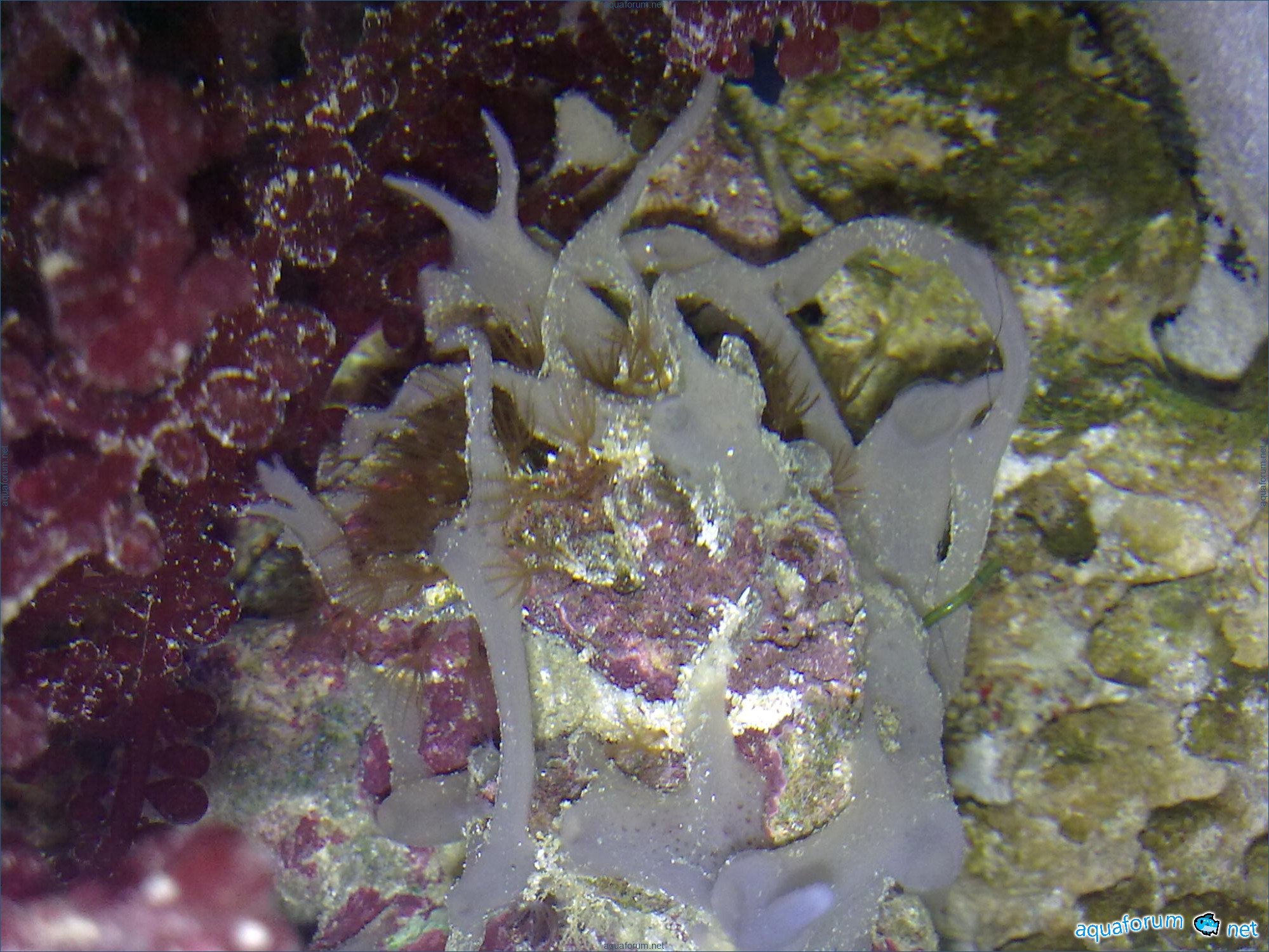 Некоторые губки боятся воздуха и пресной воды, зонтикам при этом ни чего не будет. Попробуйте поэкспериментируйте.... выхода ведь нет. Хотя больше похоже на какую-то водоросль....попробуйте сошкрябать с камнем.
