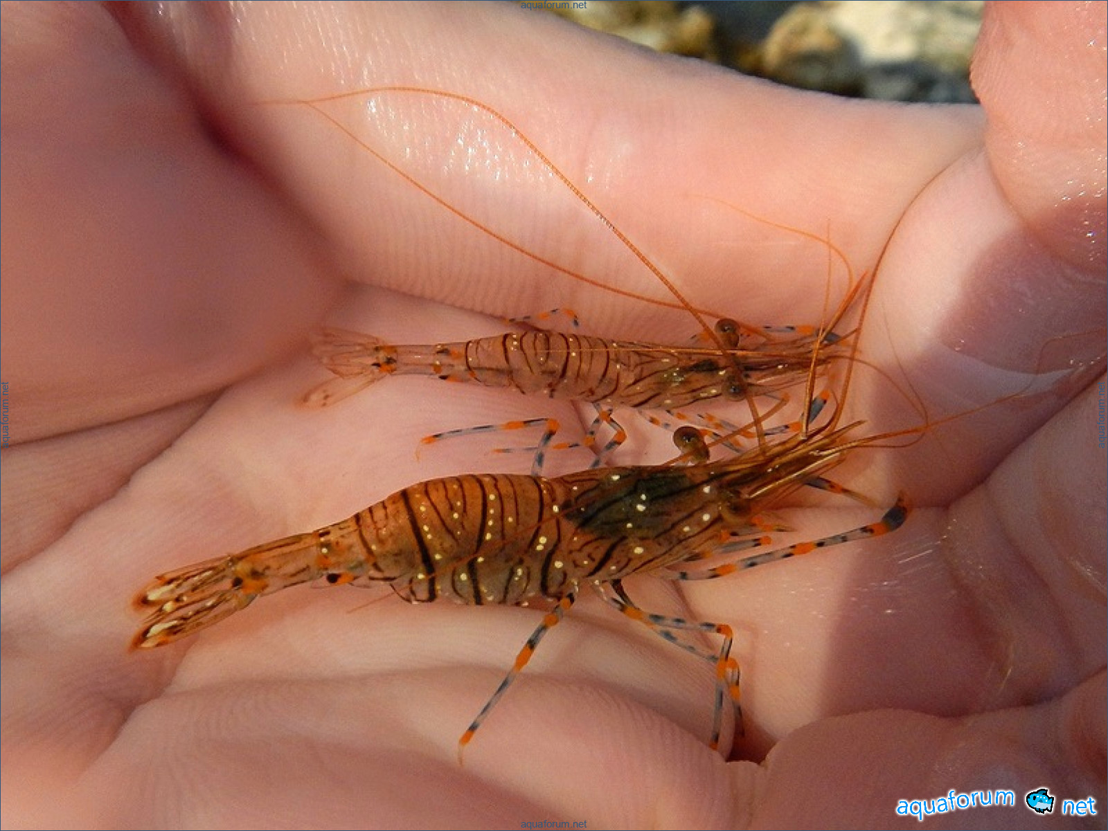 Каменная креветка или стройный палемон ( Palaemon elegans ) - крупное полупрозрачное ракообразное, своим видом и привычками сильно напоминает леандера, проводит все свое время в поисках пищи на дне. Тело взрослой креветки имеет около 7 см в длину, но длинные усы и выросты панциря зрительно увеличивают ее размеры. Они очень красивы — великолепные синие и оранжевые перевязи на лапках, а прозрачный панцирь позволяет увидеть внутренние органы креветки. И самое главное встречаются в Черном море! Обратите внимание, что креветки не плавают, а медленно ходят, перебирая ножками — щиплют проростки водорослей, ищут мертвых животных. Эта европейско-африканская креветка была завезена при интродукции кефали, и впервые обнаружена в 1957 г.