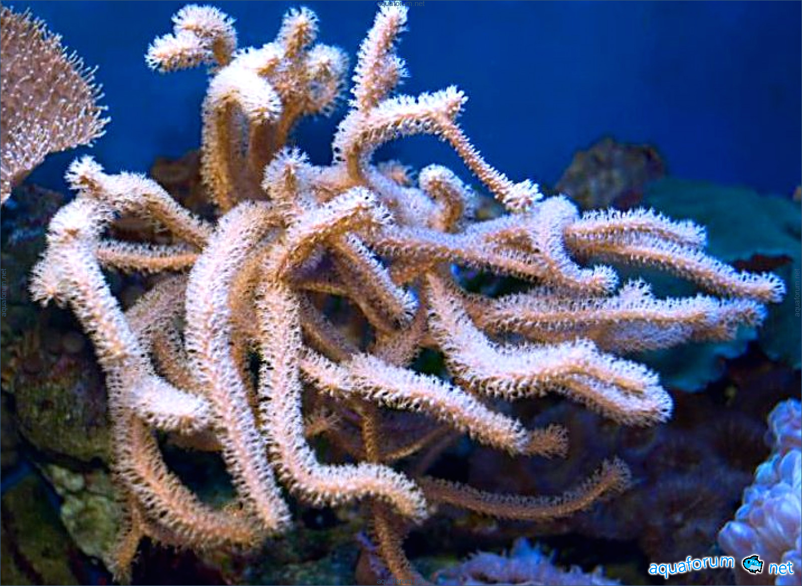 ( отросток- ветка ,преобрёл у Анатолия )Бежевые веточки, у него болеё крупнее строение, тоисть толще и крупнее размеры веточек, крупнее полипы.Они любят хорошо освещенное место,нельзя позволяйть веткам тереться о камни или кораллы, это может вызвать оголение.Любят они у меня места с сильным течением . Стоит сказать что не любит беспокойств от креветок и морских коньков - они цепляються за их ветки и мешать полипам питаться, что приведёт рано или позно к гибели.