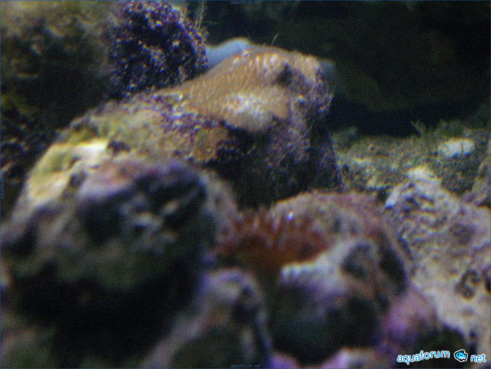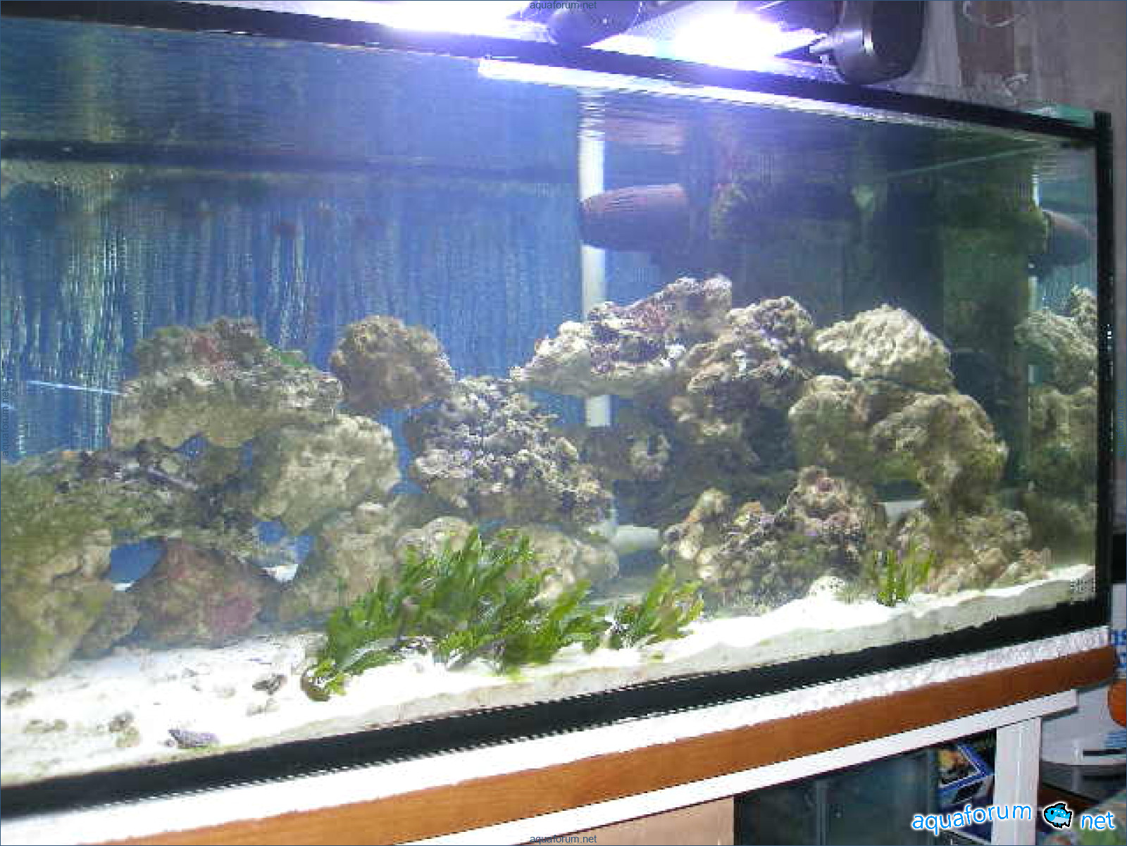 Аквариум оборудован сливной шахтой 15*15*50 с гребенкой и капельной пластиной - заполнена пластик. шарами JBL* 8л, сливное отверстие 40 мм в дне. Вода залита 15.03.2008 года. Соль Instant Ocean плотность 1.025 прмл. Был долив старой воды из др. морского аквариума-70 л. и в шахту положил постепенно 8 капсул бактозима. 23.03.08 произвел закладку - 35 кг передержаного Ж.К. Разложил его по дну и осветил 6-ю Т5 лампами 24 w Хаген Аква и Пауэр Гло. На третий день начали появляться бурые водоросли, которыми к 30.03 покрылась вся поверхность камней, стенки и дно. Грязная пена во флотаторе появилась только на 8-й день .