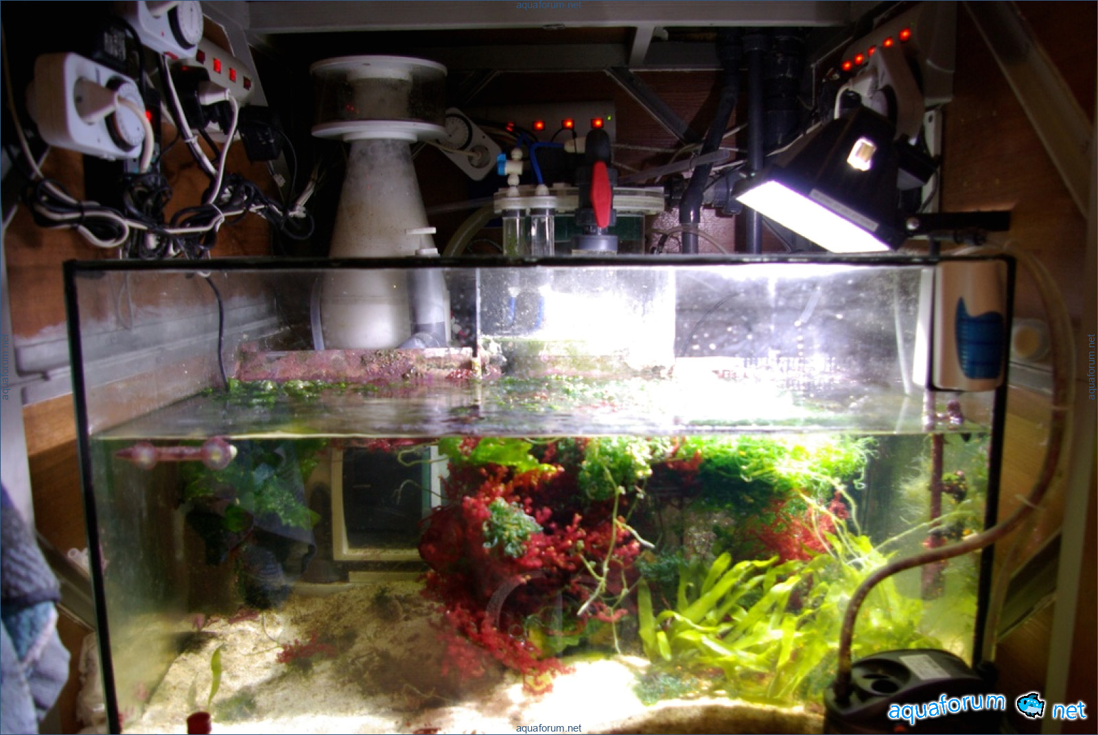 На сегодняшний день ничего особо фоткать нету. В водорослевике сидит пару фрагов кораллов, состояние неплохое. Думал подкупить пару килЖ.К. (живые камни), но все крутится мысль, "а попробую ка я без Ж.К. (живые камни)запуститься".