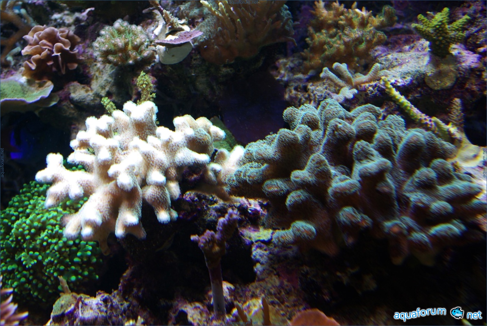 Разница есть однозначно и разница в лучшую сторону. В центре аквариума, там где много света коральчики начали интересно окрашиваться. На фото коралл с зелененькими полипчиками и темнокрасной тканью - начала светлеть ткань и полипчики. Очущение, что темный цвет "вымывается" и остается только светлый, такой нежный цвет.