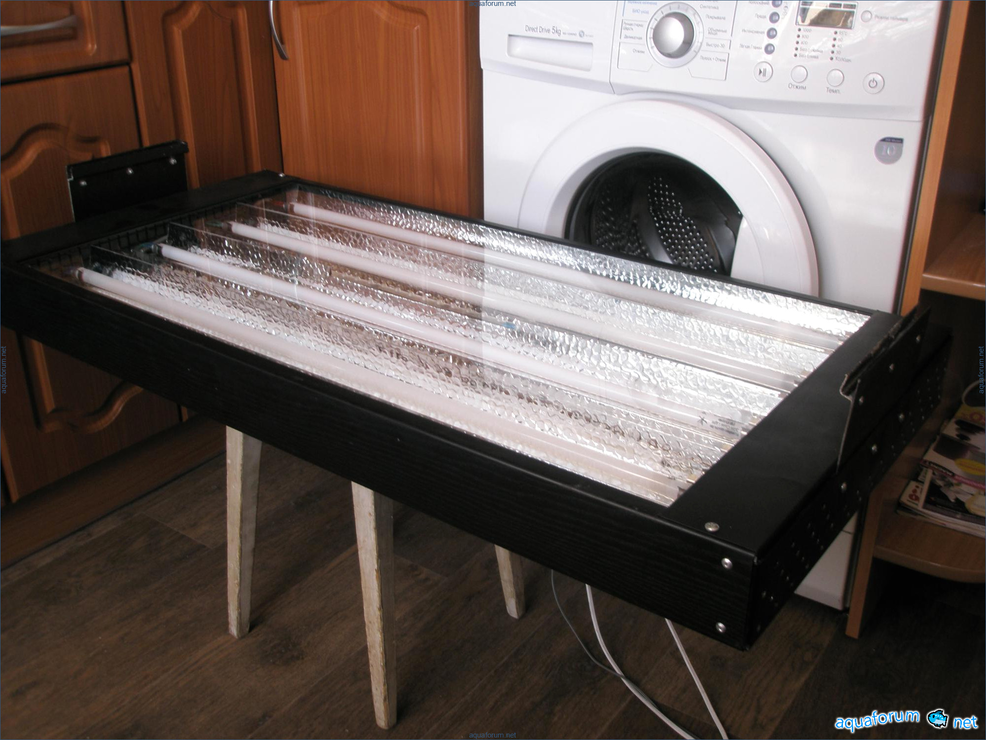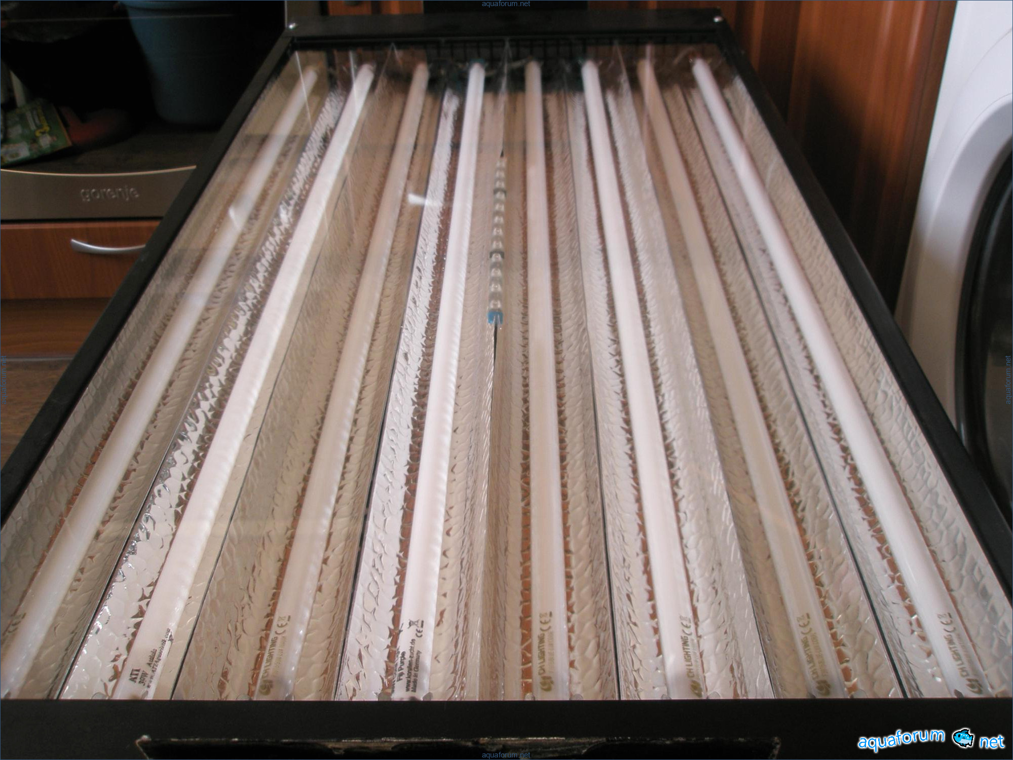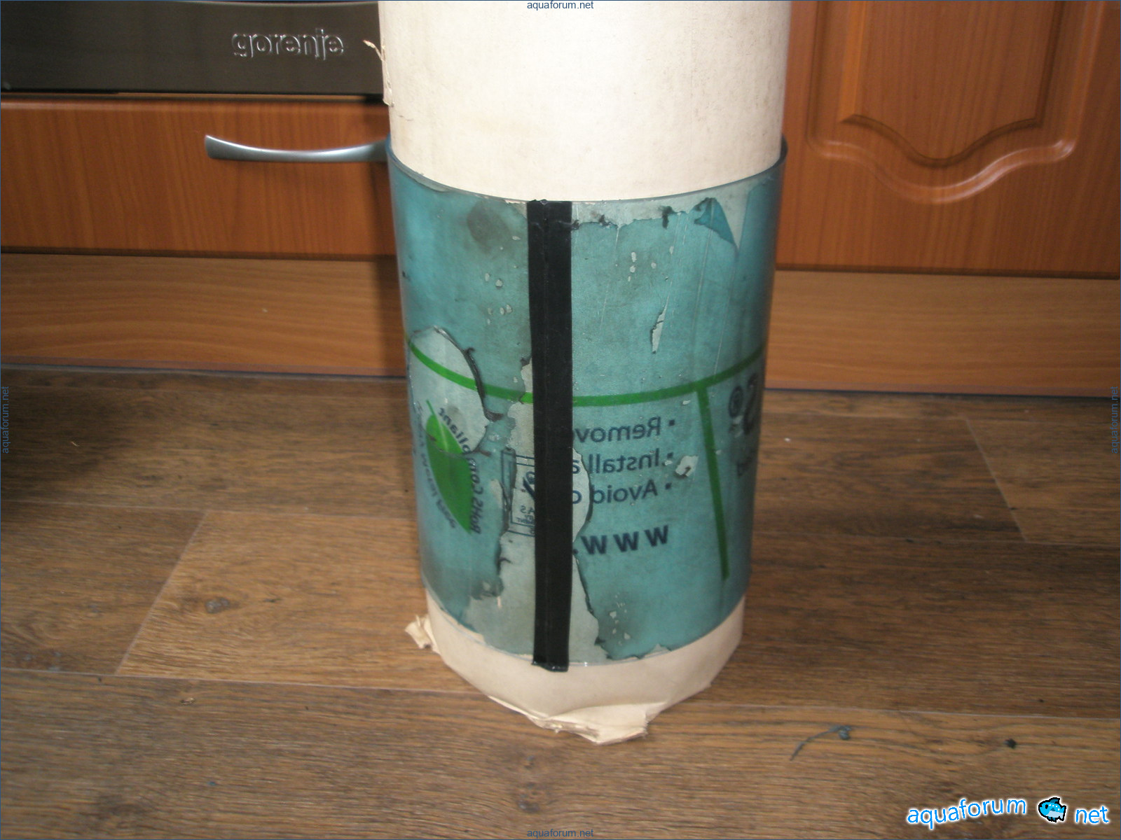 Промыв аквариум я приклеил самоклеющую пленку синего цвета, установил самп и аквариум на подготовленное место и выставил аквариум по уровню.