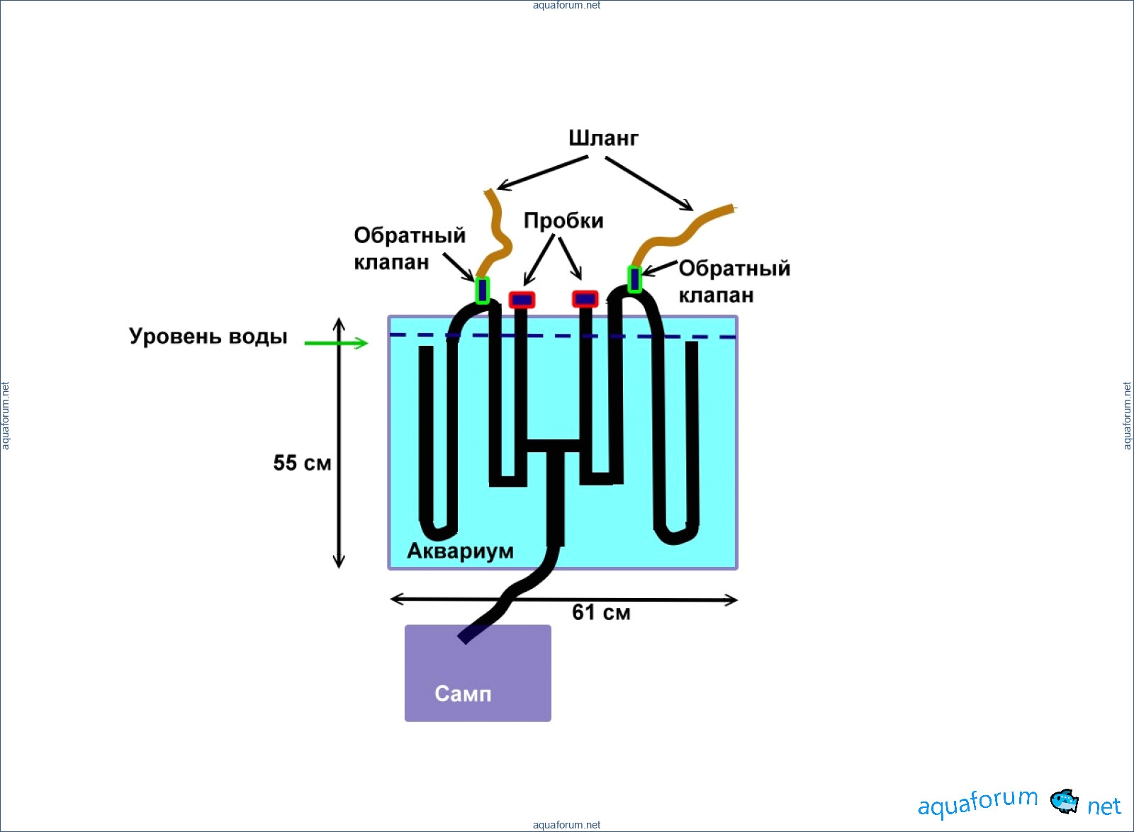 Аквариум: 61 см длина, 50 см ширина, 55 см высота. Стекло 10 мм.