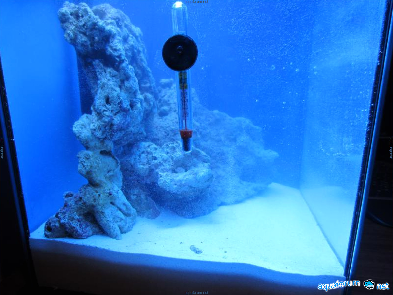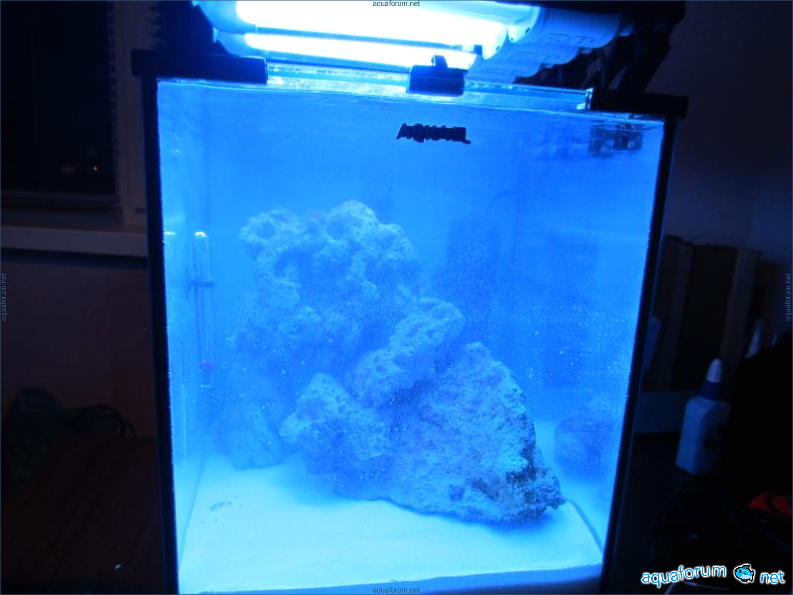 залил в аквариум дистилат, засыпал соль (38 гр/л) добавил помпу из аквахозяйства для растворения....через 3 часа после полного рстворения соли высыпал в аквариум живой песк (на фото)...из фильтра (FZN-3) вынял губки и заложил синтепон...к утру вода стала прозрачной как слеза.