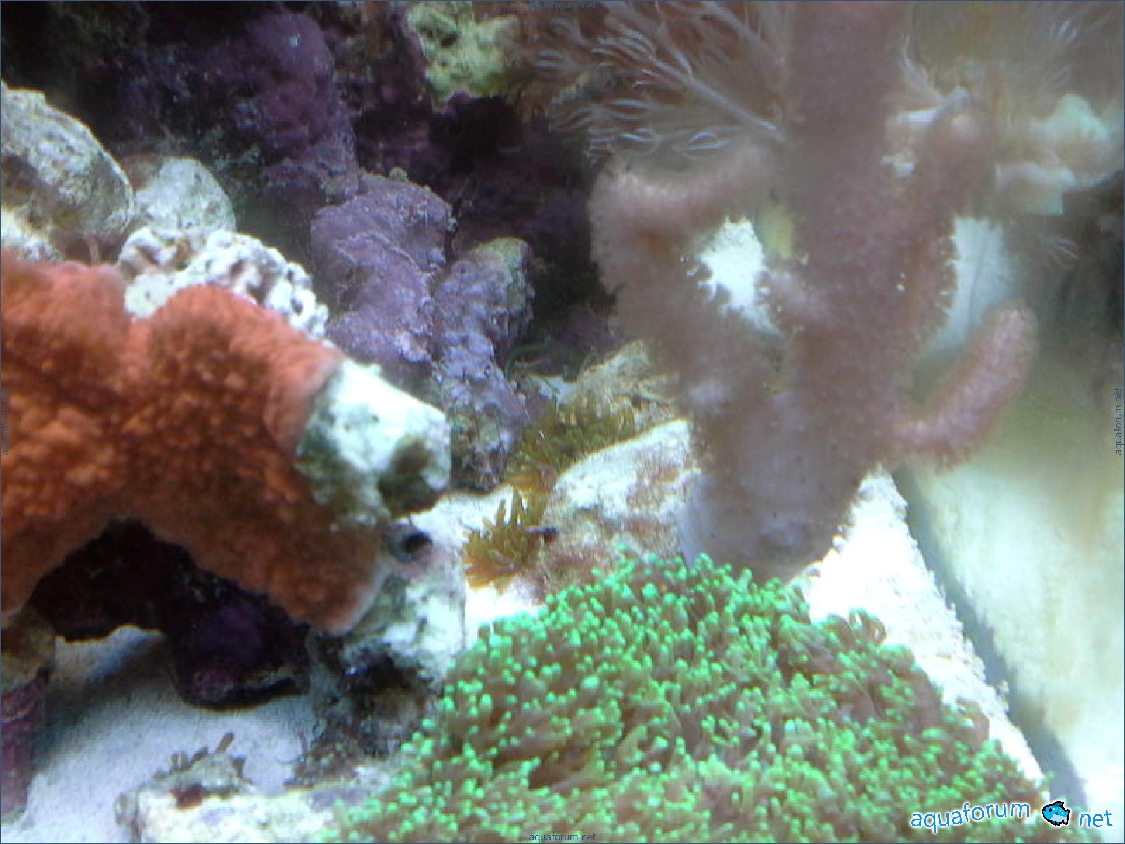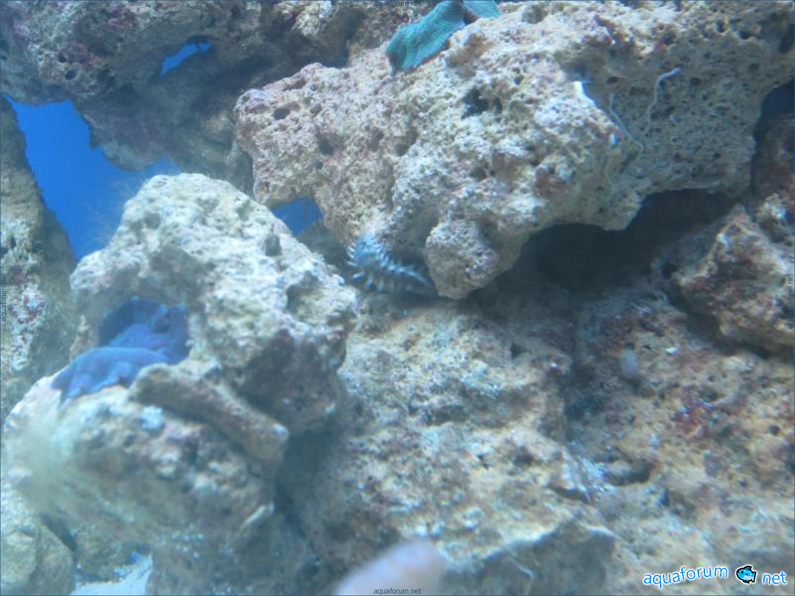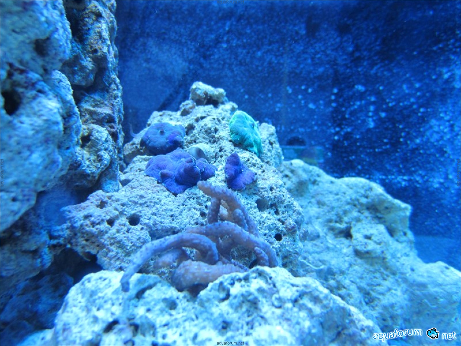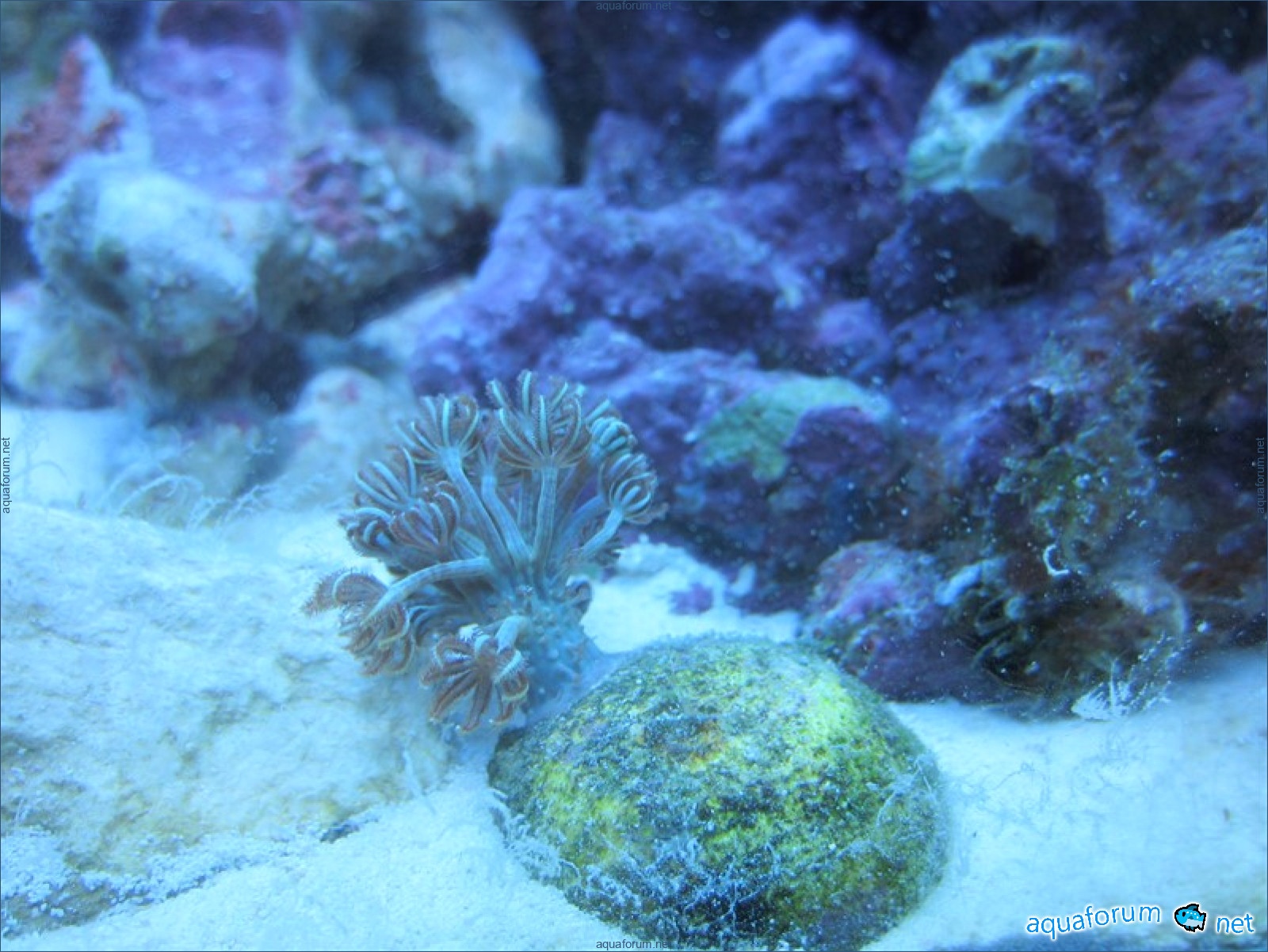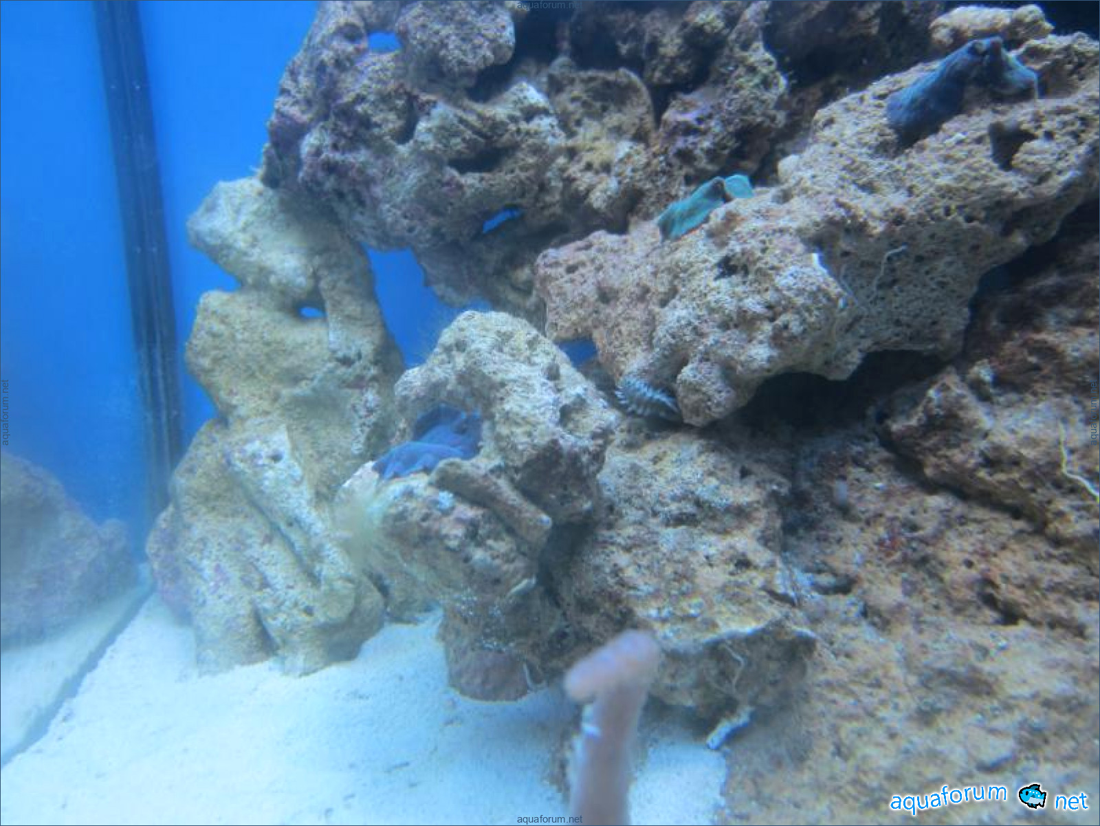 Привез передержаные Ж.К. (живые камни)из сампа одной из банок г. Ровно(огромное спасибо ее хозяину), и загрузил их в аквариум . Из живности обнаружил несколько маленьких офеурок (до 3 см), несколько веерных червячков и две айптазии (очень фиолетовых и красивых ) ребенок и жена расматривали всё это с большим удовольствием.