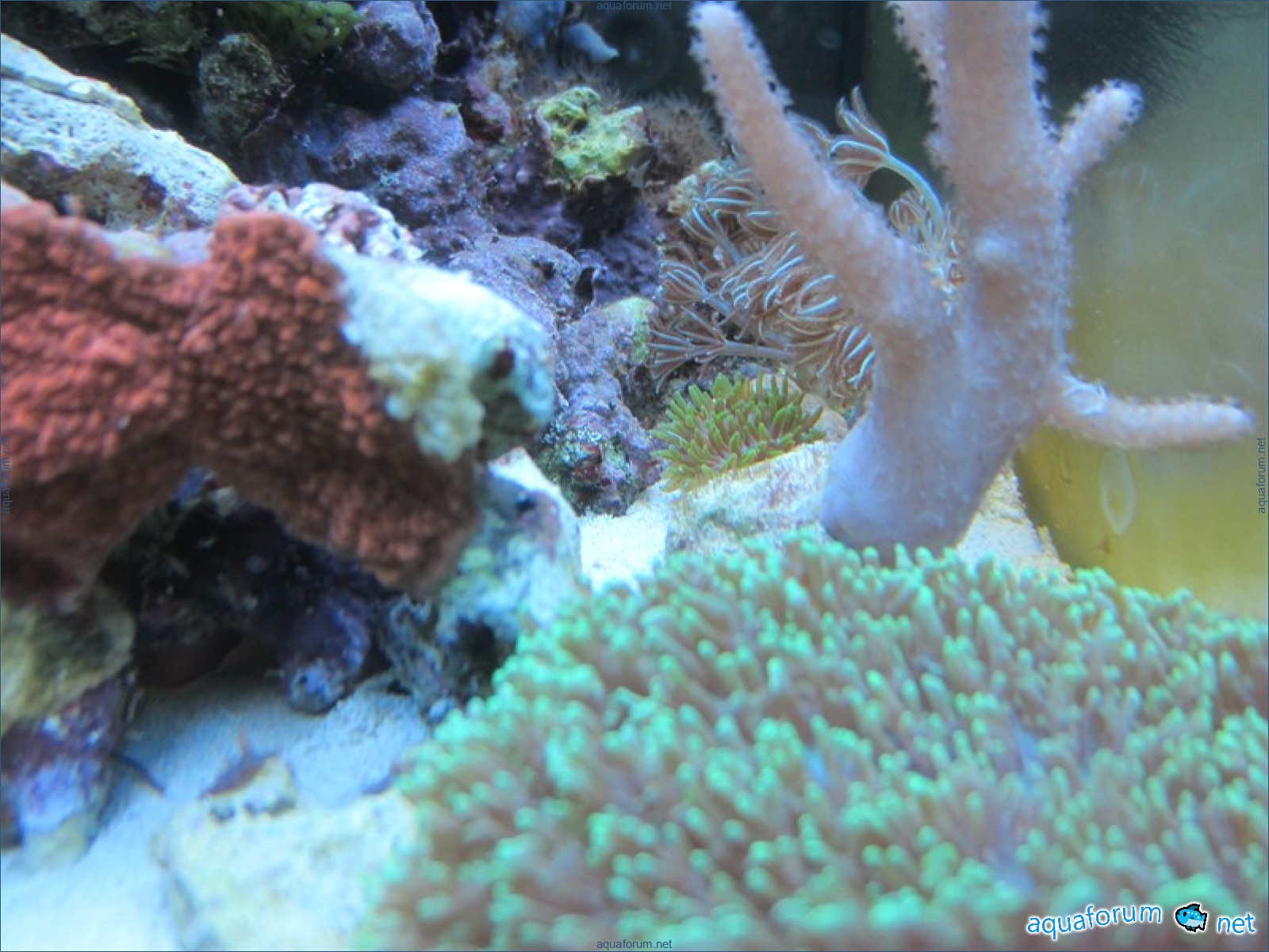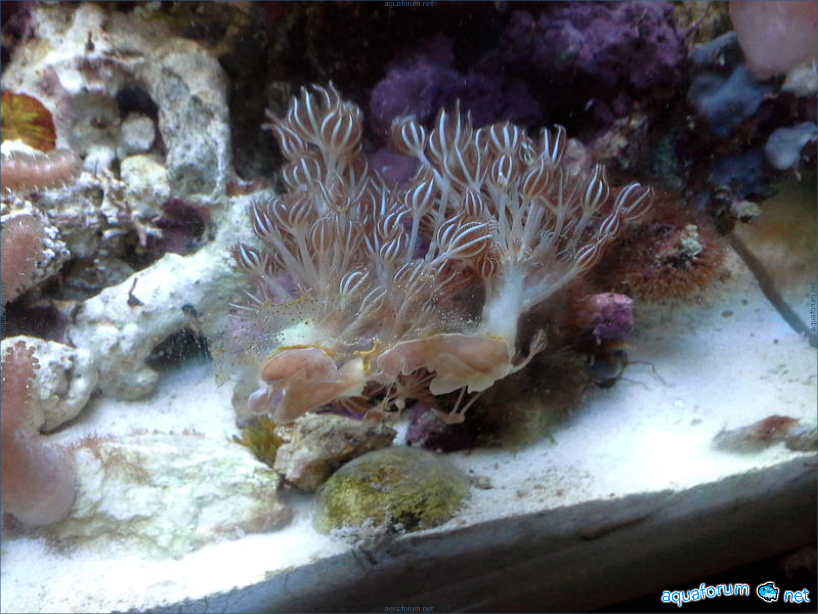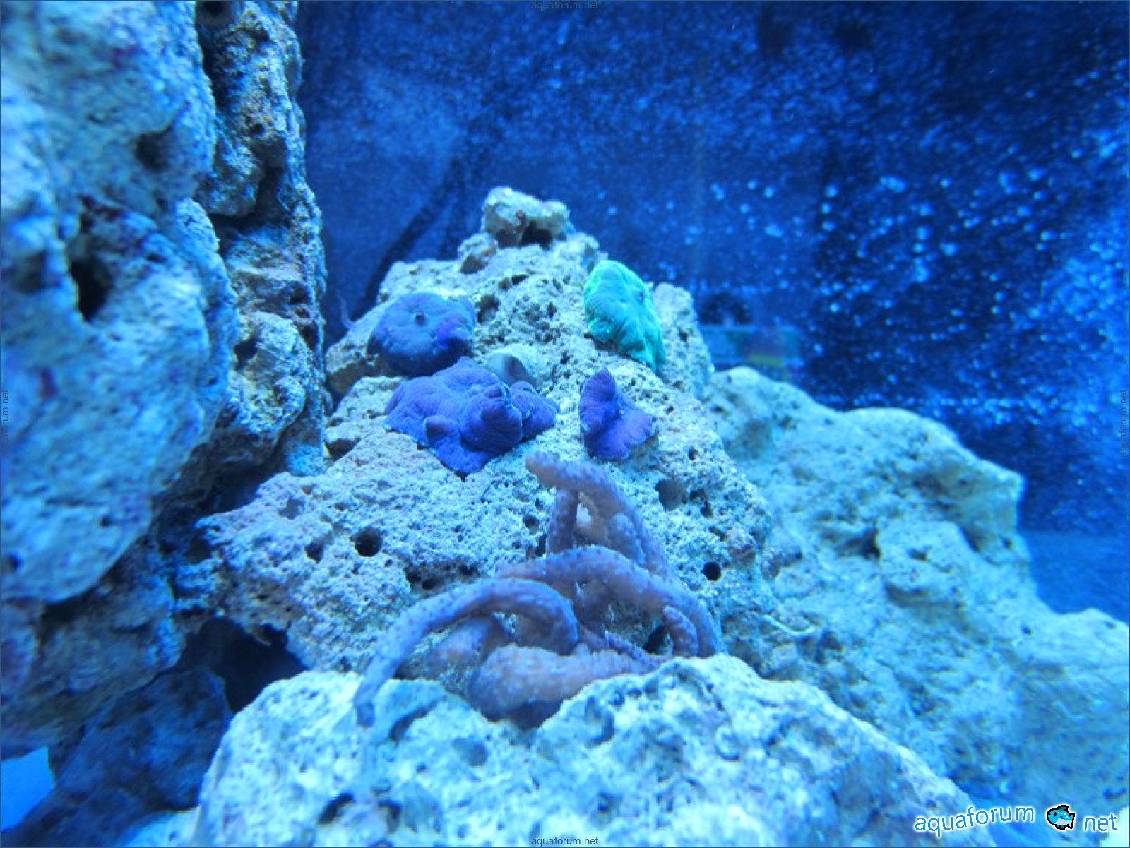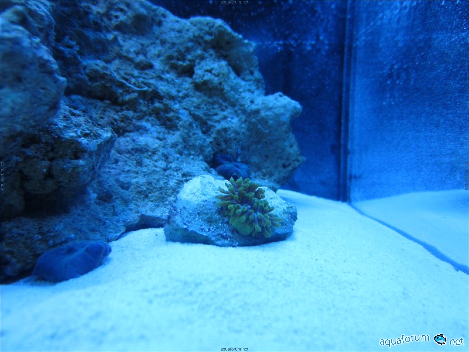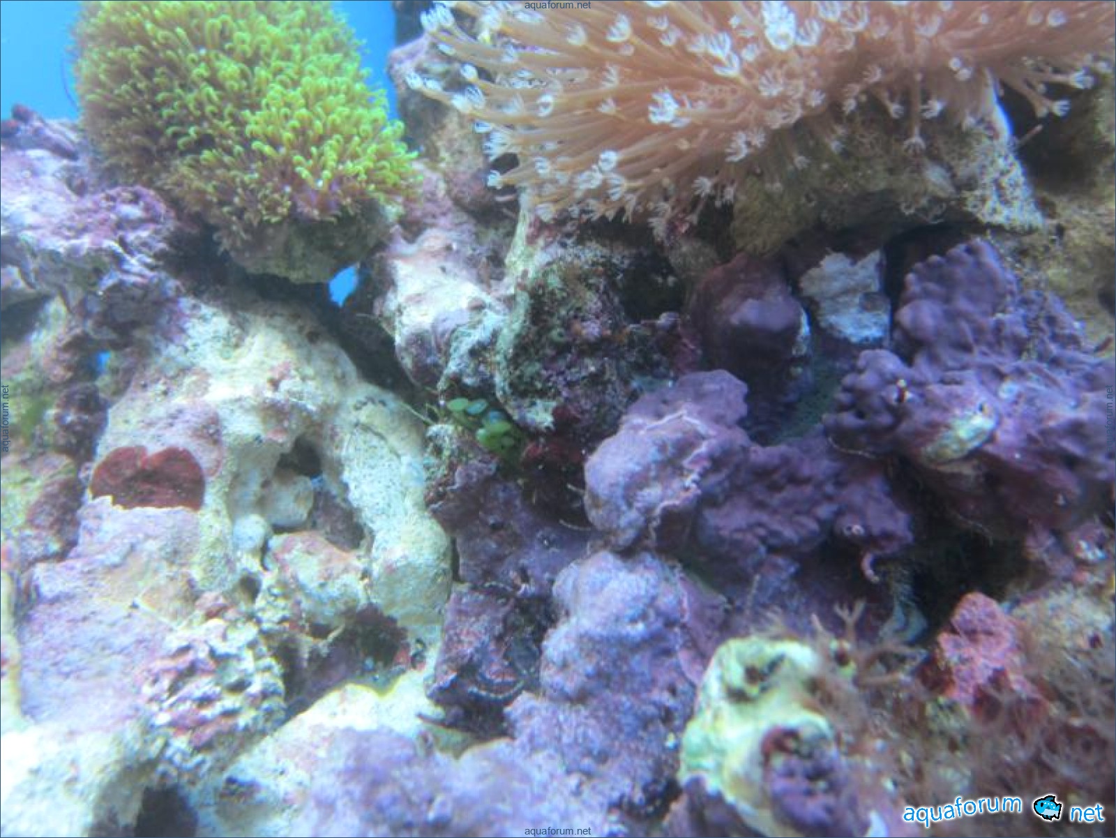 Привез передержаные Ж.К. (живые камни)из сампа одной из банок г. Ровно(огромное спасибо ее хозяину), и загрузил их в аквариум . Из живности обнаружил несколько маленьких офеурок (до 3 см), несколько веерных червячков и две айптазии (очень фиолетовых и красивых ) ребенок и жена расматривали всё это с большим удовольствием.