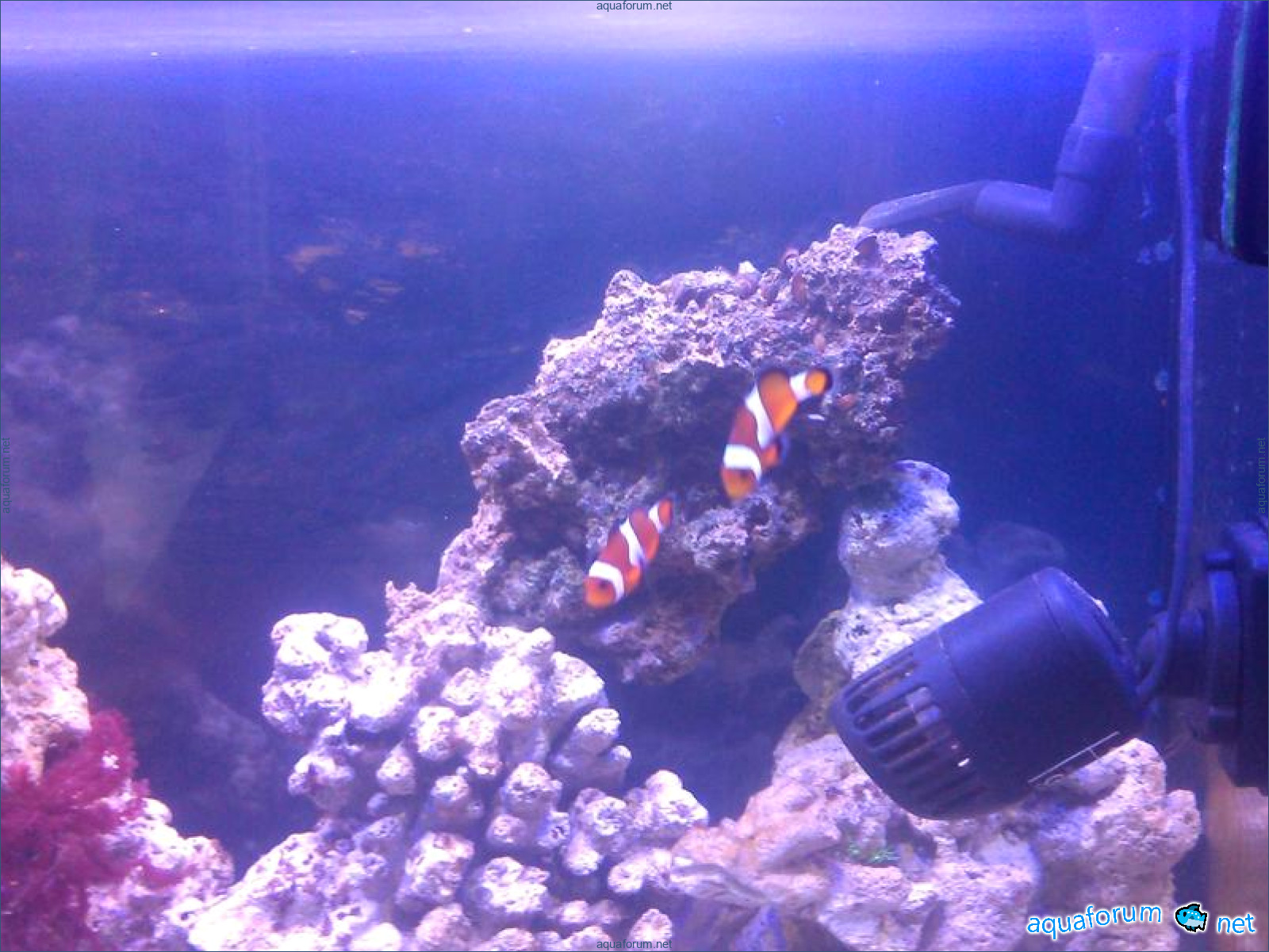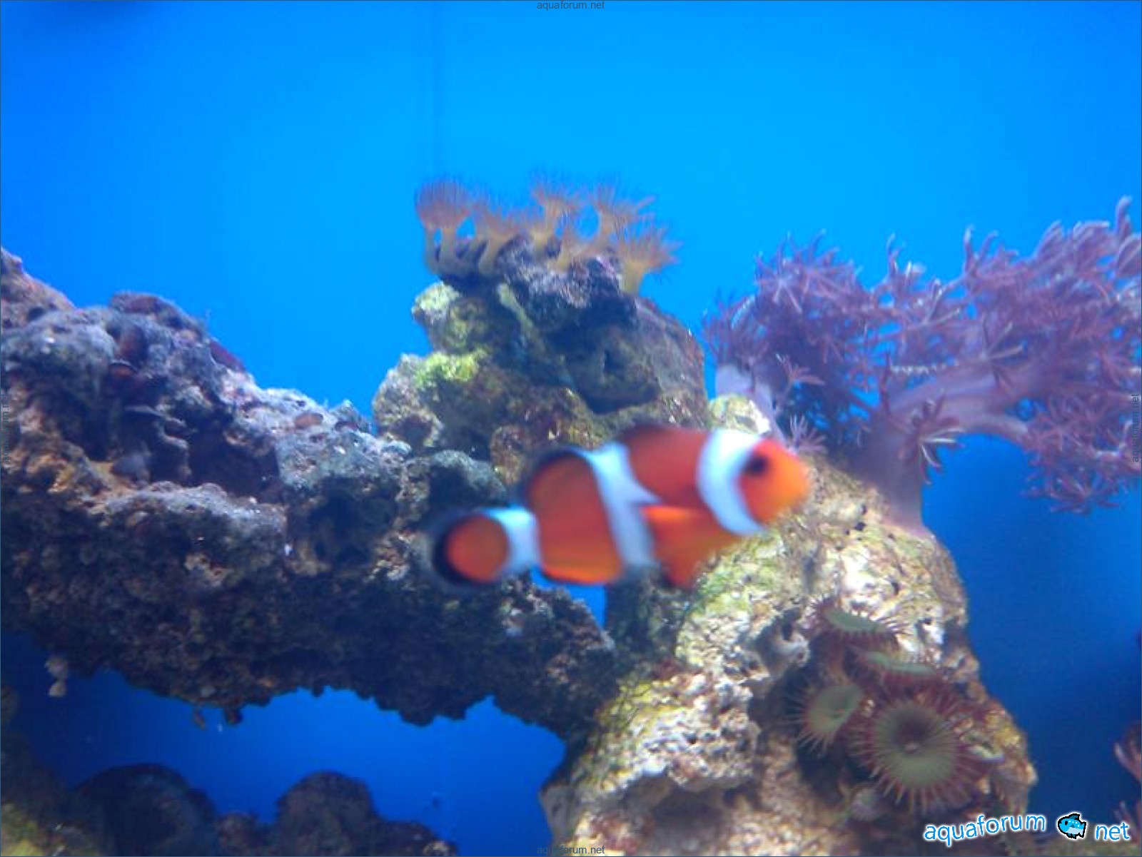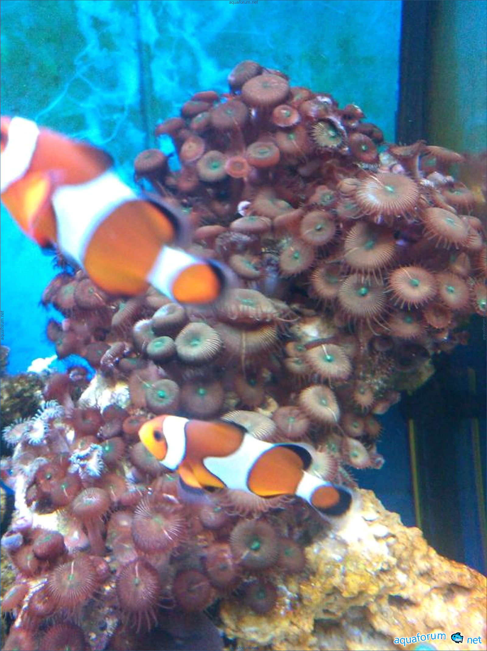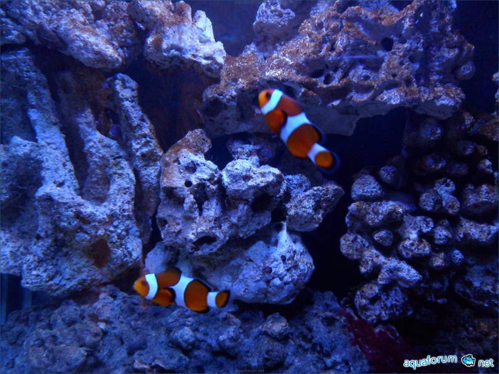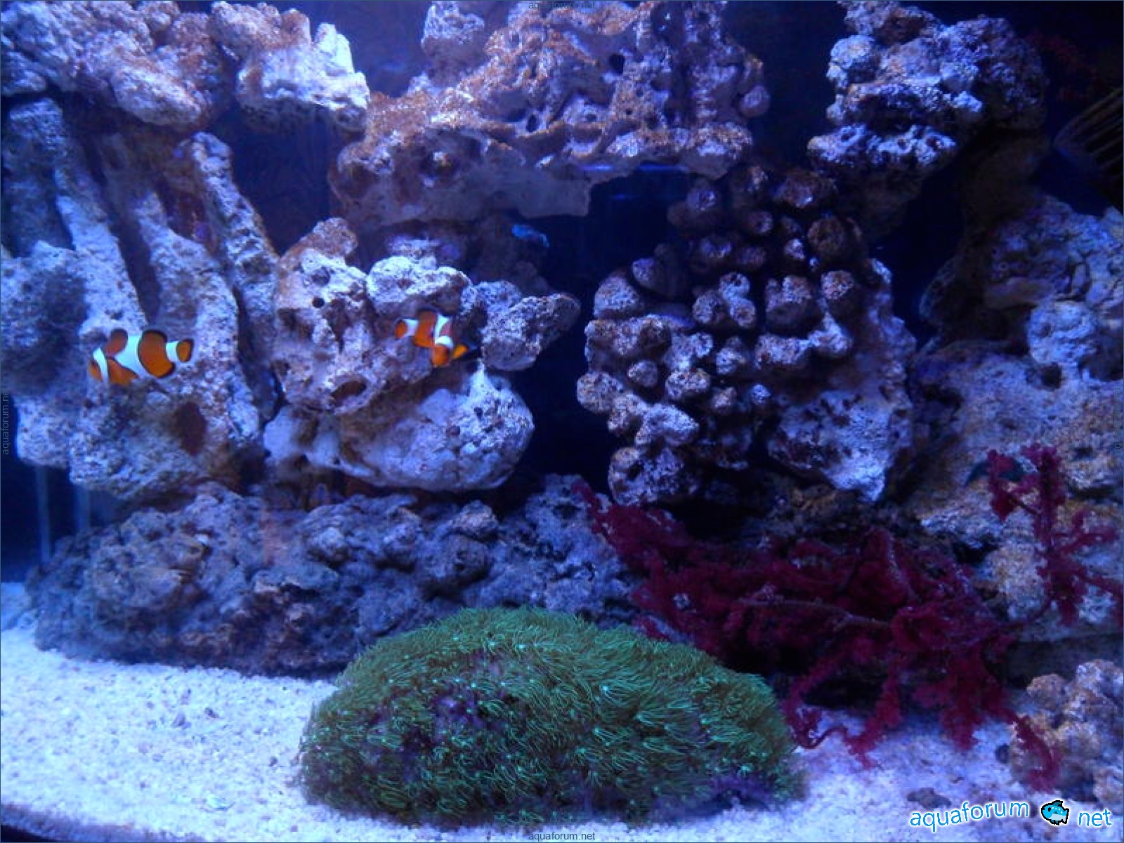 из живности-два клоуна,рыба-игла,две креветки палемоны,три рака отшельника,две конские актинии и камушек обросший бриареомом-на фото еще не раскрытый.Ну пока вот так как то.