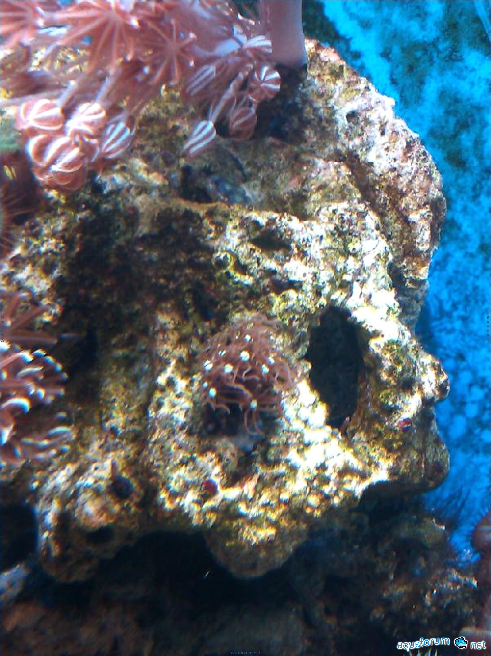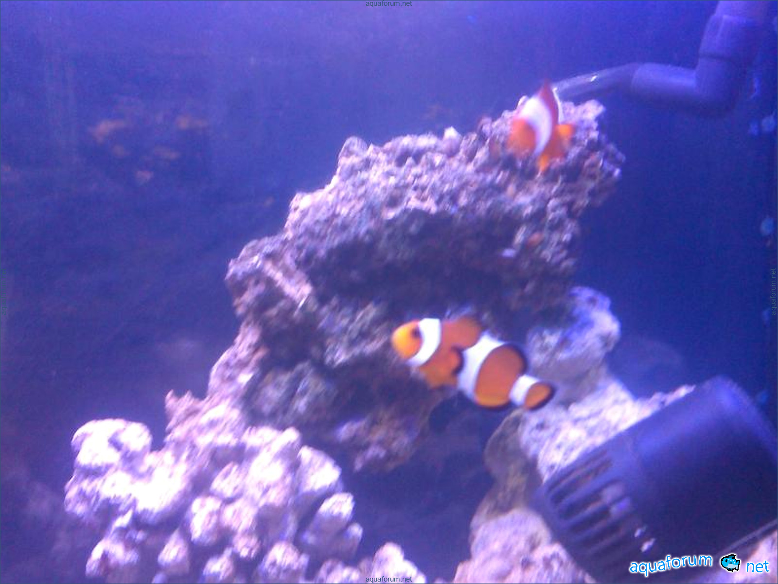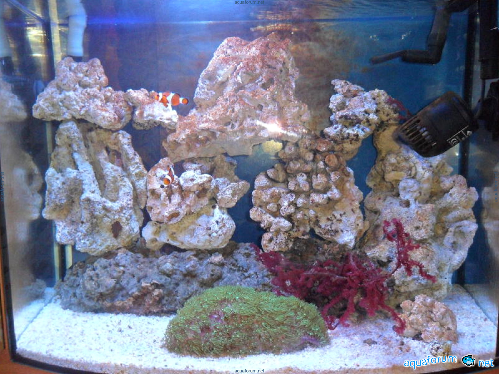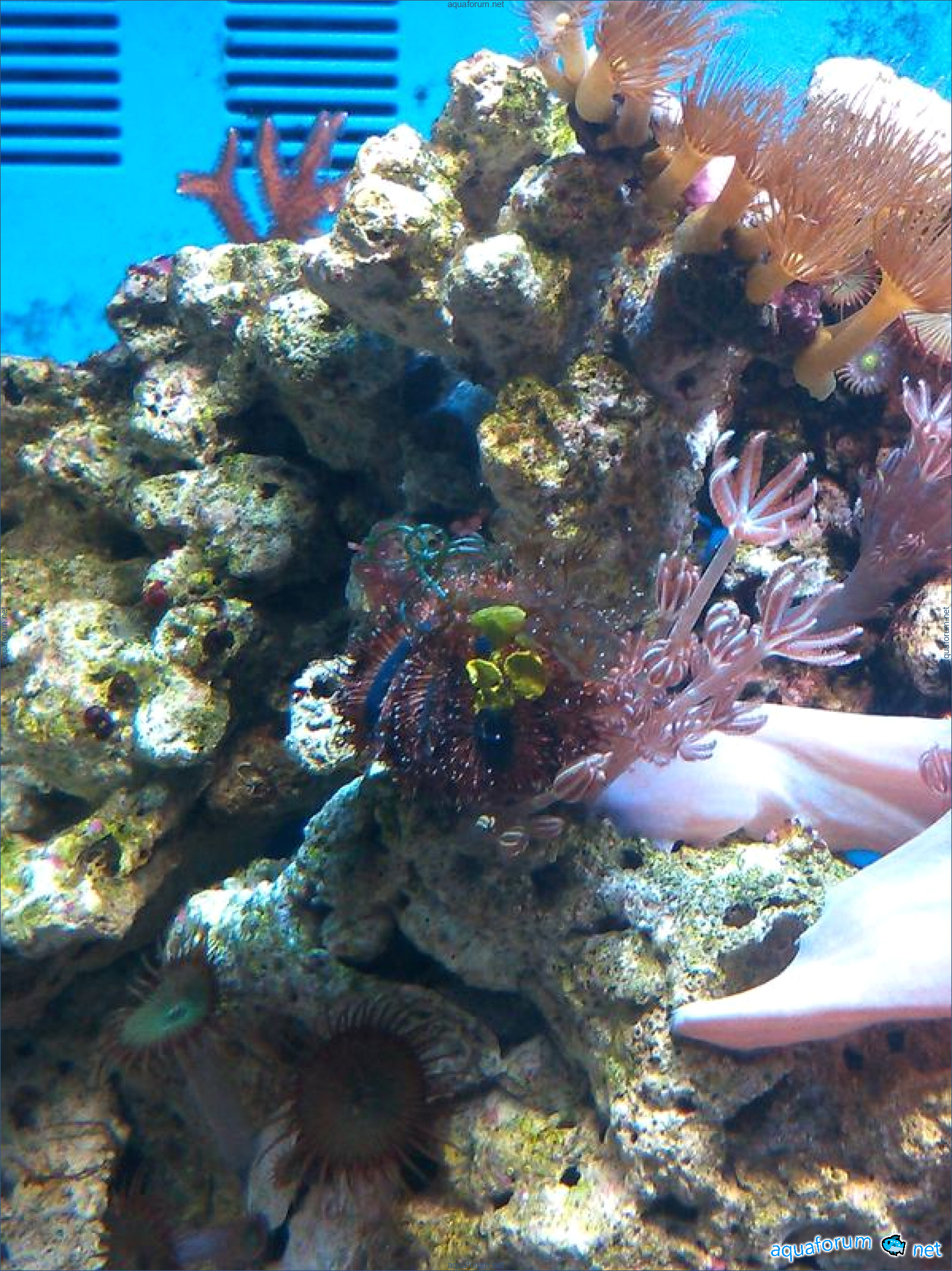 из живности-два клоуна,рыба-игла,две креветки палемоны,три рака отшельника,две конские актинии и камушек обросший бриареомом-на фото еще не раскрытый.Ну пока вот так как то.