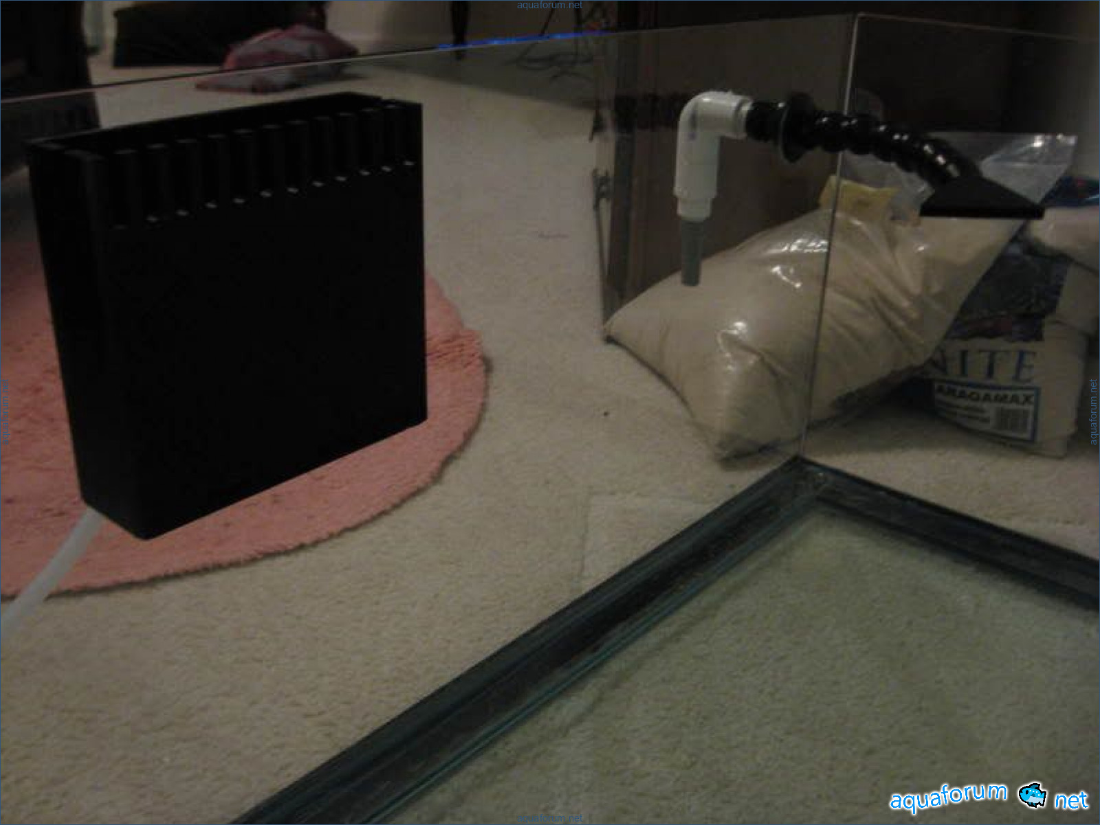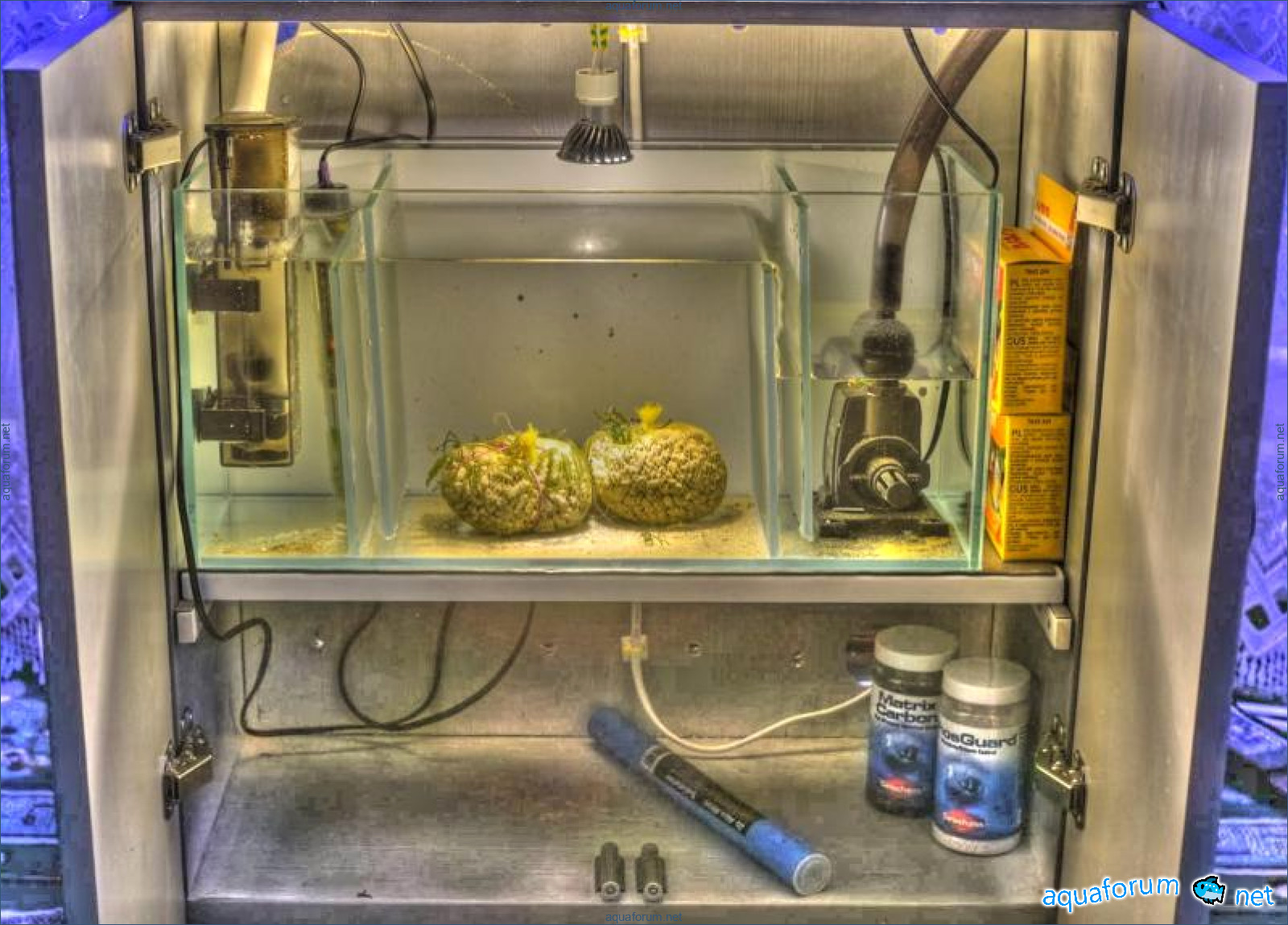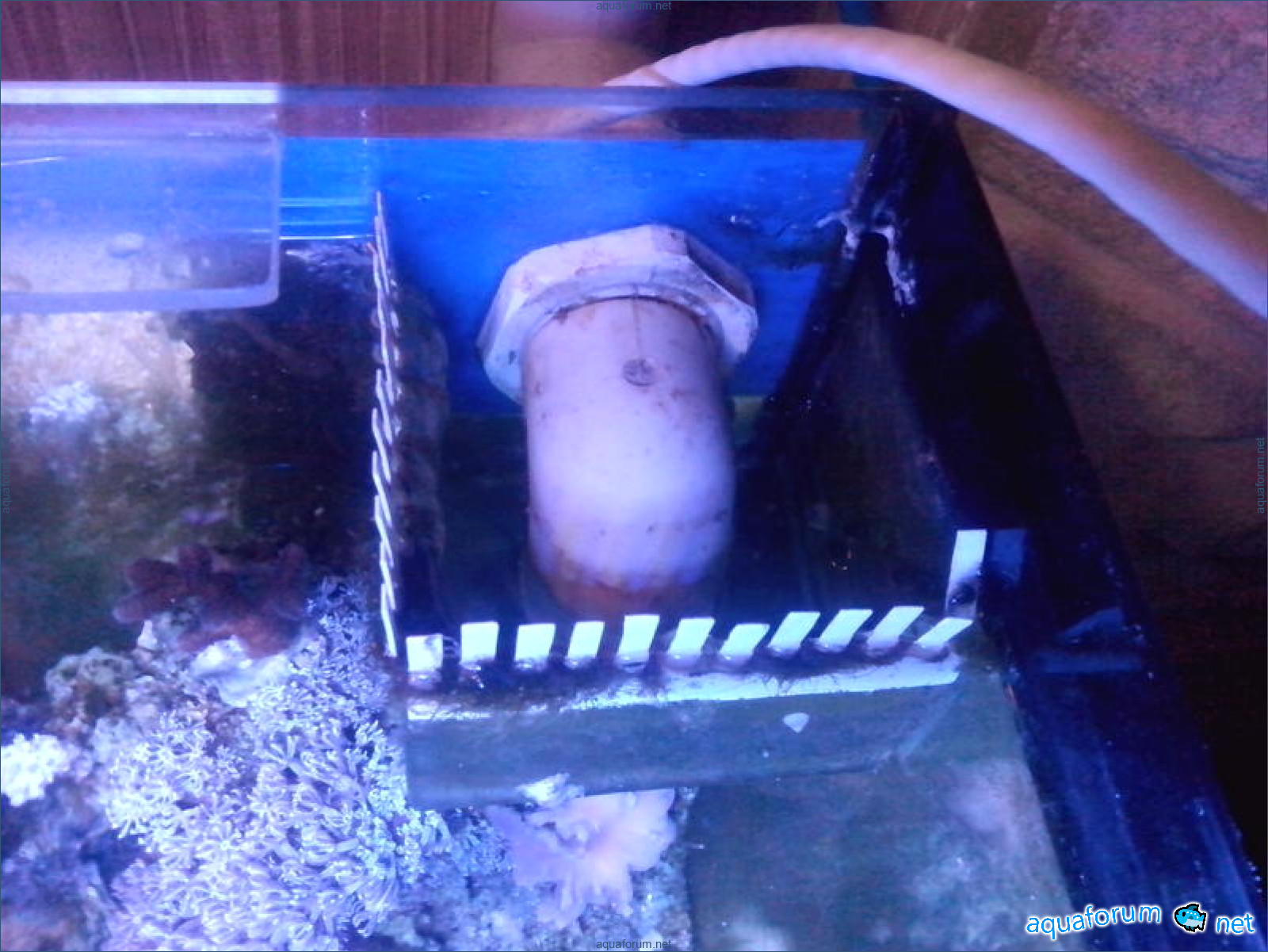 сделал по нарисованному домик из акрила. В чем была основная мысль? В отсутствии подмен: отсадник вешается на основной аквариум, в него запихивается выходная трубка фильтра-канистры из основного аквариума, а сливается вода самотеком, потому как все сделано по принципу навесного фильтра. Конструкция предполагает еще и круговое течение. Казалось бы, идеал. Ага. Но не для сексуальных лярв, простите мой французский. Живой домик для смертных личинок: