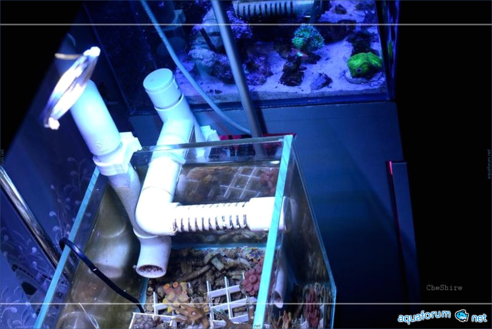 Но мне ведь мало просто карусельки, мне ведь подмены делать глубоко лень. Поэтому аквариум-каруселька подручными средствами был поднят до верхнего уровня основного аквариума, из каких-то труб из Новой Линии сделана конструкция буквой «П» и одета на боковые стенки двух аквариумов. Мы получили сообщающиеся сосуды. Чтобы труба между аквариумами не завоздушивалась, в самый ее верх вставлена трубочка, которая используется в качестве воздухозаборной для мелкой помпы. Пока помпа работает, лишний воздух всегда из трубы будет откачиваться, а значит уровень в аквариумах будет одинаковым. Теперь в основной аквариум ставится еще одна мелкая помпа, на нее трубка до карусельки, на трубку – дождевалка, запускающая карусель. И вуаля. Ни подмен, ни головной боли. Механика в динамике в видео ниже: